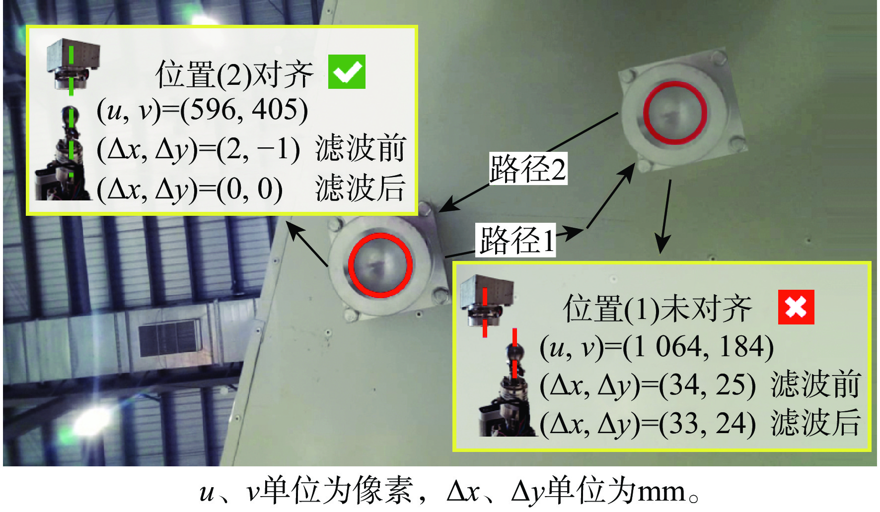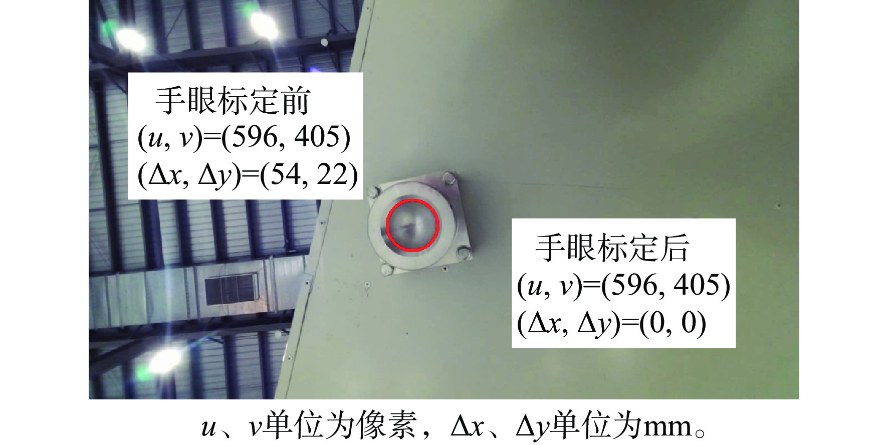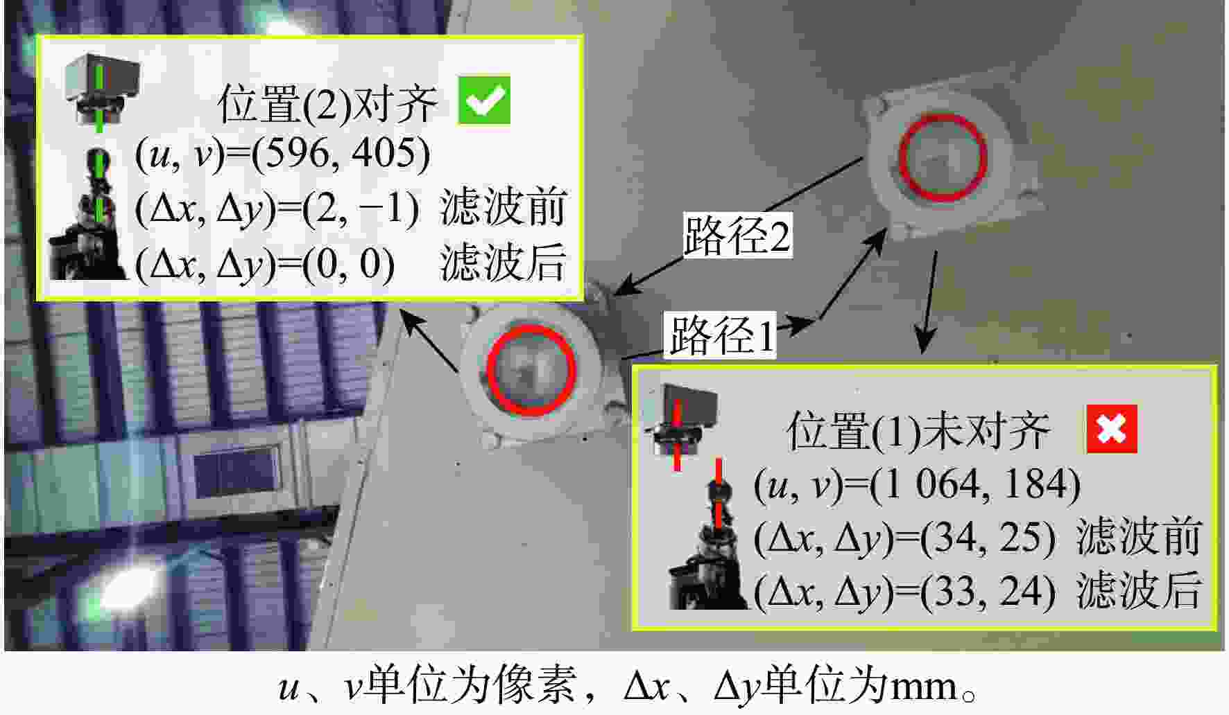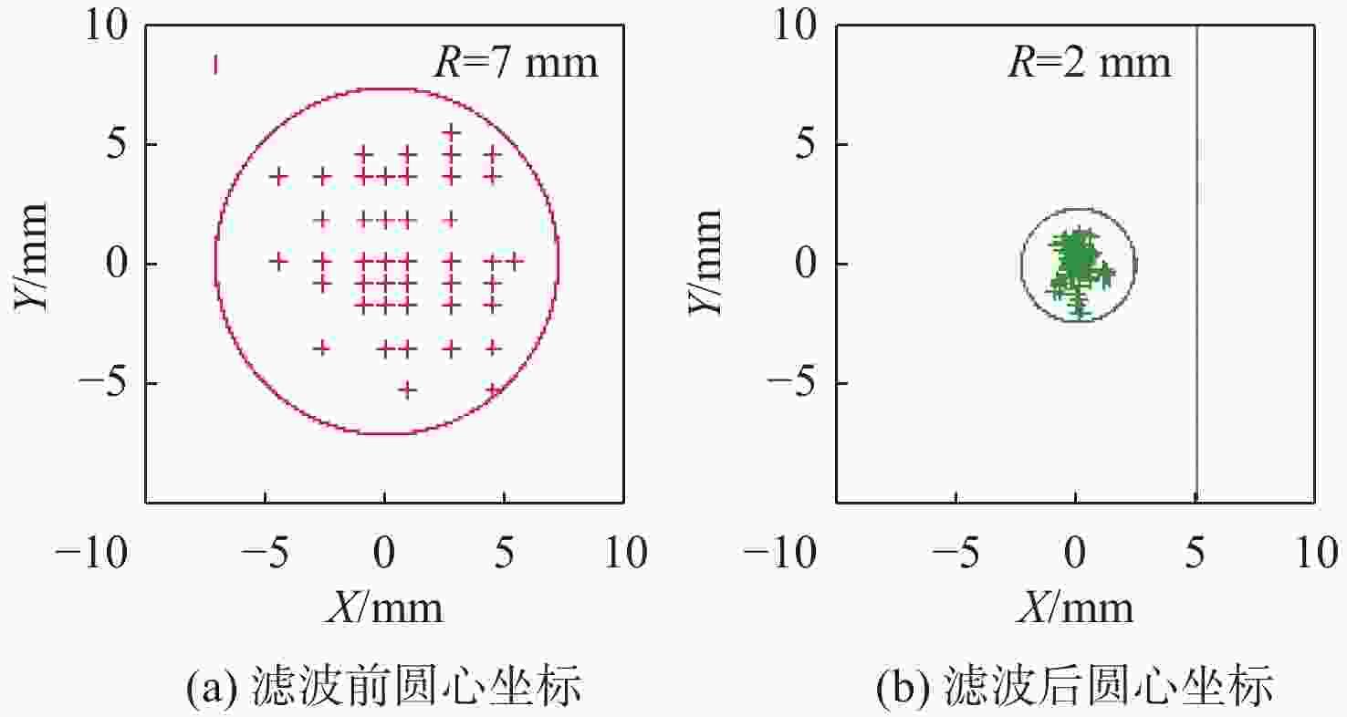 坐标$ ({x_i},{y_i}) $/mm偏差${e_1}$/mm 1 (53,23) (933.87,4 046.29) 0.908 2 (54,22) (933.84,4 046.37) 0.859 3 (55,22) (932.9,4 046.29) 0.279 4 (54,22) (934.9,4 046.31) 1.915 5 (53,23) (933.9,4 046.29) 0.937 6 (53,23) (932.91,4 046.29) 0.275 7 (54,24) (933.95,4 046.30) 0.982 8 (54,23) (932.91,4 046.44) 0.142 9 (54,23) (933.96,4 046.31) 0.990 10 (54,23) (933.96,4 046.29) 0.995 注:${e_1}$均值为0.828 mm,${e_1} $标准差为0.512 mm,${e_1} $方差为0.262 mm。 -