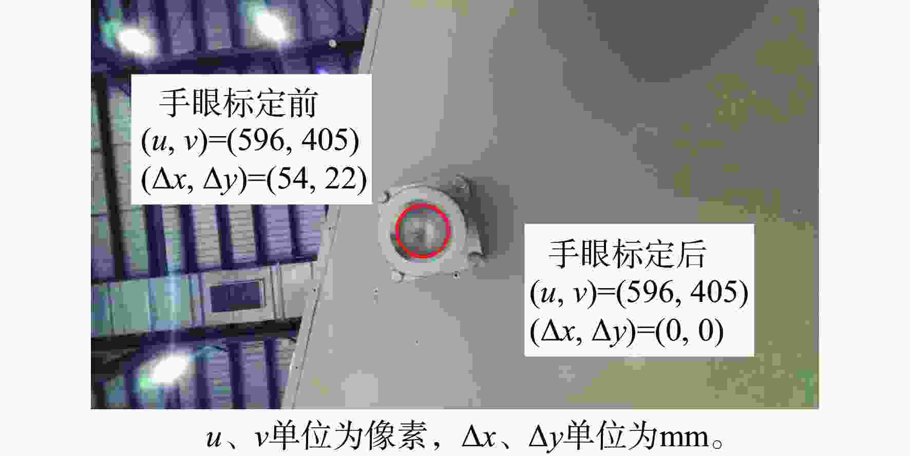模型 P R mAP0.5:0.95/% 参数量 帧率/(帧·s−1) YOLOv7-tiny 1 1 92.9 6.01×106 250 YOLOX-s 1 1 95.1 8.97×106 20 YOLOv5-s 1 1 93.4 7.23×106 30 本文 1 1 95.4 7.32×106 30 表 3 不同模型手眼标定结果