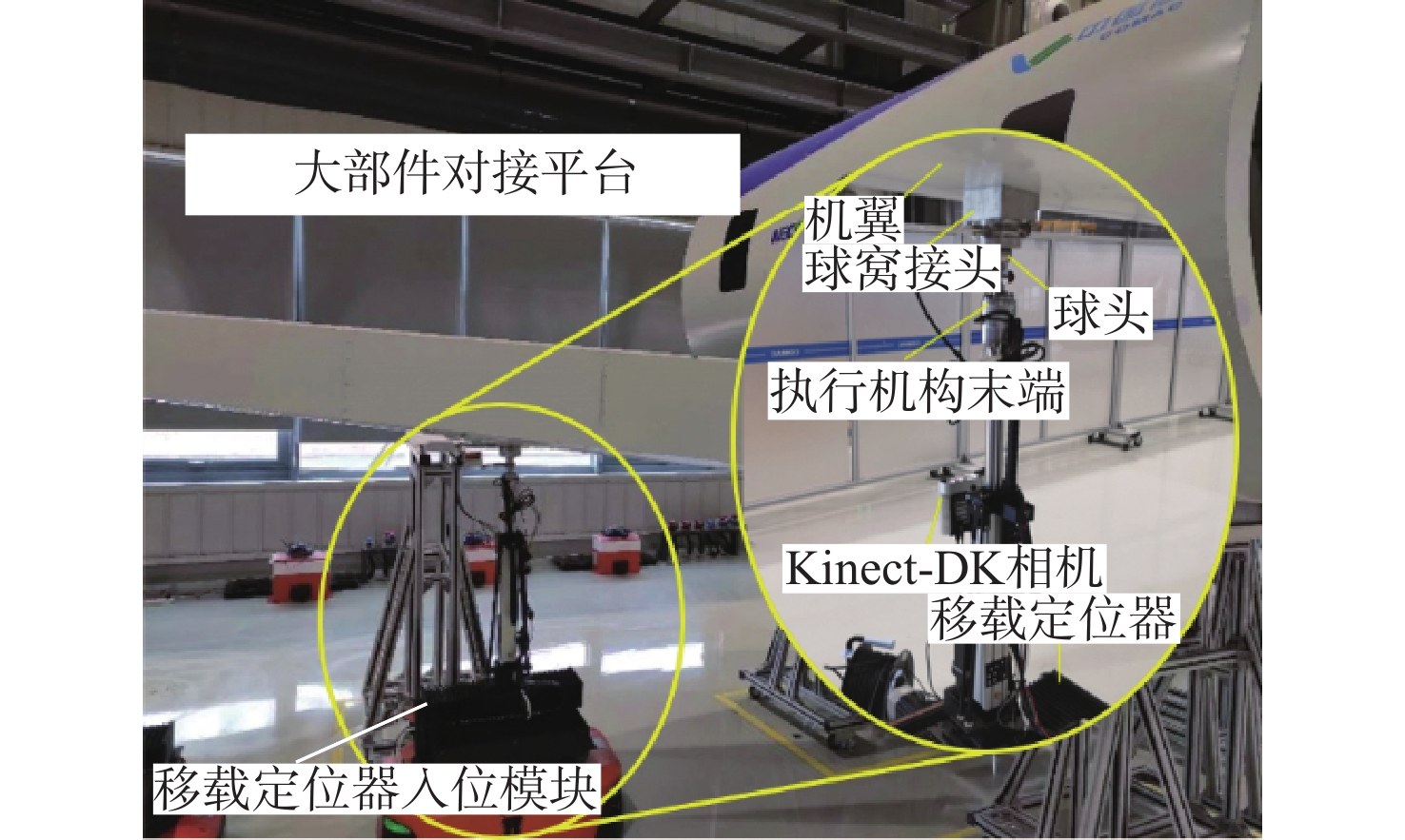 大部件对接是飞机装配的重要一环。在大部件对接前,需要将移载定位器球头插入部件上的支撑球窝接头。目前移载定位器末端球头插入球窝主要通过人工引导,定位器入位误差大、效率低,且仍存在一定安全风险。提出了一种基于视觉引导的移载式定位器入位方法。为了获取球窝位置,使用YOLO-v5s模型实现了球窝接头目标检测并对模型做出了改进:在主干网络与颈部网络之间加入CA注意力机制模块,将加权双向特征金字塔网络(Bi-FPN)作为颈部网络,使用Grad-CAM技术对模型运行过程进行了可视化,结果表明:改进后YOLO-v5s模型的mAP0.5:0.95增长了2%,改进后模型精确度保持在99.5%以上,帧率可达到30。通过手眼标定技术统一坐标系,设计了融合随机采样一致性(RANSAC)算法的线性模型用于求解变换矩阵,与传统手眼标定算法相比精度提高了22.0%~77.2%。基于大部件移载对接实验平台,开展了移载定位器视觉引导入位实验,实验结果表明:入位引导误差在1 mm以内,满足大部件对接移载定位器引导入位的精度要求。