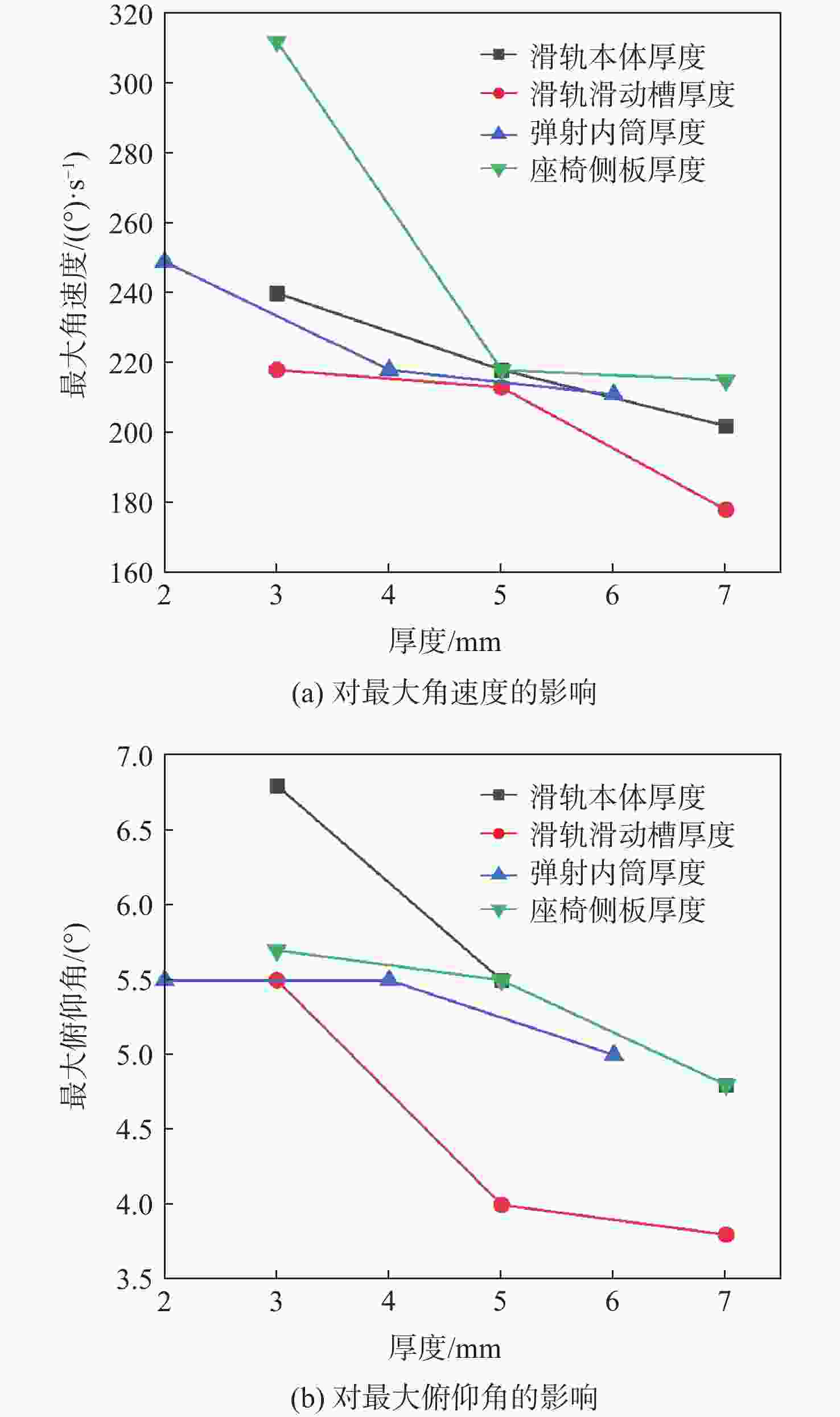为了研究弹射座椅的出舱稳定性,以某弹射座椅为对象,建立包括椅盆组件、伞箱组件及弹射装置的弹射座椅的细致有限元模型,并通过耦合假人模型建立人椅系统模型;开展人椅系统的弹射出舱试验,得到弹射姿态、座椅加速度、座椅角速度及俯仰角等试验结果,基于这些数据对人椅系统仿真模型进行试验验证,结果表明,模型具有较高的精度;进一步从座椅关键组件的厚度、滑块的布置形式及限腿带力3个方面进行人椅系统出舱稳定性的影响因素分析,结果表明,滑轨滑动槽的厚度、滑轨本体厚度、座椅侧板厚度、滑块布置形式、限腿带力作用时间对出舱稳定性影响较明显,而弹射内筒的厚度和限腿带力的大小对出舱稳定性影响较小。研究结果为高稳定性弹射座椅的设计提供了依据。