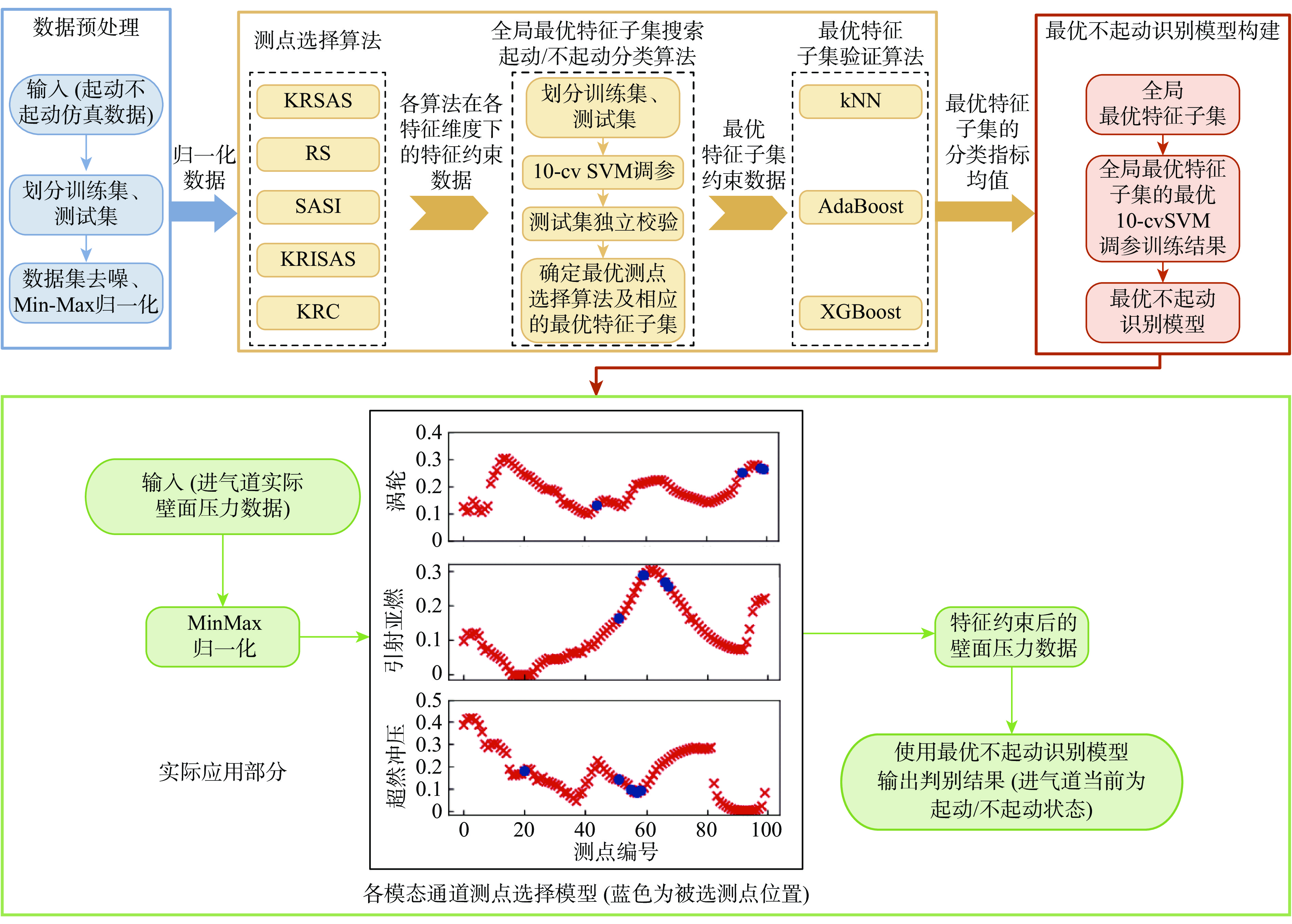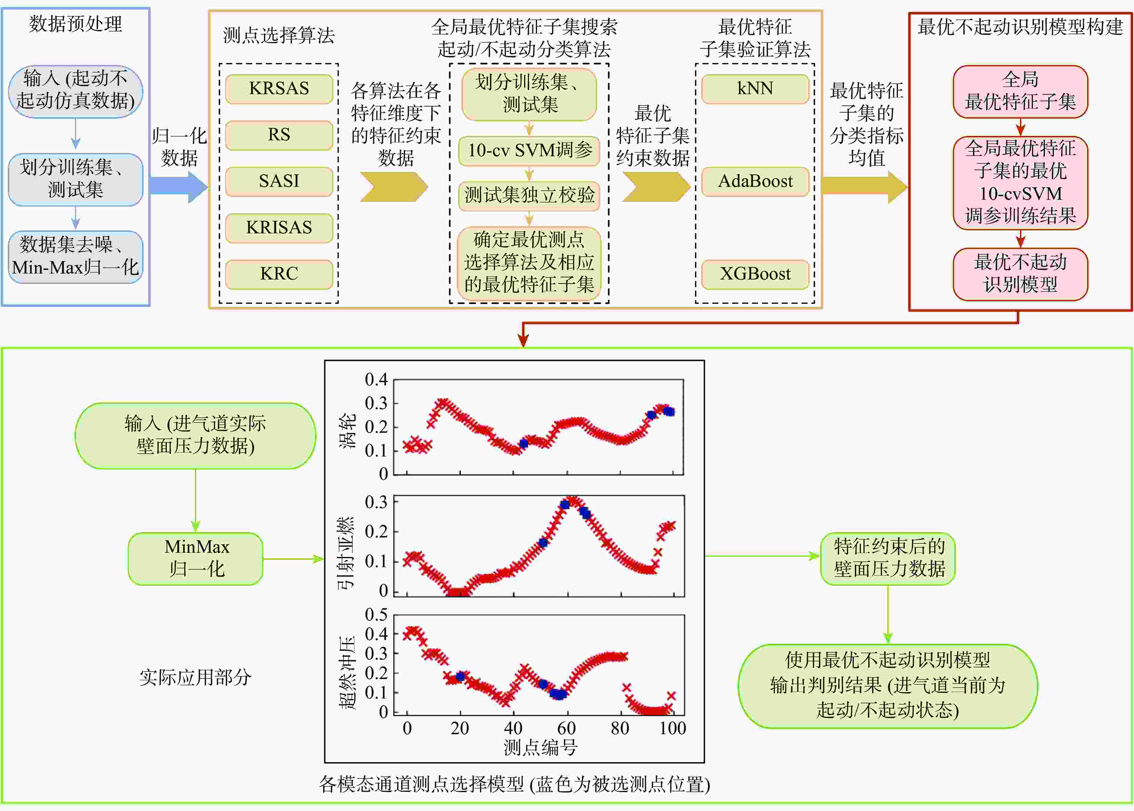 k -均值聚类与ReliefF相结合的算法,在解决原数据集起动/不起动类别不平衡的同时充分考虑了联合特征对的权重信息;为兼顾特征权重和全局分类精度,提出了一种引入模拟退火策略的改进支持向量机递归特征消除算法。将二者进行组合式设计,先采用KMMS-ReliefF算法快速剔除不相关测点,在剩余测点子集中通过SA-SVMRFE算法删除冗余测点,并与其他4种组合算法进行对比。实验结果表明:所提组合算法在最优特征子集维度上明显低于其他算法,利用十折交叉验证支持向量机(10-cv SVM)训练的不起动识别模型,在各模态通道测试集的平均分类准确率均达到99%以上,且具备较高运行效率。此外,通过k最近邻(kNN)、AdaBoost等其他分类算法验证了最优测点组合的可靠性。Abstract:Inlet unstart state can seriously affect the normal operation of hypersonic engines. Based on the pattern classification method of steady state pressure information, a hypersonic three-dimensional internal rotary combined inlet is taken as the research object to solve the unstart state recognition problem by extracting the key reliable wall pressure measurement points and constructing a high-accuracy classification model. Firstly, a number of along-track wall pressure data are obtained for several start/unstart states by numerical simulation, under different Mach numbers and back pressure conditions. Secondly, an algorithm integrating ReliefF (KMMS-ReliefF) and k-means clustering is proposed for the construction of the measurement points selection methods; this algorithm solves the imbalance of start/unstart categories of the dataset while completely considering the weight information of the joint feature pairs. Besides, in order to take into account the feature weights and the global classification accuracy, an improved SVM Recursive Feature Elimination Algorithm with simulated annealing strategy is proposed (SA-SVMRFE). Finally, the two algorithms are combined into a two-stage algorithm (KRSAS). A significant number of unnecessary measurement points are swiftly eliminated from the original dataset in the first stage using the KMMS-ReliefF algorithm. In the second stage, the SA-SVMRFE algorithm eliminates the redundant measurement points from the remaining subset of points. Then the comparison is made with the other four combined algorithms. The experimental results show that the combinatorial algorithm proposed in this paper is significantly lower than other algorithms in terms of optimal feature subset dimension. The unstart recognition model trained by 10-fold cross-validation SVM (10-cv SVM) has an average classification accuracy of more than 99% in the test set of each model tunnel, and has high operational efficiency. In addition, other classification algorithms such as kNN and AdaBoost are used to verify the reliability of the optimal measurement point combinations.