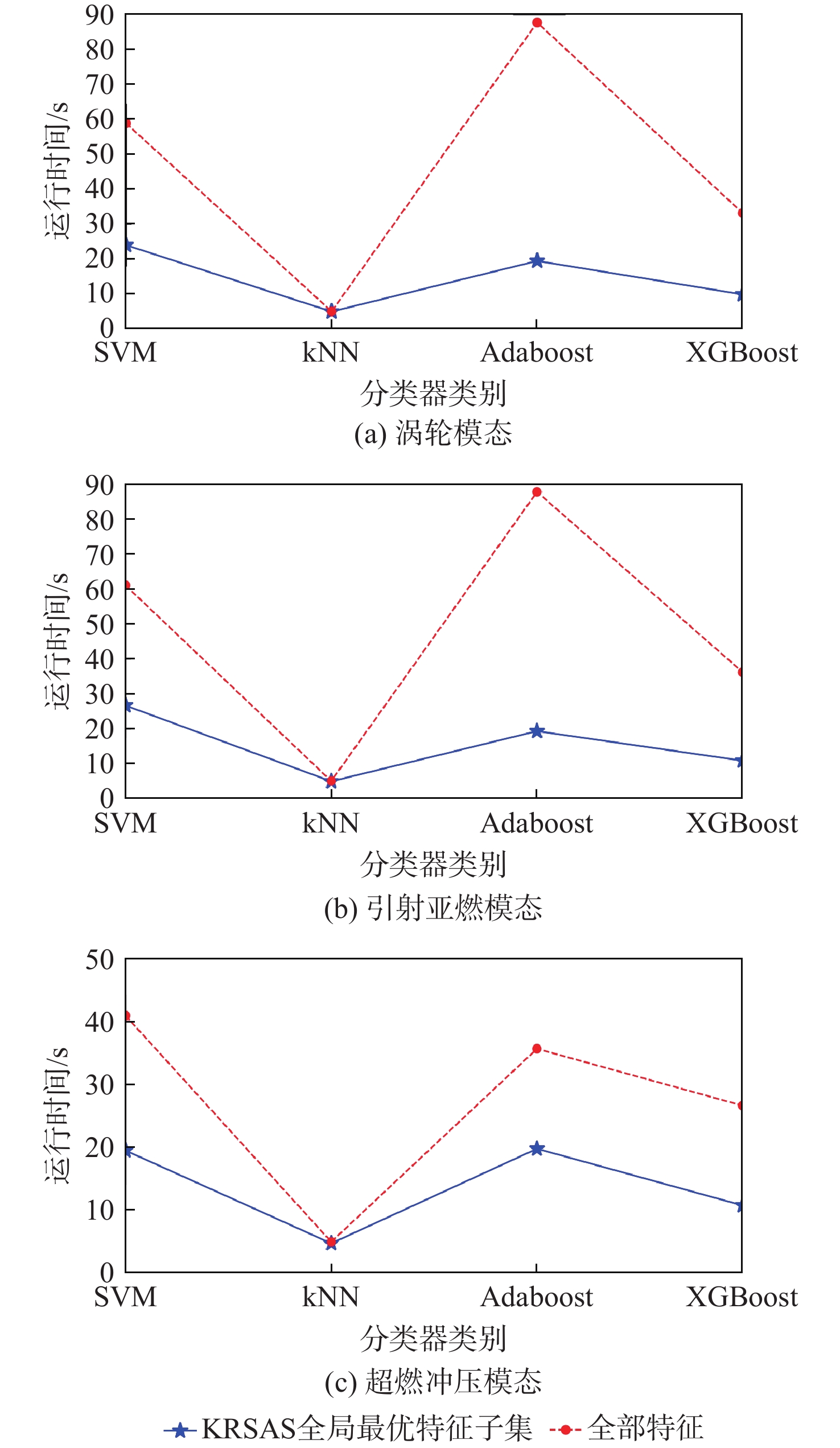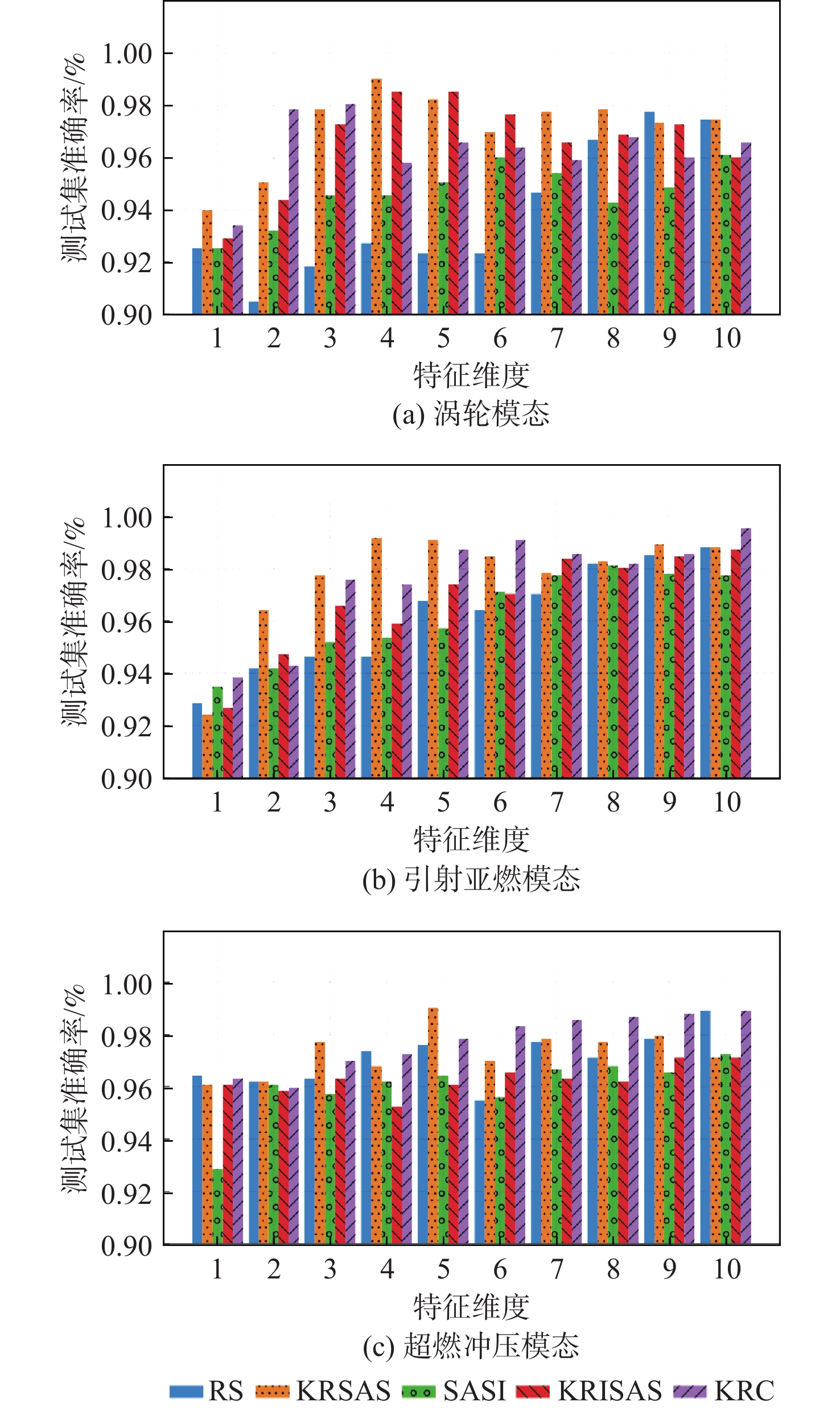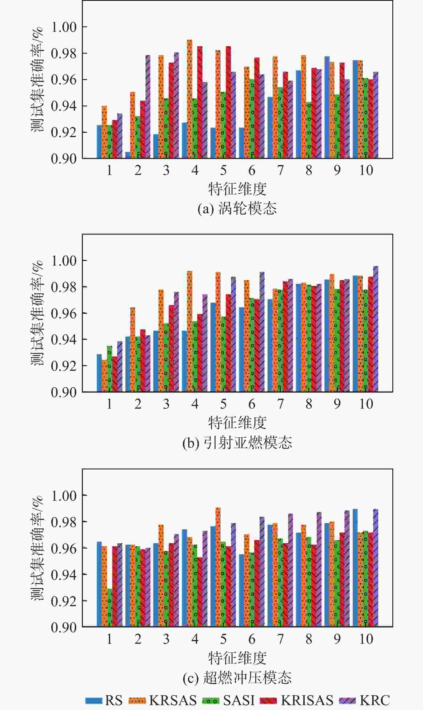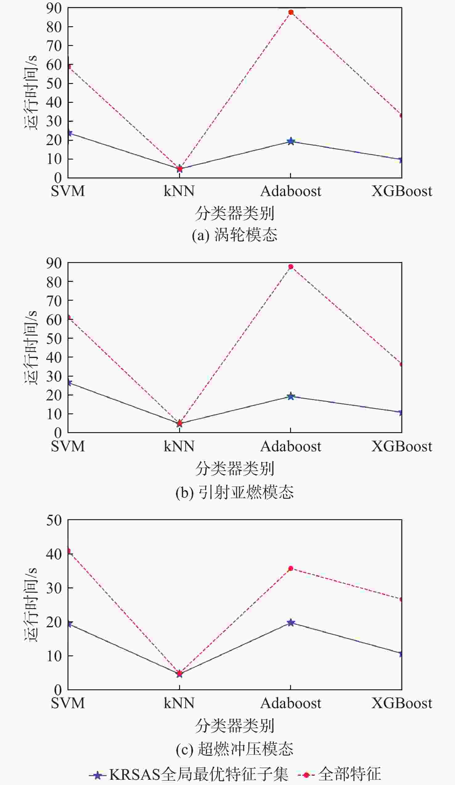 模态 算法 最优特征维度 训练集准确率 测试集准确率 F1-Score AUC 平均耗时/s 涡轮 RS 9 0.998 05 0.977 67 0.987 69 0.956 45 15.334 KRSAS 4 0.993 17 0.990 29 0.995 21 0.987 96 24.358 SASI 10 0.992 68 0.961 17 0.978 33 0.988 49 124.870 KRISAS 4 0.989 51 0.985 44 0.991 87 0.997 42 161.290 KRC 3 0.972 68 0.980 58 0.989 34 0.902 26 16.751 引射亚燃 RS 10 1.000 00 0.988 39 0.993 55 1.000 00 16.339 KRSAS 4 0.997 30 0.991 96 0.995 51 0.998 67 25.773 SASI 8 0.995 27 0.981 25 0.989 61 0.985 42 117.040 KRISAS 10 0.997 52 0.987 50 0.993 05 0.999 33 152.822 KRC 10 1.000 00 0.995 54 0.997 51 0.999 92 16.504 超燃冲压 RS 10 0.994 31 0.989 29 0.994 04 1.000 00 15.139 KRSAS 5 0.989 82 0.990 48 0.994 72 0.993 26 28.104 SASI 10 0.982 63 0.972 62 0.984 94 0.928 62 111.710 KRISAS 9 0.989 22 0.971 43 0.984 31 0.991 12 158.230 KRC 10 0.991 92 0.989 29 0.994 11 1.000 00 16.651 表 4 各算法在最优特征维度下的最优特征子集