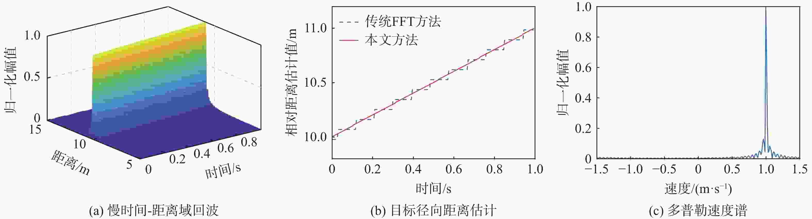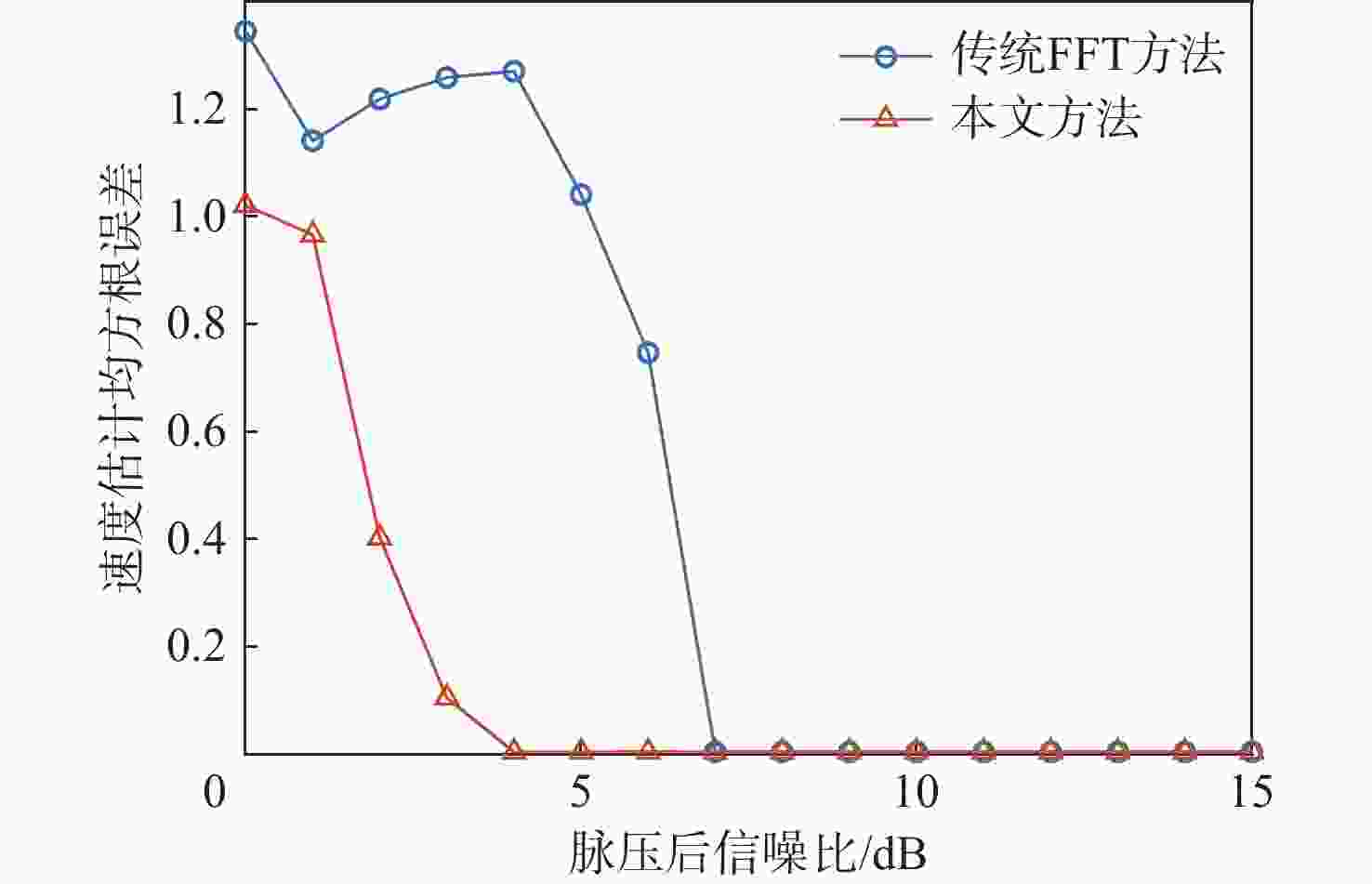 参数 数值 载波频率fc /GHz 10 脉宽τp/μs 5 带宽B/GHz 1 脉冲重复间隔Tp/s 1/200 采样率fs/MHz 100 表 2 传统FFT方法与本文方法在相同速度分辨率条件下的计算量对比