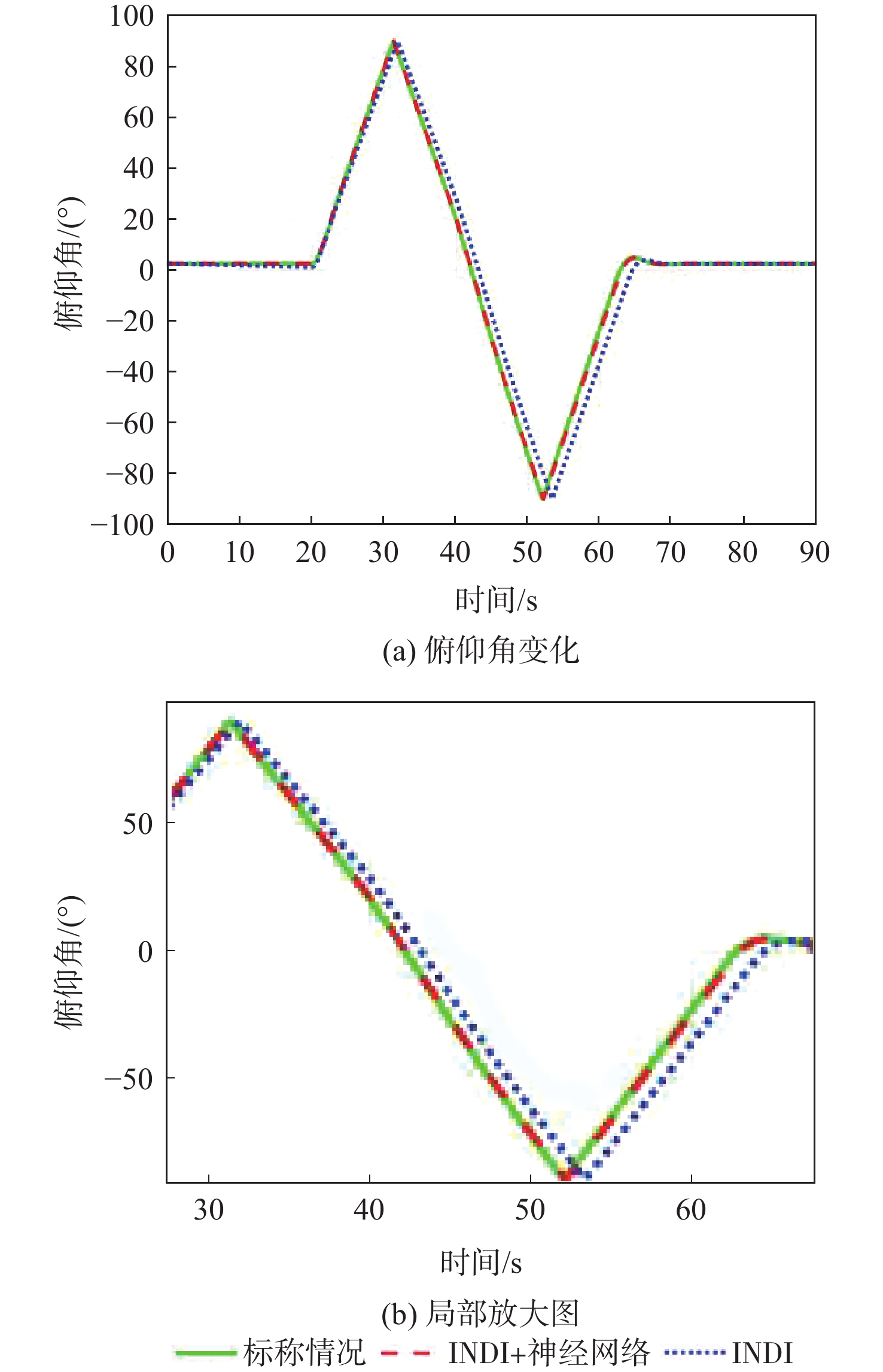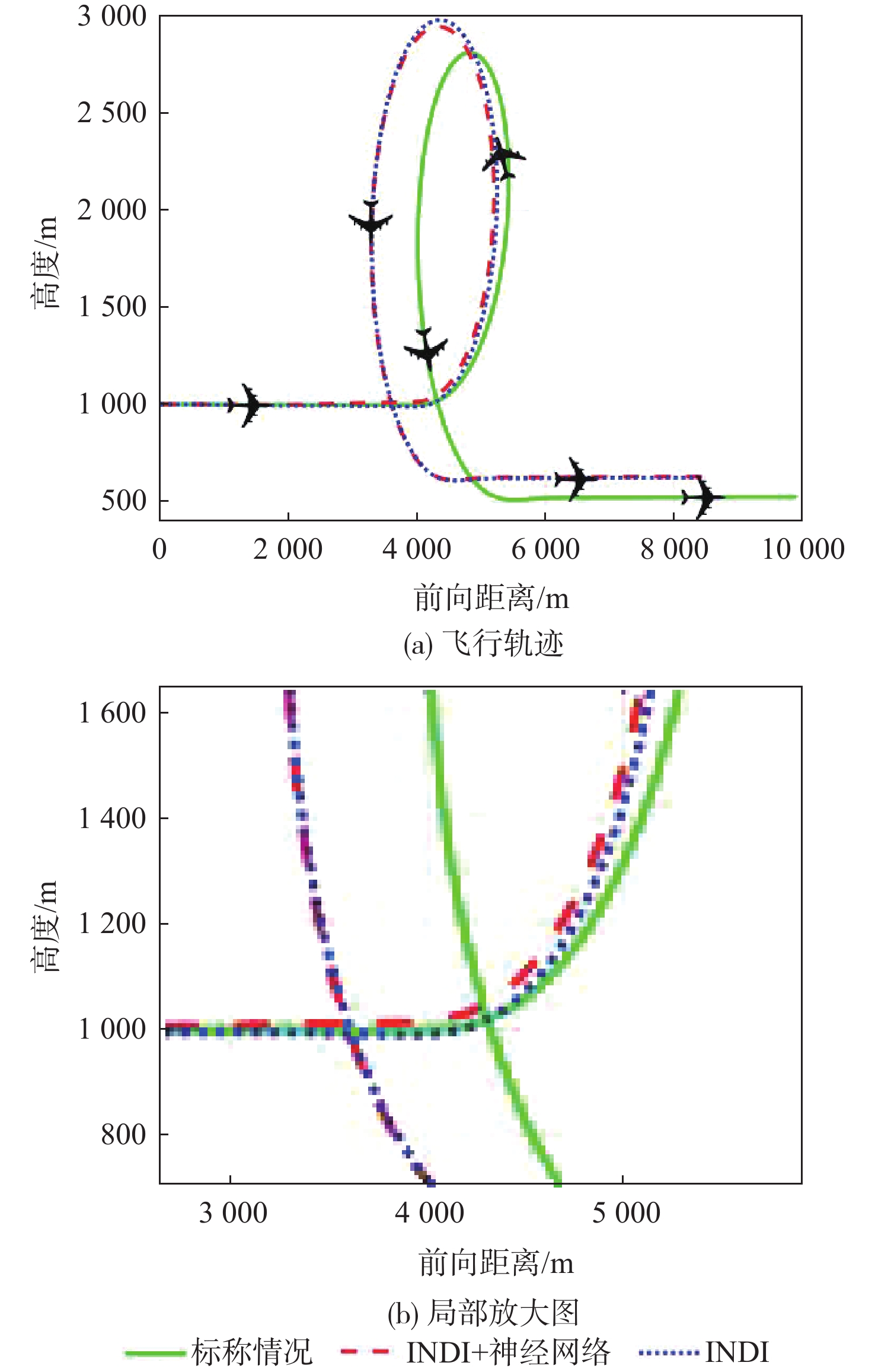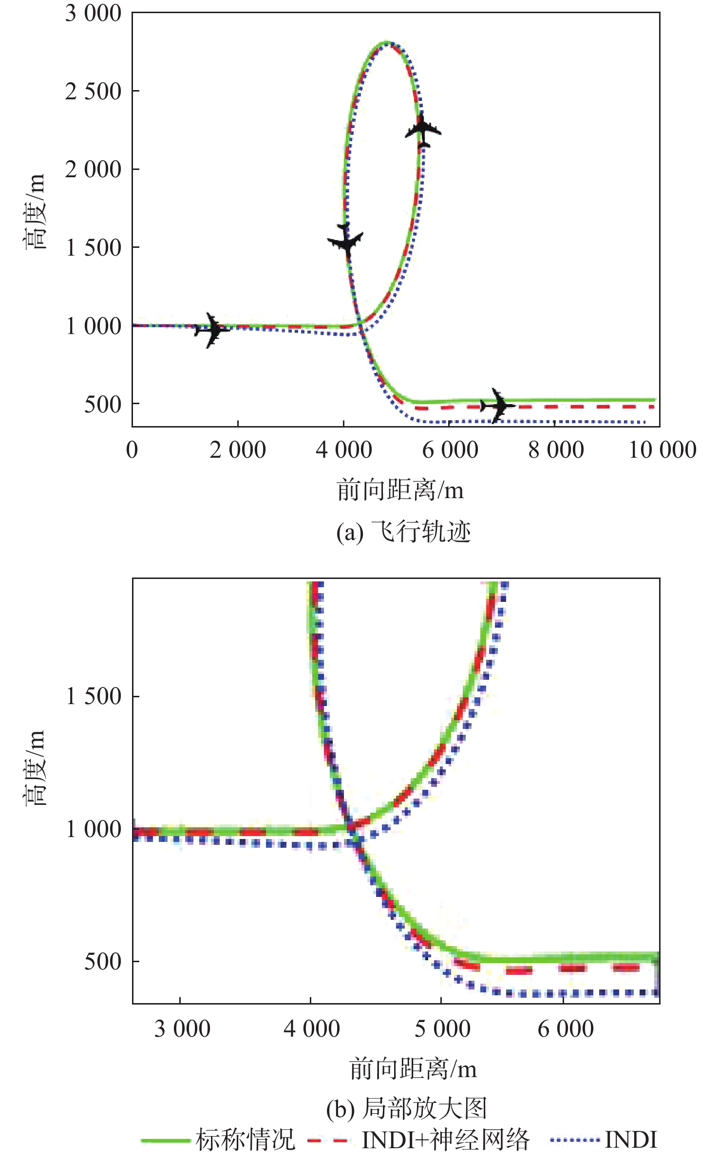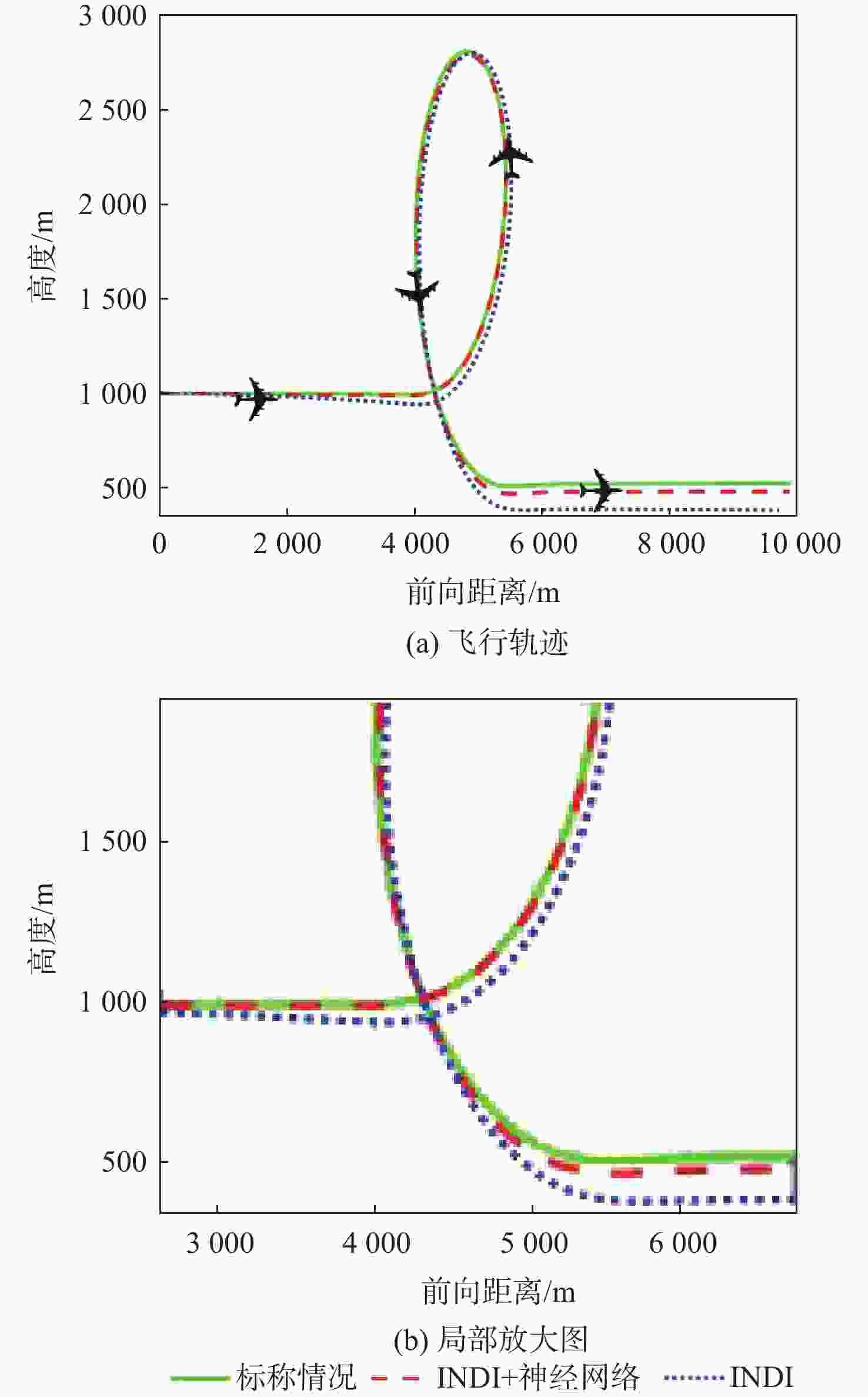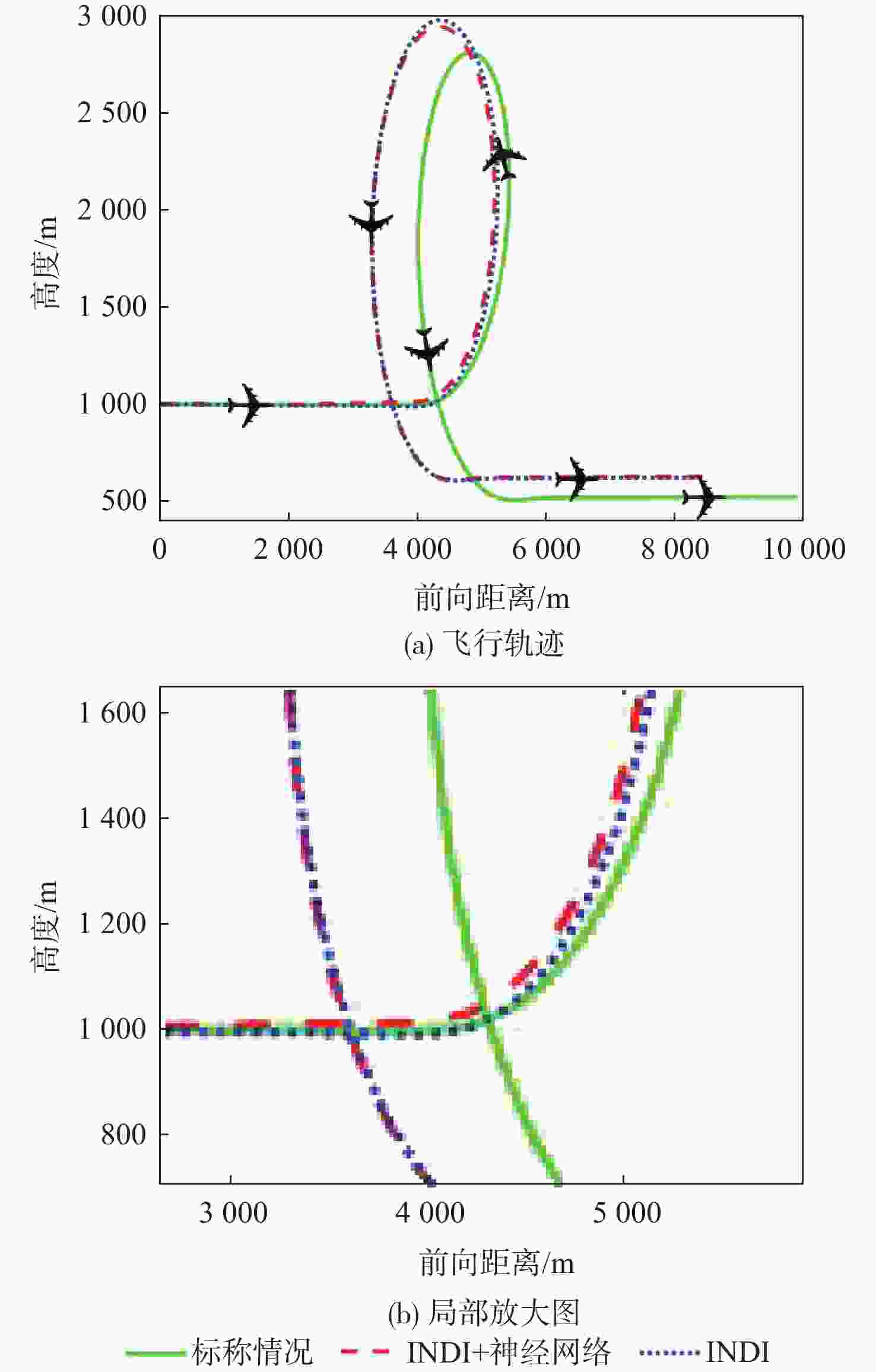 针对受外界未知气流扰动下的高速靶机在筋斗机动过程中易激发出强烈且时变的非线性气动特性问题,提出一种考虑执行器输入约束的神经网络增量非线性动态逆(INDI)控制器,通过反向传播(BP)神经网络在线补偿无人机筋斗机动飞行过程中的各种不确定扰动因素。建立基于INDI的无人机筋斗机动飞行控制框架;考虑INDI控制律抗扰动能力的不足,在该控制框架下引入神经网络在线补偿模型误差,并根据李雅普诺夫定理对系统稳定性进行分析,保证系统半全局一致且最终有界跟踪;提出一种增量式控制分配方法,以跟踪误差最小原则设计目标函数,求解满足执行器输入速率及饱和约束的舵面偏转角增量。仿真结果表明:所设计的神经网络INDI控制器可保证高速靶机在模型失配及外界扰动情况下仍快速准确地完成筋斗机动指令。