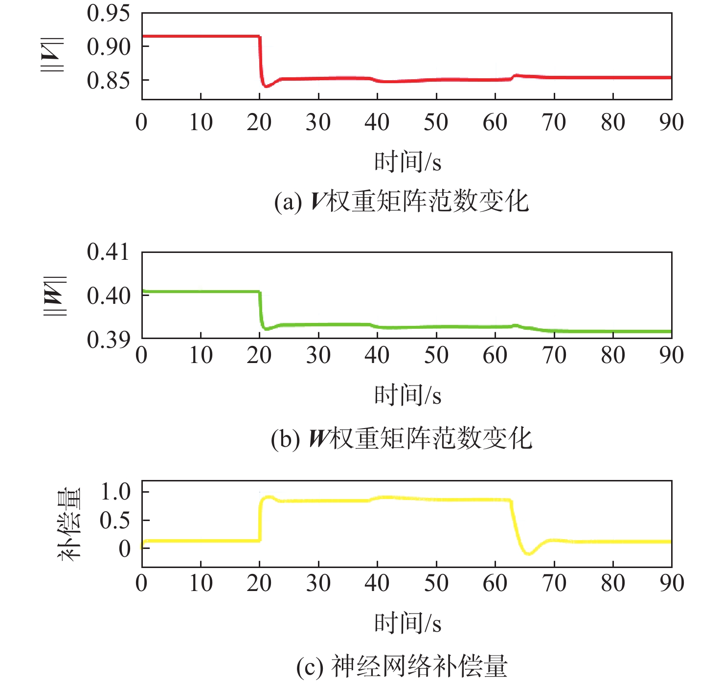 参数 数值 输入层偏置$ {b_v} $ 0.1 隐藏层偏置$ {b_w} $ 0.1 鲁棒调整项增益$ {K_{\text{r}}} $ 1 权重矩阵最值$ {\bar {{Z}}} $ 1 自适应速率因子$ {\gamma _w} $ 200 自适应速率因子$ {\gamma _v} $ 90 阻尼因子$ \lambda $ 0.5 -