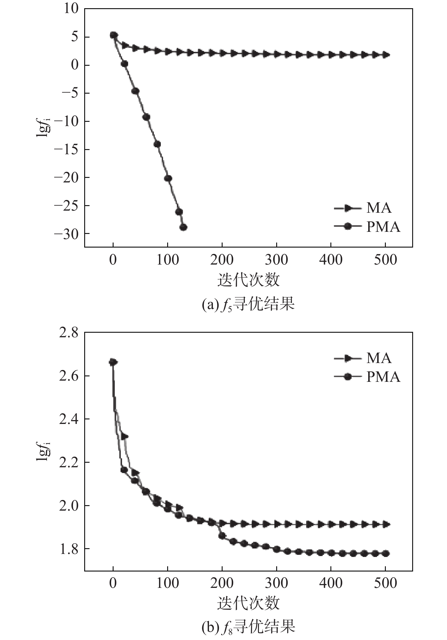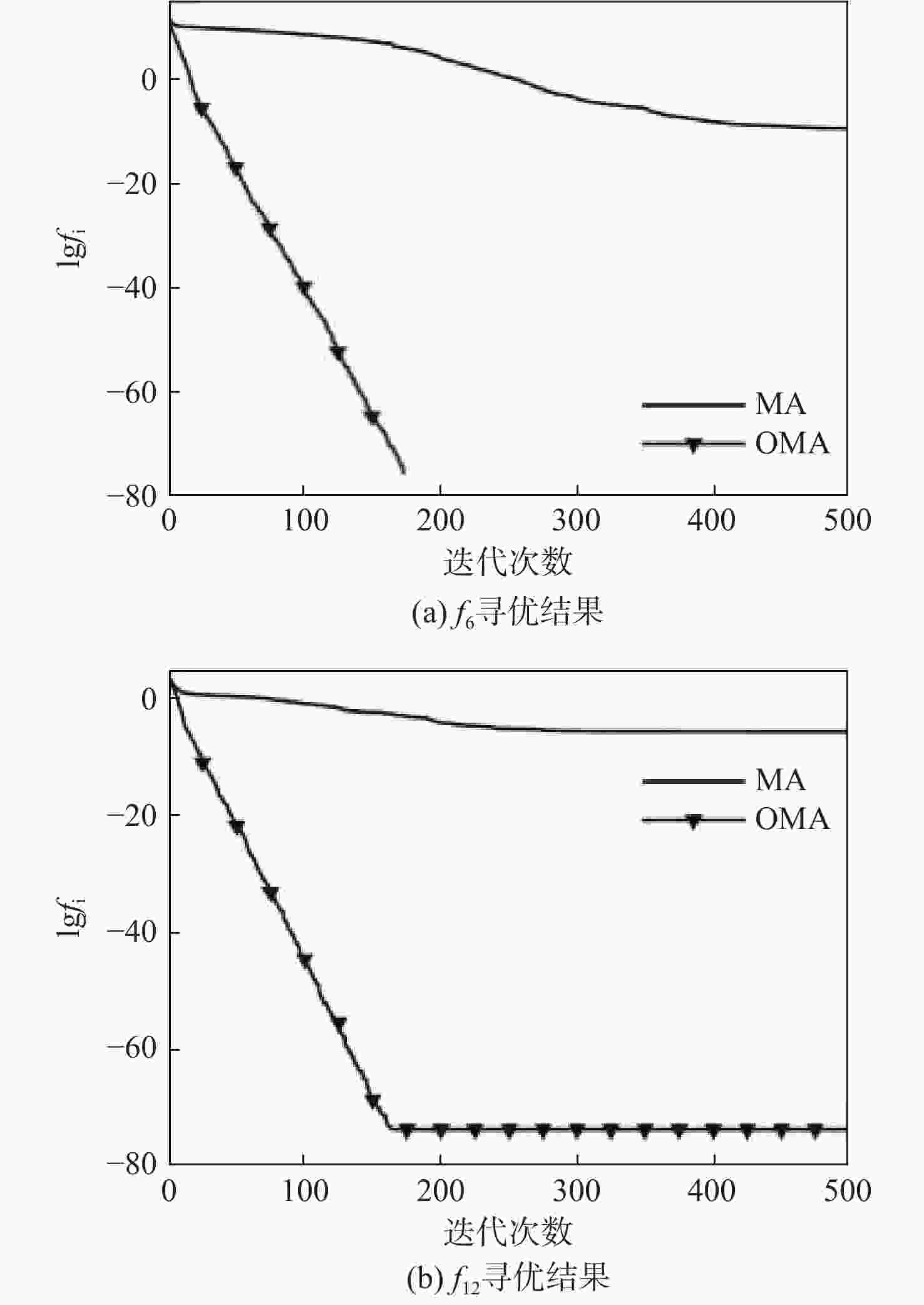 函数 平均值 标准差 对照组1 对照组2 对照组1 对照组2 LOPMA MIWMA[26] LOPMA MIMA[27] LOPMA MIMA[26] LOPMA MIMA[27] f1 3.65×10−124 1.40×10−135 2.89×10−262 1.49×10−192 2.01×10−125 6.50×10−134 0 0 f2 9.02×10−65 2.05×10−60 9.59×10−133 7.61×10−98 2.23×10−64 9.61×10−60 5.54×10−132 1.16×10−97 f3 3.73×10−129 2.55×10−113 6.81×10−268 9.82×10−64 1.37×10−128 1.70×10−112 0 4.28×10−63 f4 4.81×10−65 1.88×10−60 1.32×10−134 4.93×10−34 1.64×10−64 1.17×10−59 3.90×10−134 2.42×10−33 f7 1.65×10−5 5.62×10−5 3.59×10−3 1.25×10−4 2.44×10−6 4.08×10−5 2.64×104 1.32×10−4 f8 0 0 0 0 0 0 0 0 f9 8.88×10−16 8.88×10−16 8.88×10−16 8.88×10−16 0 0 0 0 f10 0 0 0 0 0 0 0 0 f11 6.23×10−14 6.43×10−13 1.24×10−32 2.38×10−32 4.40×10−13 6.72×10−13 4.26×10−33 5.83×10−34 表 8 CEC2017寻优结果