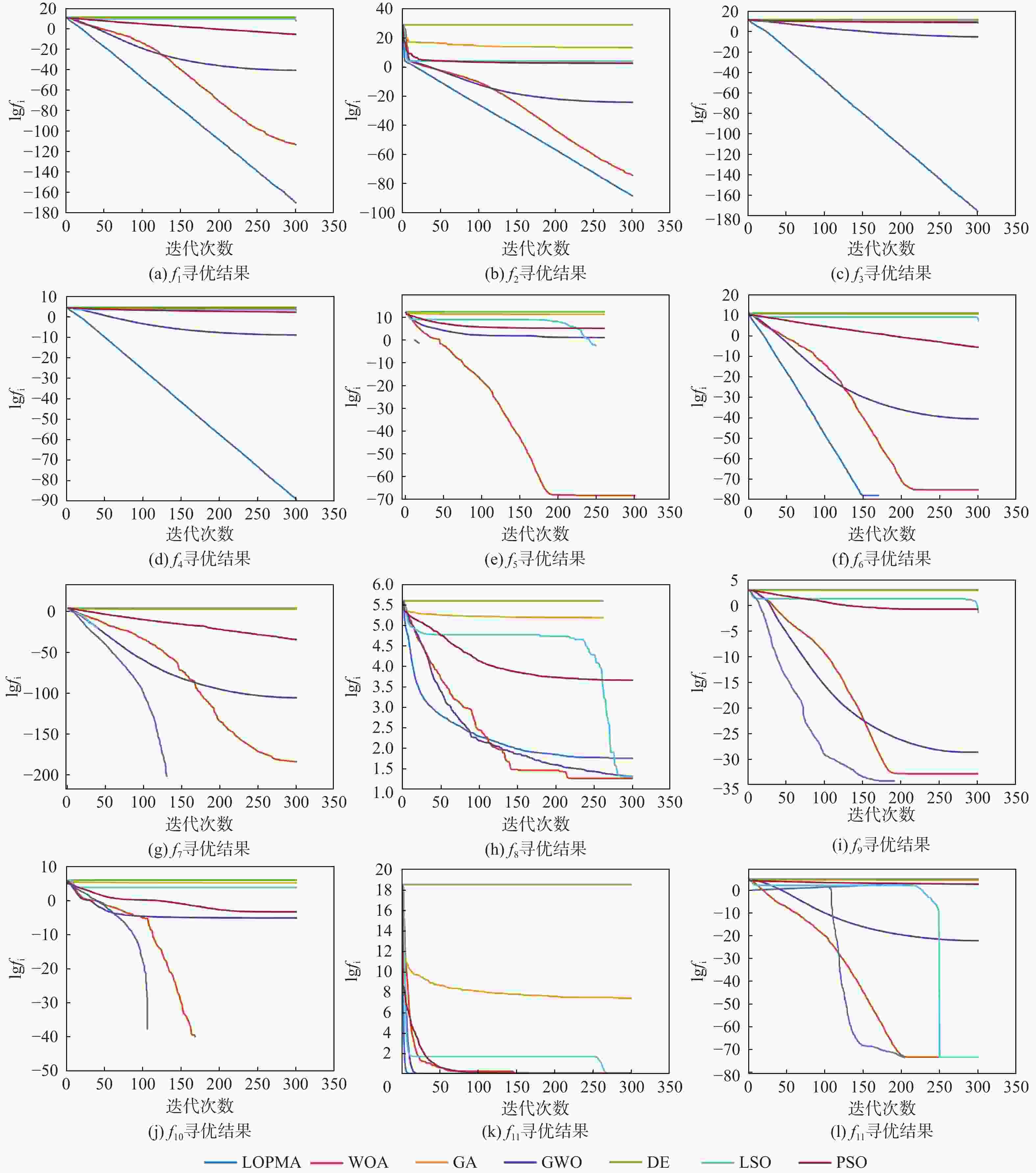 算法 参数设置 LOPMA $ \begin{aligned}& a_1=1, a_2=1.5, \beta=2, f_{\rm{l}}=1 \\& d_{\text{damp}}=0.8, f_{\text{damp}}^{{\rm{l}}}=0.99, d'=5\end{aligned} $ WOA $ a_{\max }=2, a_{\min }=0 $ GA $ p_{1}=0.9, p_{2}=0.1 $ GWO $ a_{\max }=2, a_{\min }=0, r_{1}, r_{2} \in[0,1] $ PSO $ \omega=0.9, c_{1}=c_{2}=1.5 $ 表 5 标准测试函数寻优结果