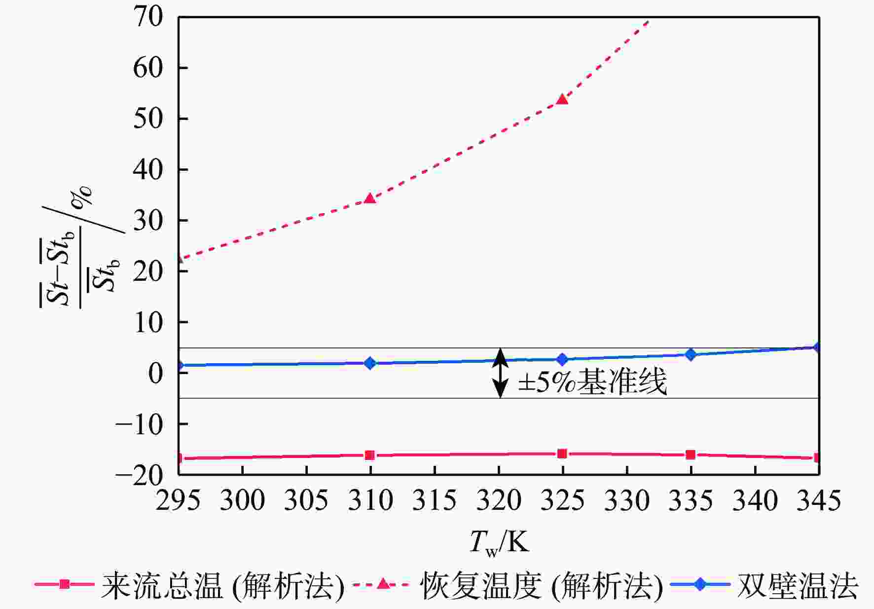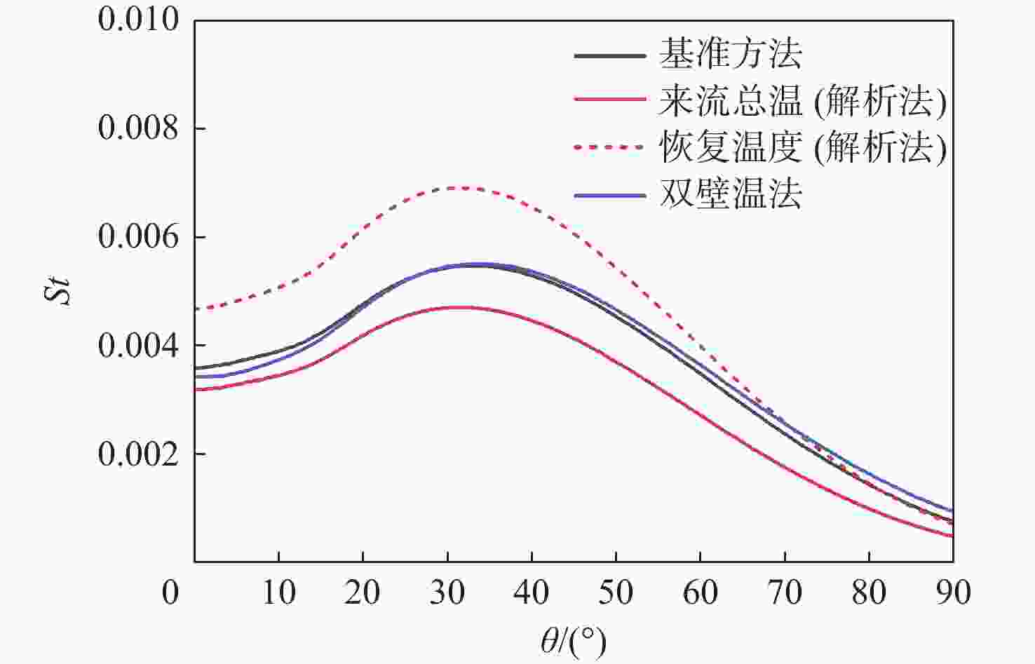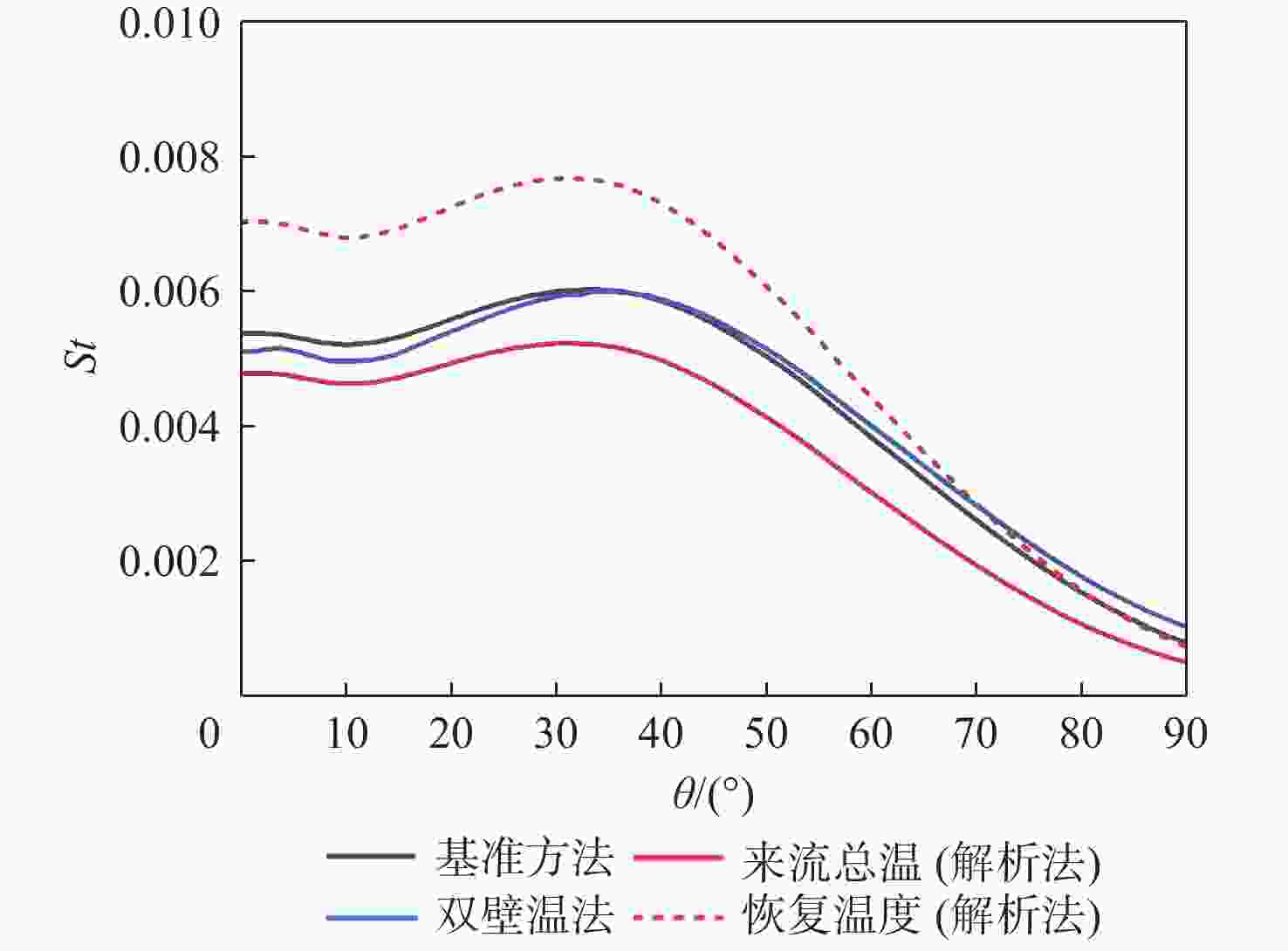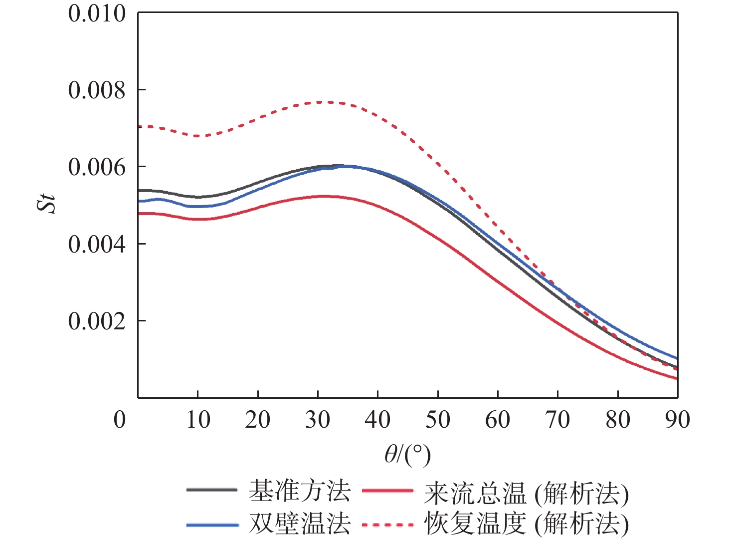 斯坦顿数是评价飞行器气动热性能的重要指标,但其求解方法尚有分歧,主要体现在对流换热驱动温度的确定方式上。当前常用的2种方法均基于解析公式获得驱动温度,统称为“解析法”:第1种方法选取来流总温作为驱动温度,第2种方法选取高速流动外掠平板时的壁面恢复温度作为驱动温度。鉴于此,以驱动温度等于绝热壁温的方法为基准,通过数值仿真对比了上述2种解析法与新引入的双壁温法(即由2组等温壁面算例的结果作差获得对流换热系数)在求解钝体壁面斯坦顿数时的准确性。结果表明:双壁温法所得斯坦顿数与基准方法的吻合度远高于2种解析法,其壁面平均斯坦顿数与基准方法的相对偏差在5%以内,而2种解析法的相对偏差均大于15%。此外,双壁温法所得驱动温度沿钝体圆周角的变化趋势与绝热壁温一致,而2种解析法所得驱动温度在各圆周角下均为定值,不符合物理规律。