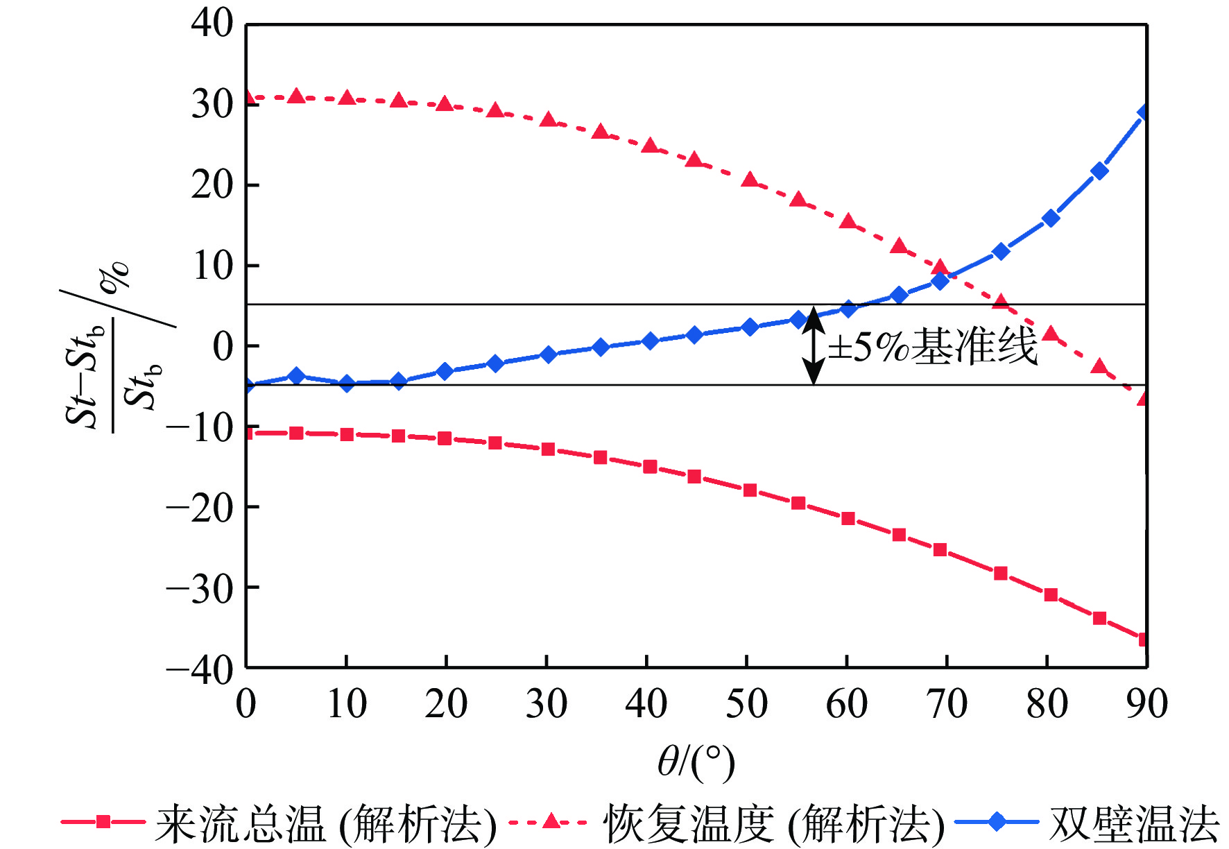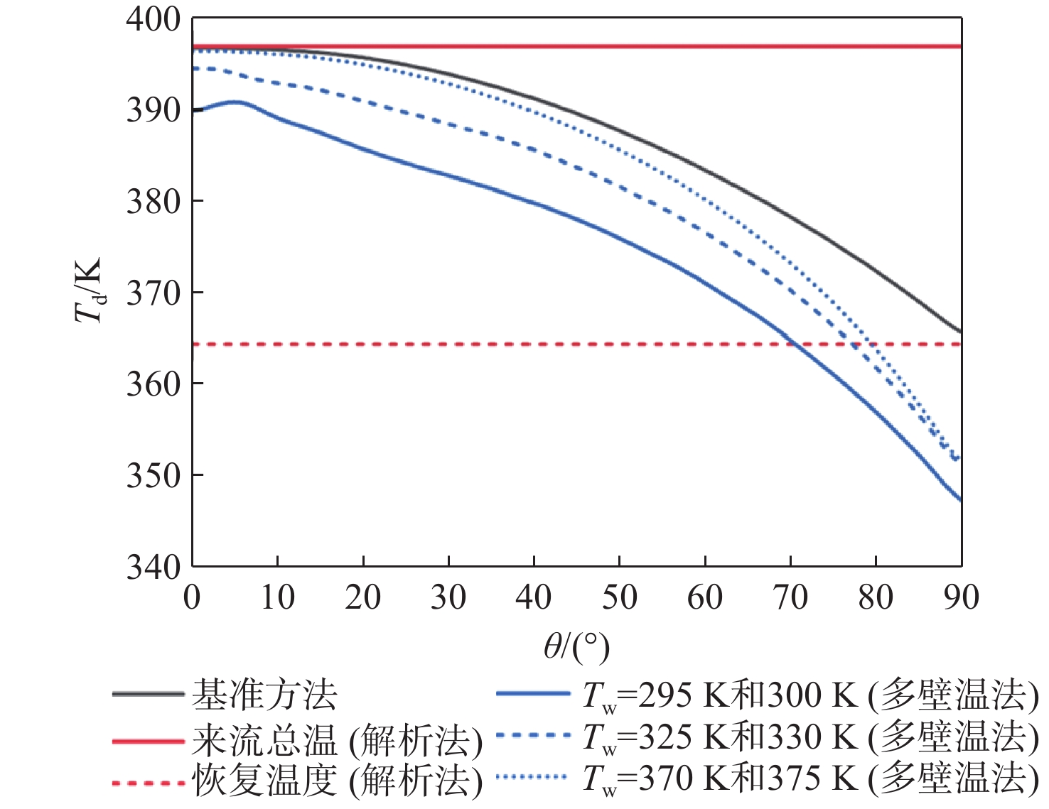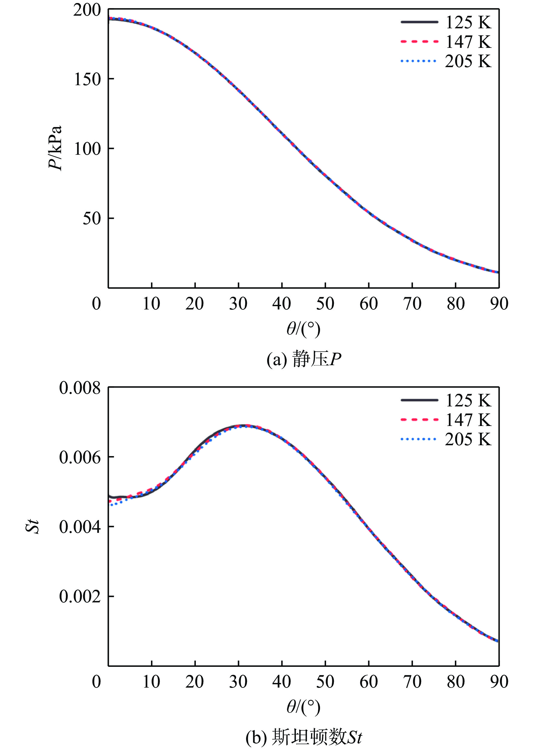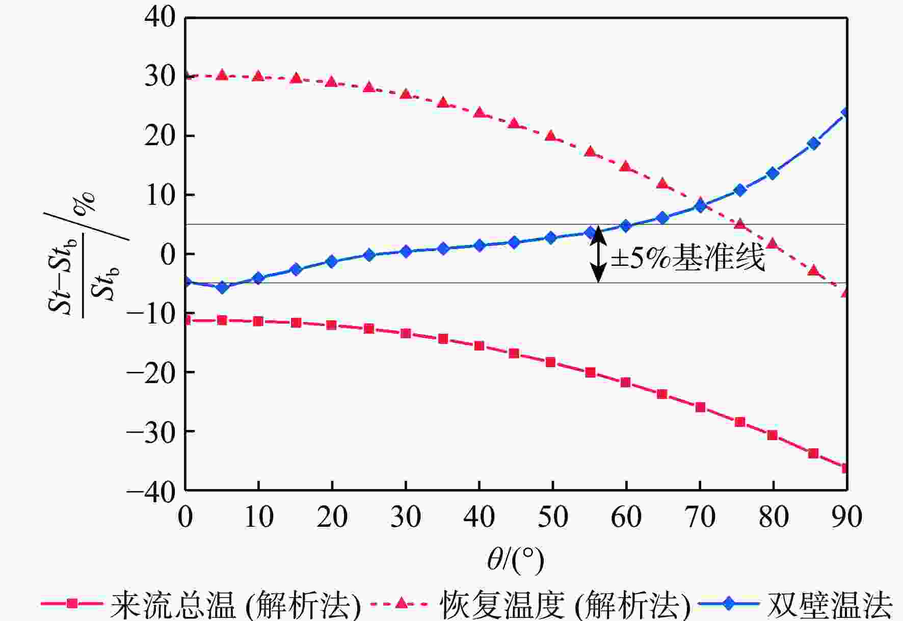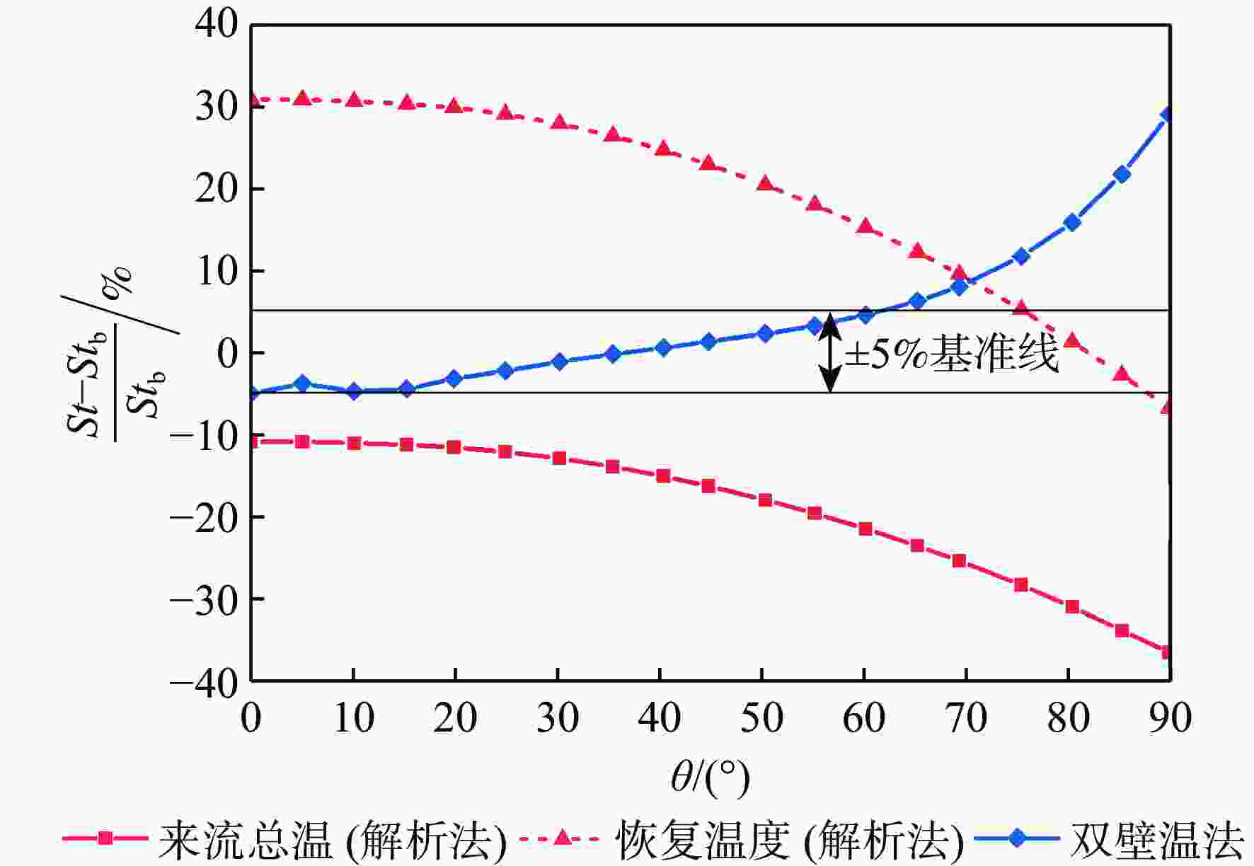 斯坦顿数是评价飞行器气动热性能的重要指标,但其求解方法尚有分歧,主要体现在对流换热驱动温度的确定方式上。当前常用的2种方法均基于解析公式获得驱动温度,统称为“解析法”:第1种方法选取来流总温作为驱动温度,第2种方法选取高速流动外掠平板时的壁面恢复温度作为驱动温度。鉴于此,以驱动温度等于绝热壁温的方法为基准,通过数值仿真对比了上述2种解析法与新引入的双壁温法(即由2组等温壁面算例的结果作差获得对流换热系数)在求解钝体壁面斯坦顿数时的准确性。结果表明:双壁温法所得斯坦顿数与基准方法的吻合度远高于2种解析法,其壁面平均斯坦顿数与基准方法的相对偏差在5%以内,而2种解析法的相对偏差均大于15%。此外,双壁温法所得驱动温度沿钝体圆周角的变化趋势与绝热壁温一致,而2种解析法所得驱动温度在各圆周角下均为定值,不符合物理规律。