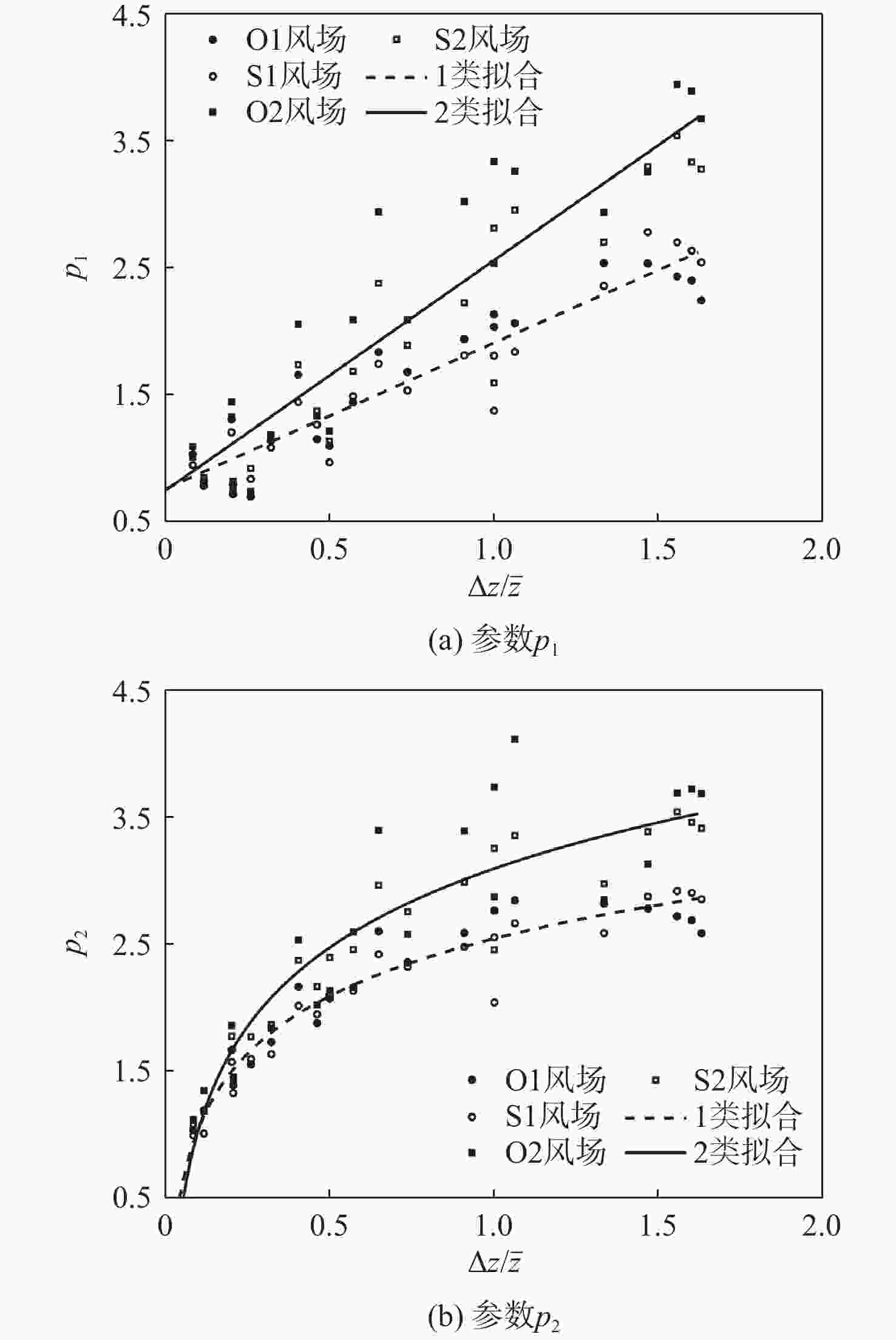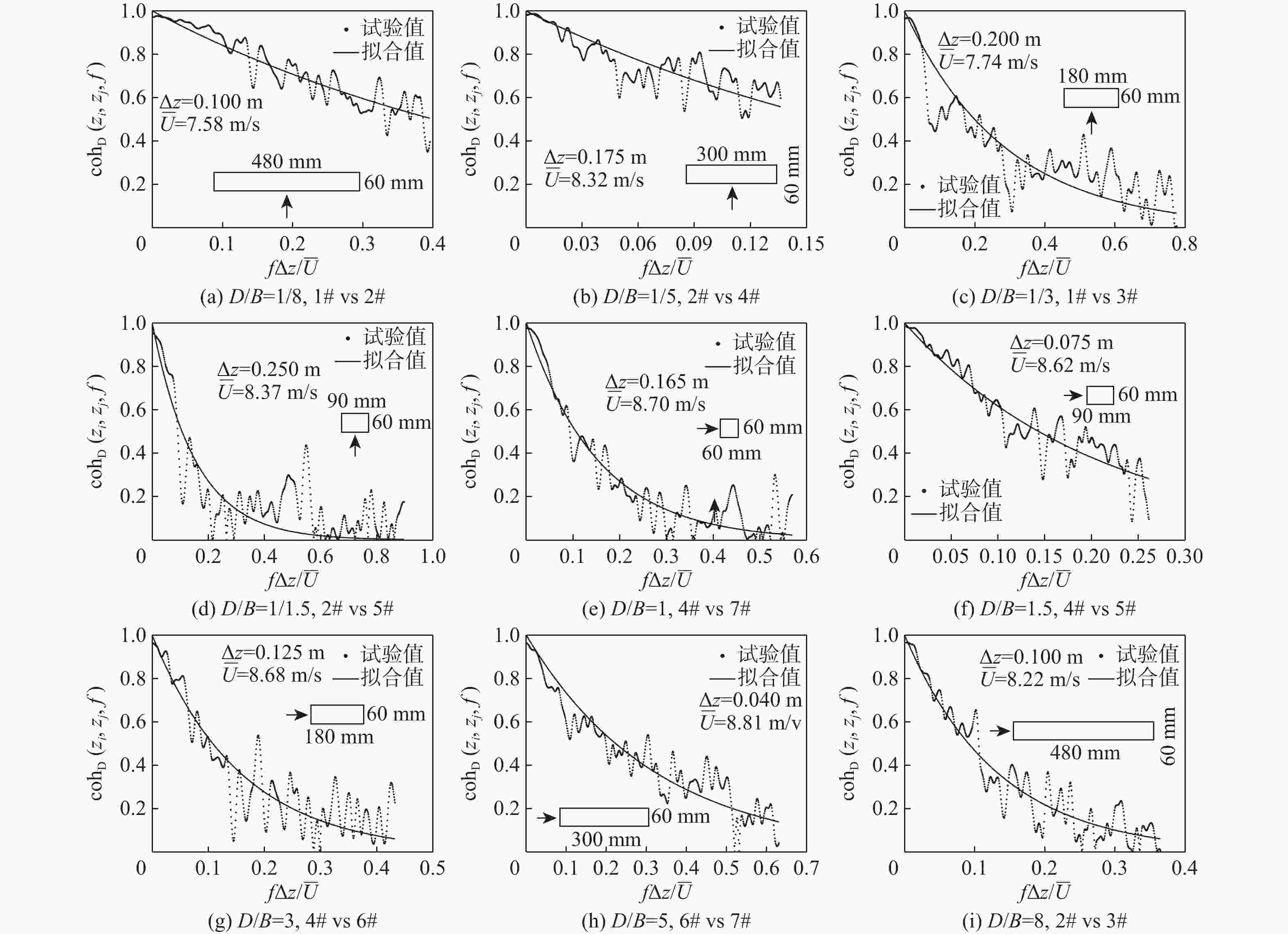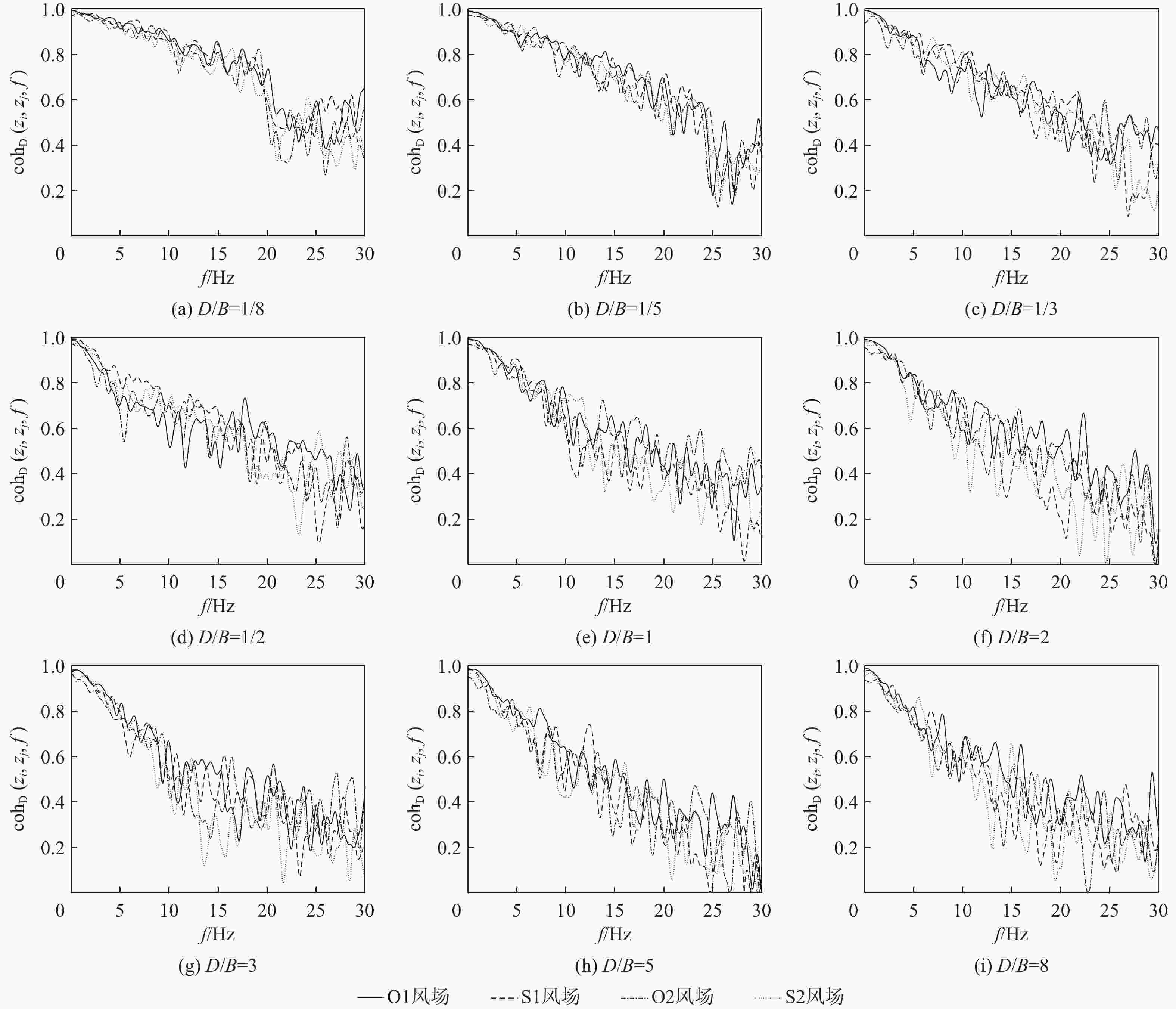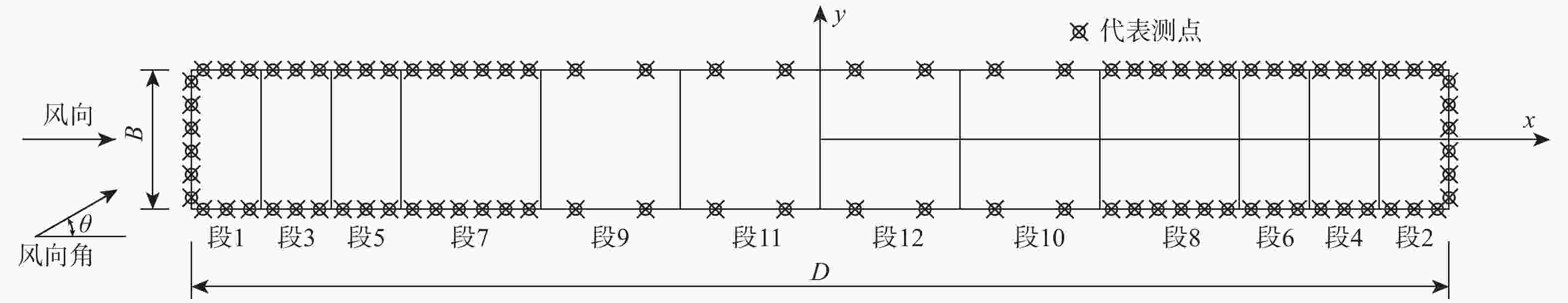 工况 风场类型 深宽比 拼接方式(从左至右) 测压点个数 1 O1 1/9,9 段1,段3,段5,段7,段9,段11,段12,段10,段8,段6,段4,段2 616 2 O1,O2,S1,S2 1/8,8 段1,段3,段5,段7,段9,段11,段10,段8,段6,段4,段2 588 3 O1 1/7,7 段1,段3,段5,段7,段9,段10,段8,段6,段4,段2 560 4 O1 1/6,6 段1,段3,段5,段7,段10,段8,段6,段4,段2 532 5 O1,O2,S1,S2 1/5,5 段1,段3,段5,段7,段8,段6,段4,段2 504 6 O1 1/4,4 段1,段3,段5,段7,段6,段4,段2 420 7 O1,O2,S1,S2 1/3,3 段1,段3,段5,段6,段4,段2 336 8 O1 1/2.5,2.5 段1,段3,段5,段4,段2 294 9 O1,O2,S1,S2 1/2,2 段1,段3,段5,段2 252 10 O1 1/1.5,1.5 段1,段4,段2 210 11 O1,O2,S1,S2 1 段1,段2 168 表 2 典型顺风向相干函数经验公式