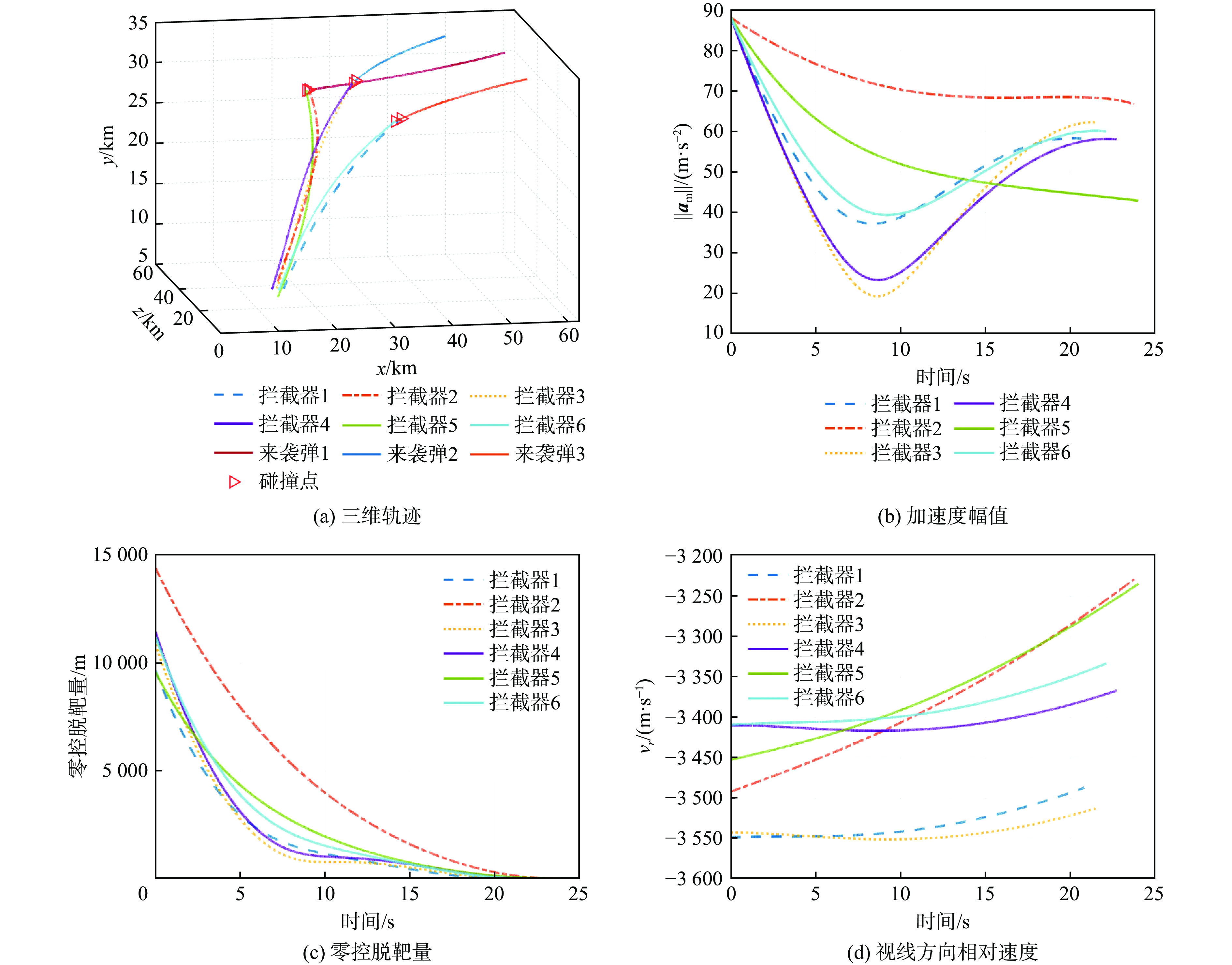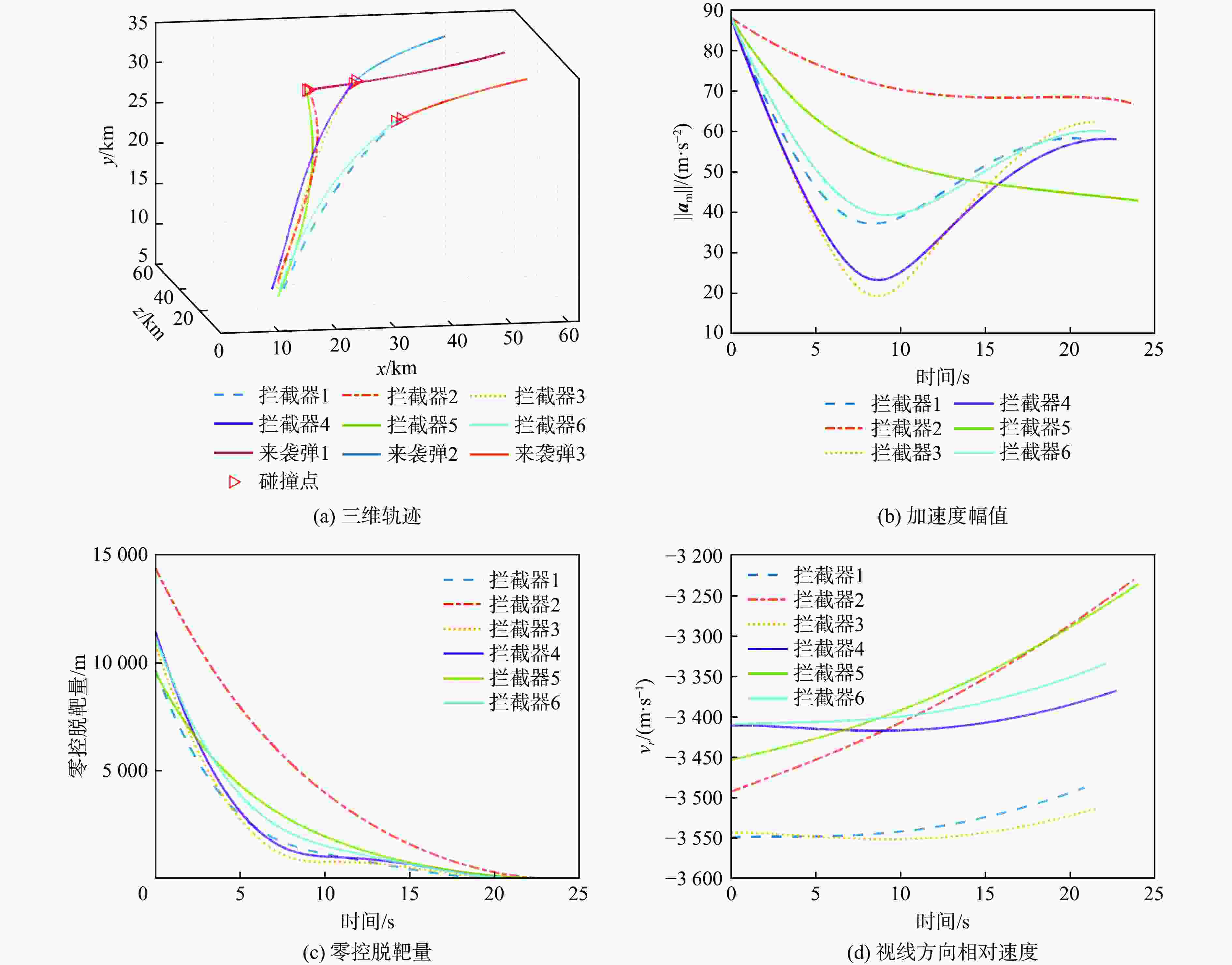 参数 数值 弹头释放位置rmc/km [10, 10, 10]T 子拦截器1位矢rm1/km rmc+[1, 0, 0]T 子拦截器2位矢rm2/km rmc+[0, 1, 0]T 子拦截器3位矢rm3/km rmc+[0, 0, 1]T 子拦截器4位矢rm4/km rmc+[−1, 0, 0]T 子拦截器5位矢rm5/km rmc+[0, −1, 0]T 子拦截器6位矢rm6/km rmc+[0, 0, −1]T 目标1初始时刻位矢rt1/km [60, 30, 60]T 目标2初始时刻位矢rt2/km [50, 32, 62]T 目标3初始时刻位矢rt3/km [62, 28, 50]T 弹头释放时刻速度大小Vm/(m·s−1) 1800 目标1速度大小Vt1/(m·s−1) 2 000 目标2速度大小Vt2/(m·s−1) 2 000 目标3速度大小Vt3/(m·s−1) 2 000 弹头释放时刻速度倾角θmc/(°) 45 目标1初始时刻速度倾角θt1/(°) 0 目标2初始时刻速度倾角θt2/(°) 0 目标3初始时刻速度倾角θt3/(°) 0 弹头释放时刻速度方位角ψmc/(°) −45 目标1初始时刻速度方位角ψt1/(°) 135 目标2初始时刻速度方位角ψt2/(°) 130 目标3初始时刻速度方位角ψt3/(°) 140 弹头释放时刻速度矢量vmc/(m·s−1) Vm·[cosθmccosψmc, sinθmc,