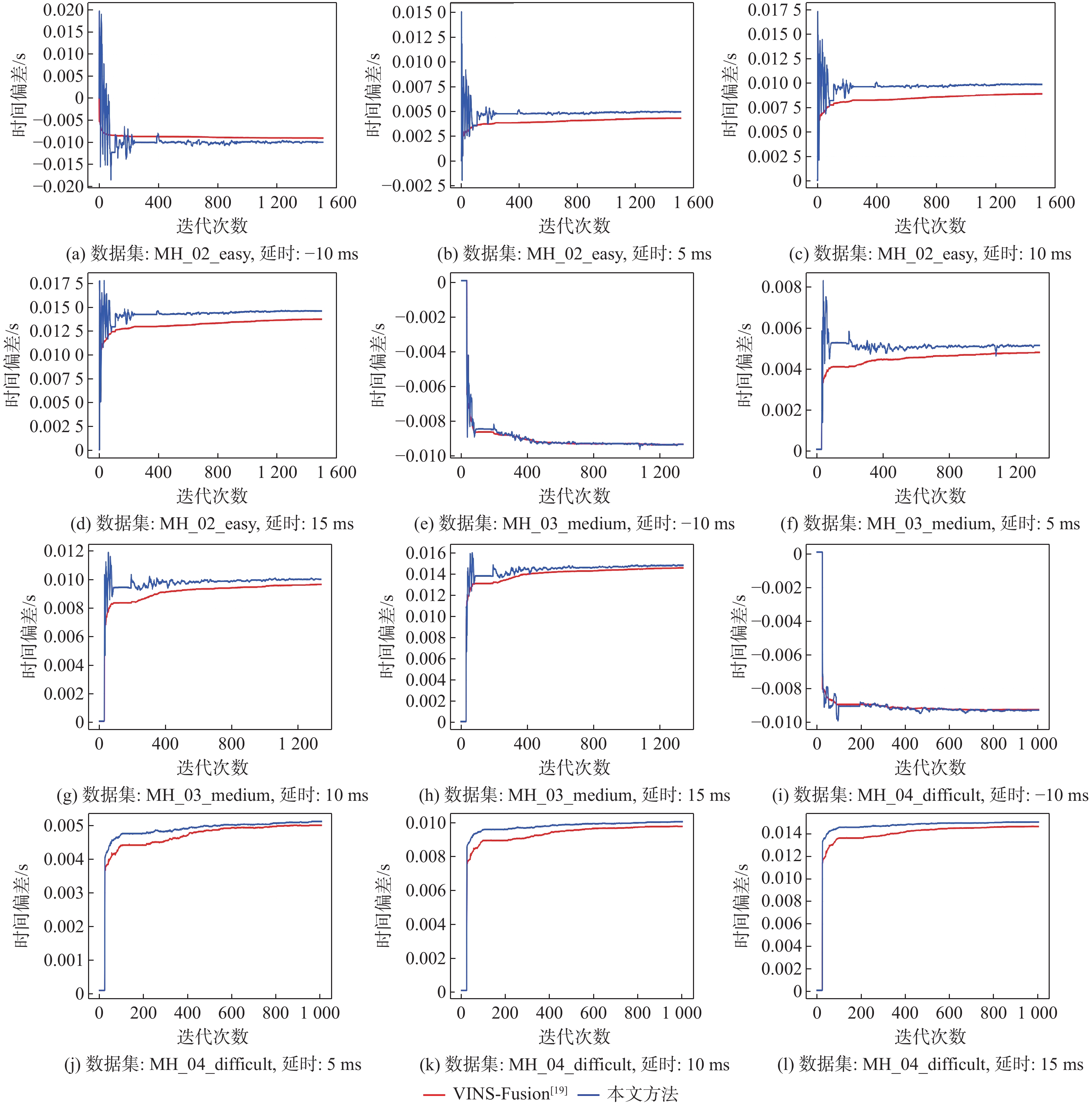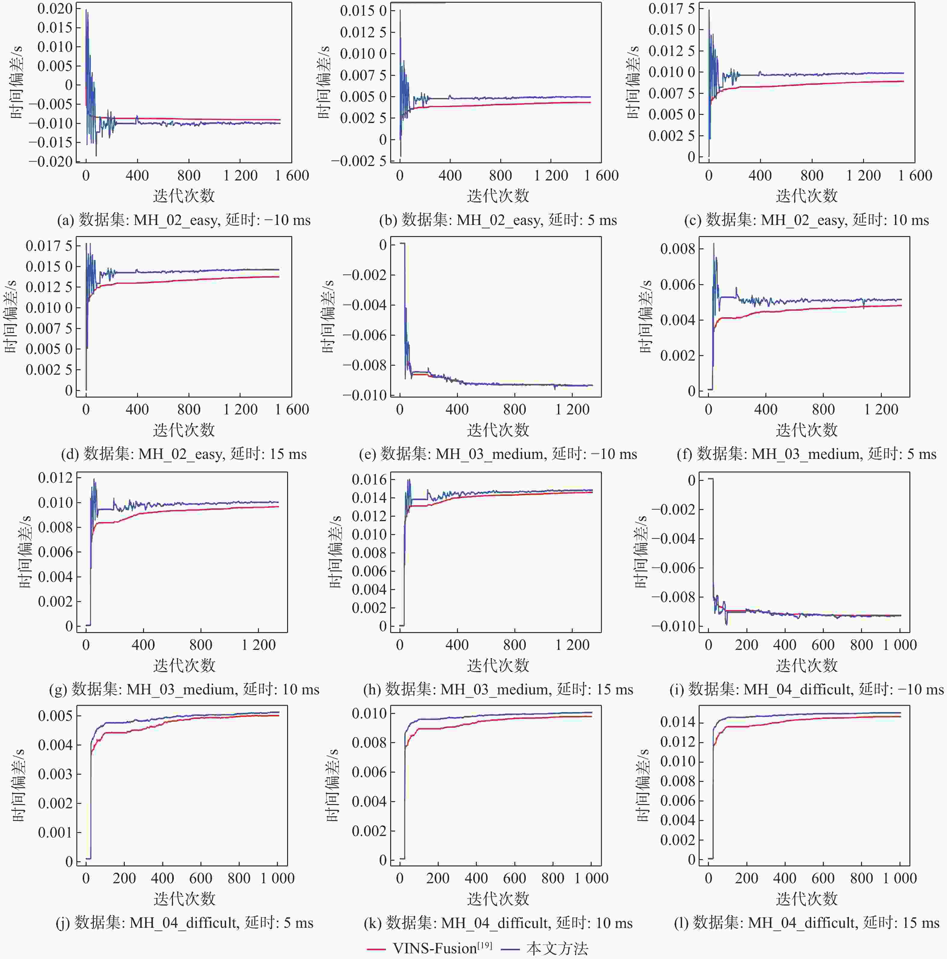数据集 延时设定值/ms 延时估计值/ms 本文方法 VINS-Fusion[19] MH_02_easy −10 −9.98 −9.00 5 4.97 4.35 10 9.87 8.91 15 14.61 13.73 MH_03_midium −10 −9.37 −9.37 5 5.17 4.86 10 10.01 9.64 15 14.83 14.57 MH_04_difficult −10 −9.31 −9.28 5 5.12 5.01 10 10.05 9.77 15 15.06 14.65 表 2 仿真实验中的RMSE结果