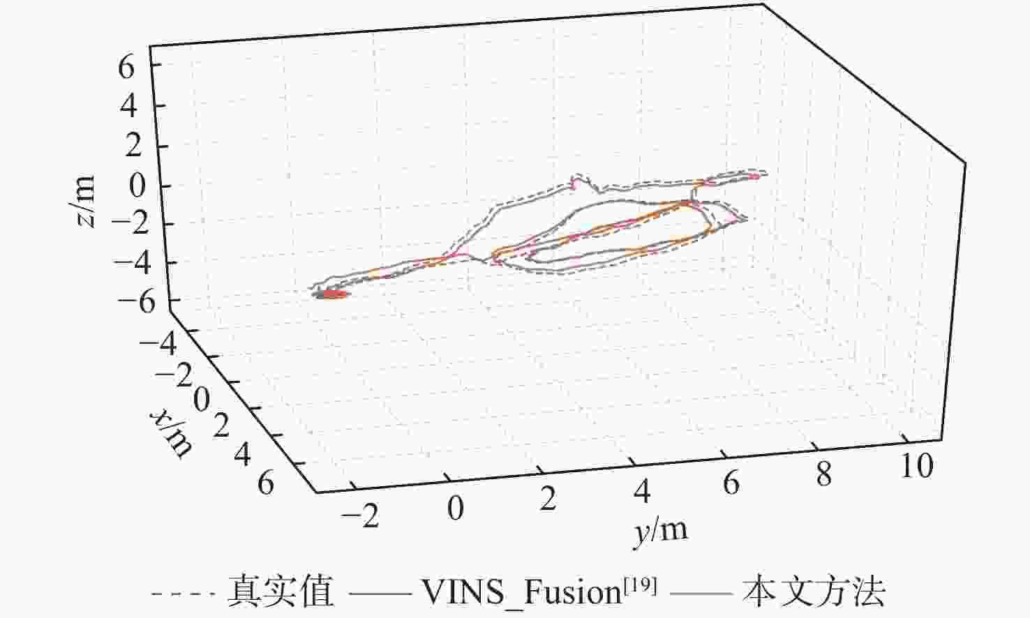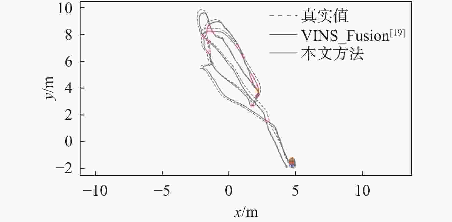 数据集 延时设定值/ms RMSE/m 本文方法 VINS-Fusion[19] MH_02_easy −10 0.2692 0.2742 5 0.2609 0.2615 10 0.2690 0.2686 15 0.2768 0.2702 MH_03_medium −10 0.4480 0.4785 5 0.4529 0.4540 10 0.4526 0.4548 15 0.4523 0.4497 MH_04_difficult −10 0.5297 0.5258 5 0.5299 0.5358 10 0.5308 0.5346 15 0.5298 0.5298 -