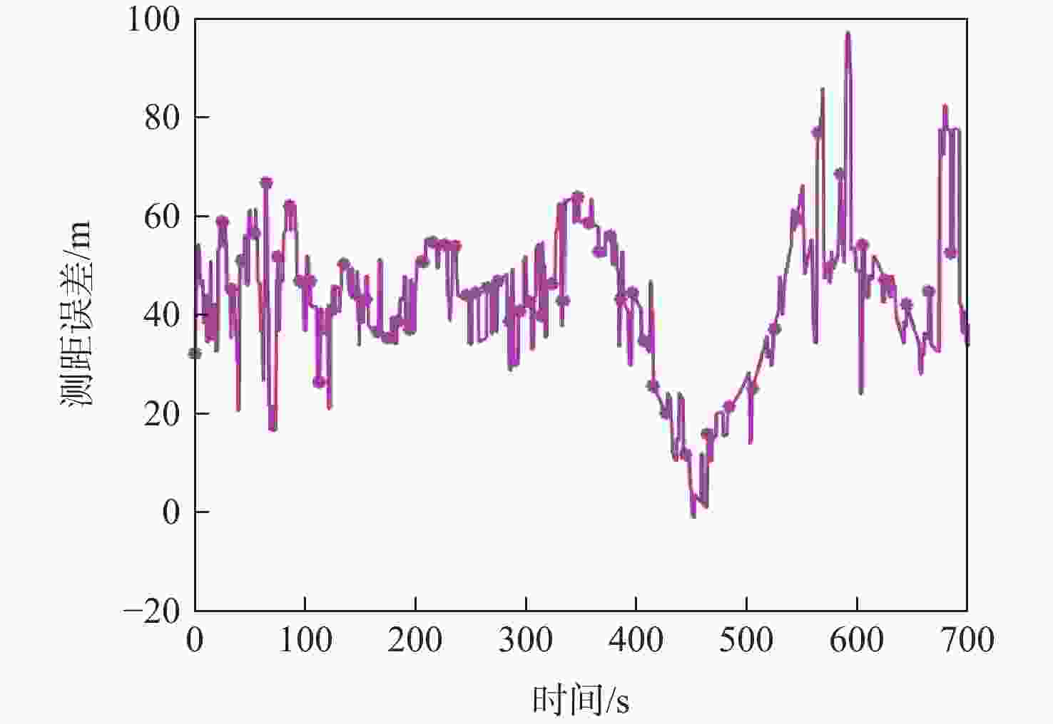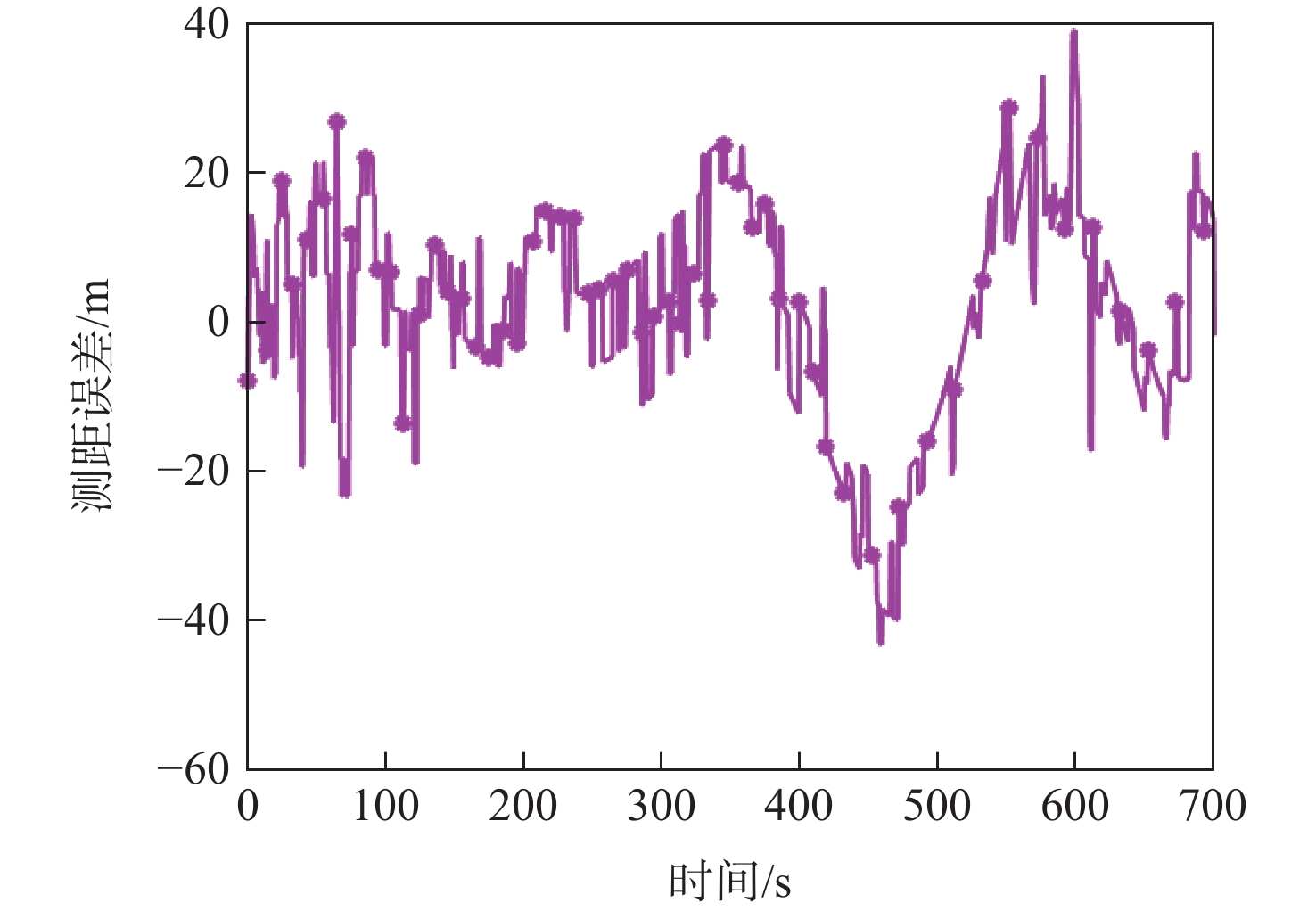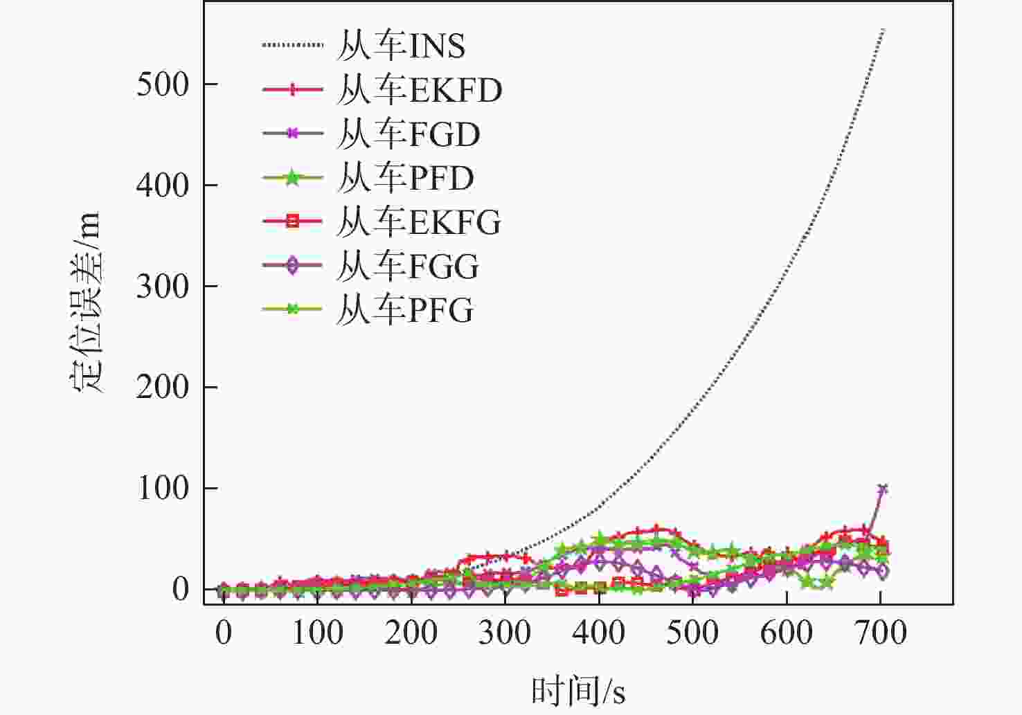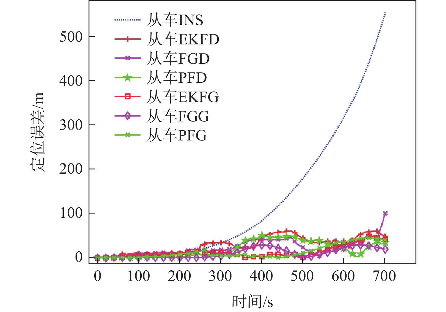 算法 定位误差RMS/m EKFD 35.2208 FGD 28.6680 PFD 26.8719 EKFG 18.3407 FGG 15.1902 PFG 12.1966 表 3 不同测距噪声下算法定位误差