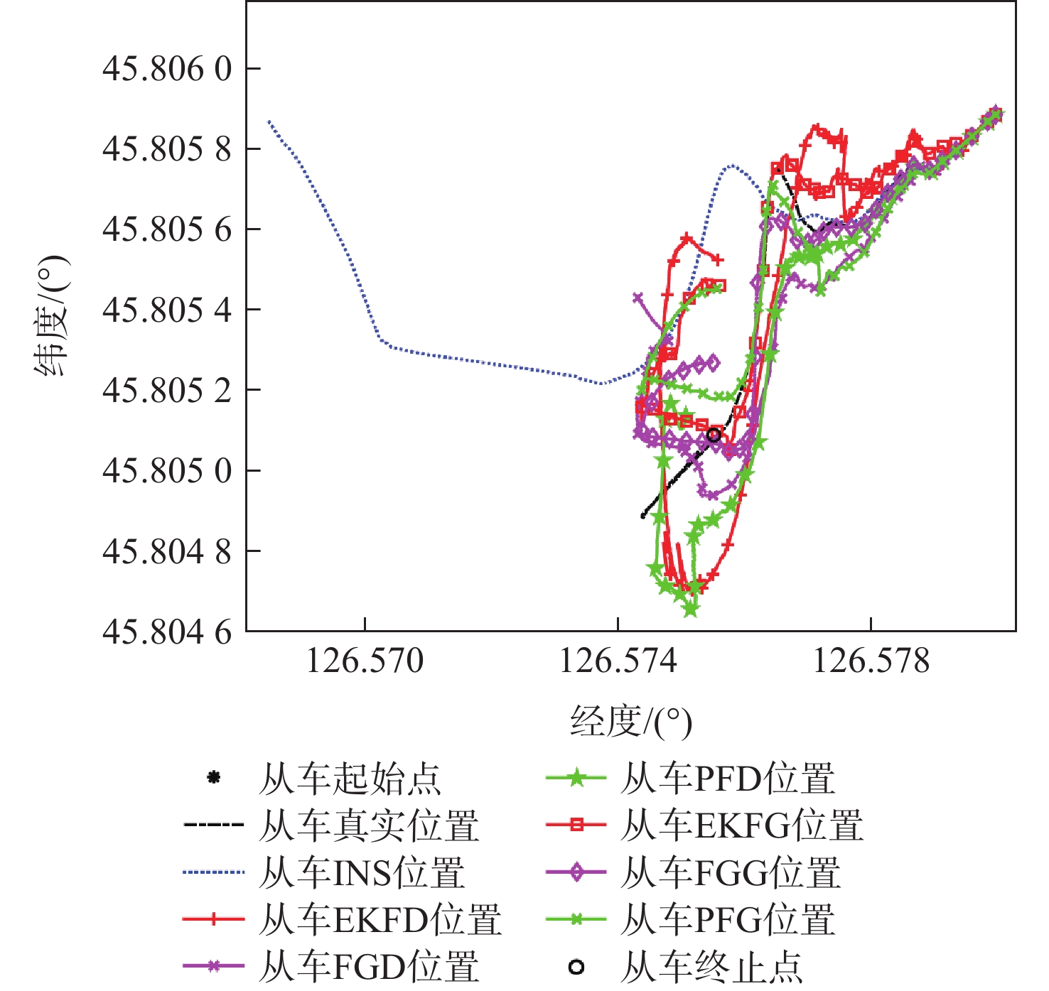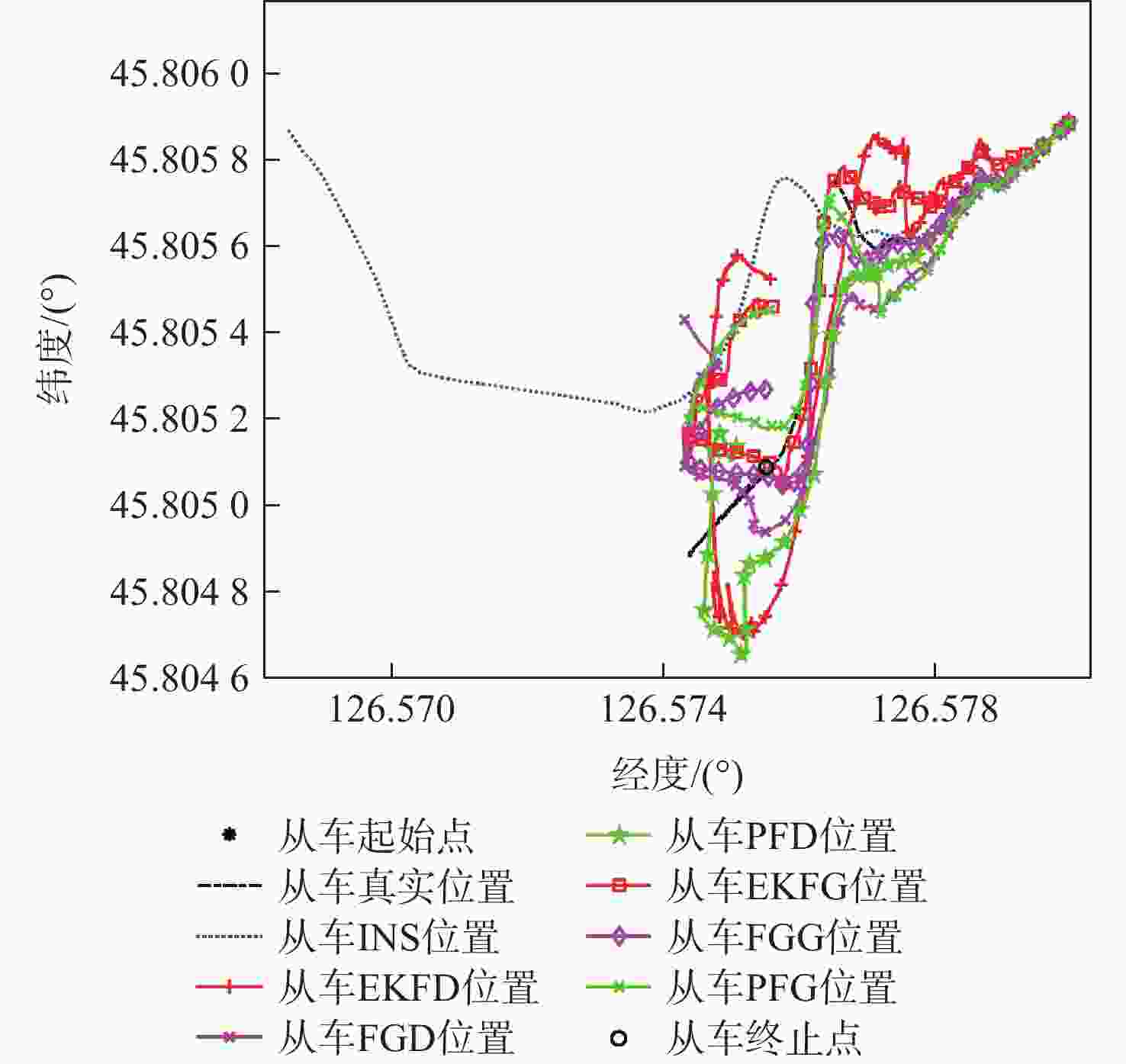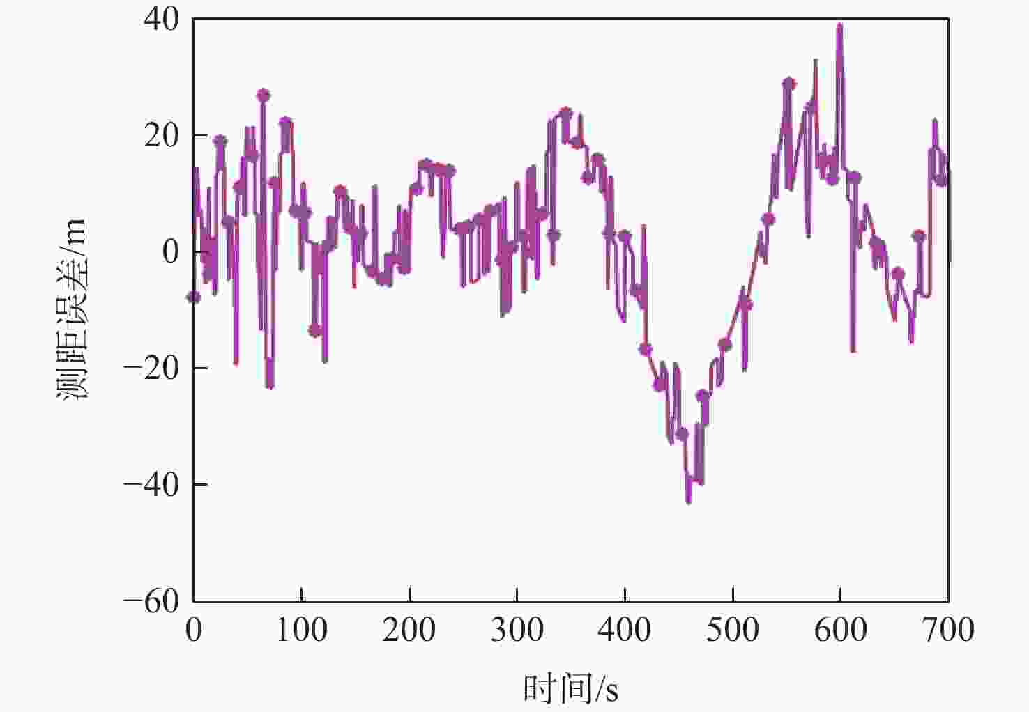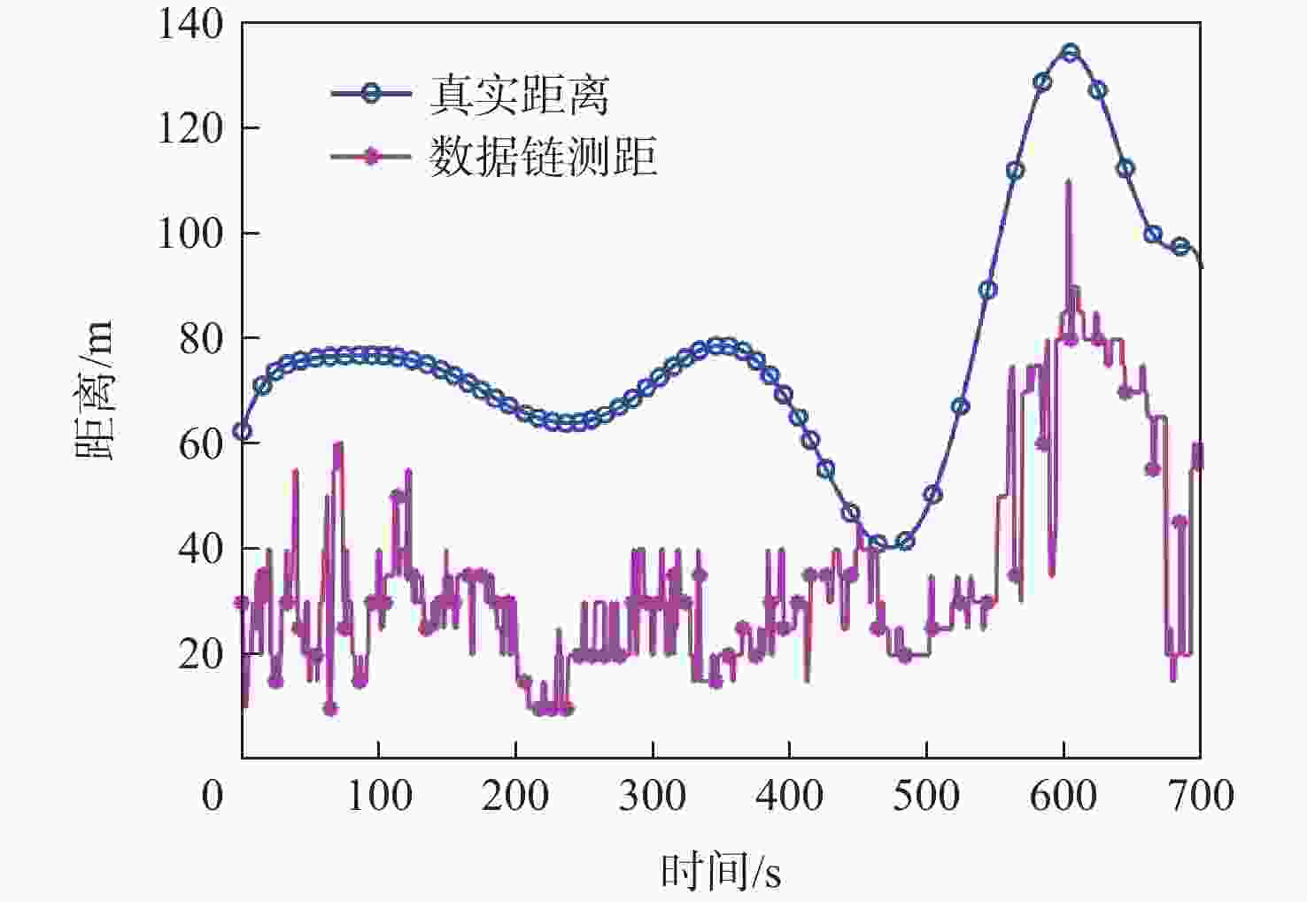 算法 定位误差RMS/m EKFD 35.2208 FGD 28.6680 PFD 26.8719 EKFG 18.3407 FGG 15.1902 PFG 12.1966 表 3 不同测距噪声下算法定位误差