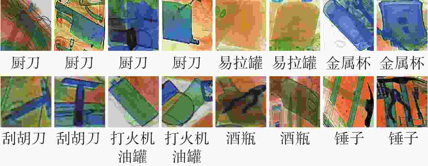 大类标签 样本数 平均精度 Cascade R-CNN[4] YOLOX-L[18] YOLOX-L-FG 刀具 2453 0.326 0.696 0.744 工具 3776 0.478 0.730 0.773 玻璃容器 11867 0.747 0.887 0.870 有机物容器 3975 0.633 0.828 0.826 电脑 784 0.937 0.971 0.898 充电宝 1139 0.731 0.863 0.850 小电子设备 3378 0.790 0.904 0.867 枪 23 0.351 0.333 0.517 压力罐 669 0.410 0.574 0.731 指虎 19 0.506 0.657 0.789 手铐 9 0.722 0.749 0.495 雨伞 1664 0.922 0.968 0.897 剪刀 891 0.488 0.619 0.731 打火机 1657 0.583 0.741 0.773 金属杯 1507 0.947 0.974 0.899 打火机油罐 4 0.250 0.250 0.545 弹弓 8 0.042 0.198 0.432 甩棍 7 0.071 0.429 0.732 注:mAP为表中所有18个类别平均精度的算术平均值;Cascade R-CNN、YOLOX-L、YOLOX-L-FG的mAP分别为0.552、0.687、0.743。 表 4 FG模块集成前后均值平均精度对比