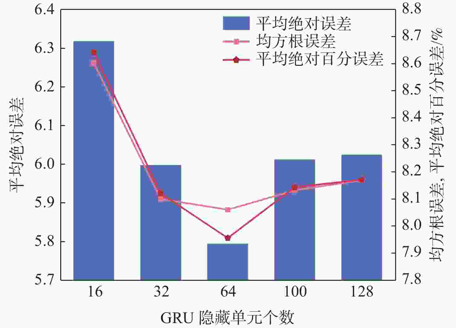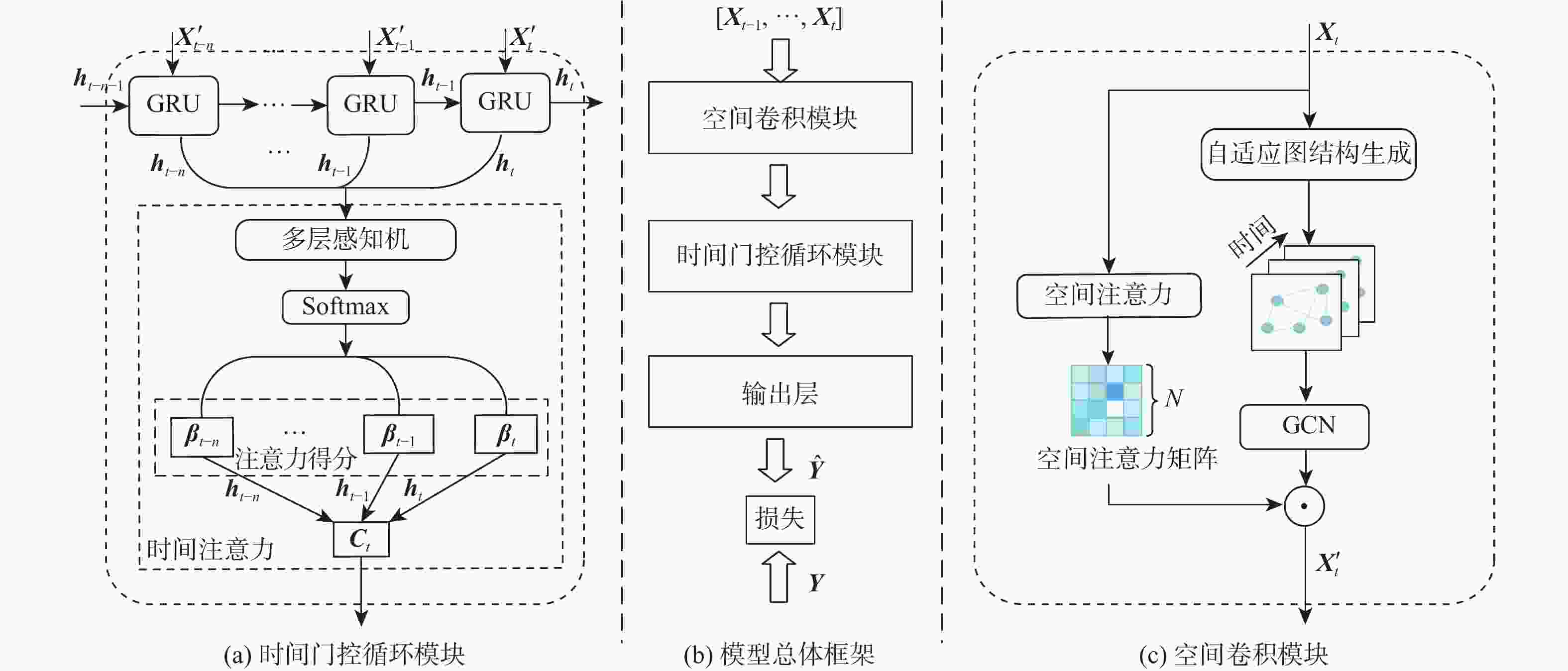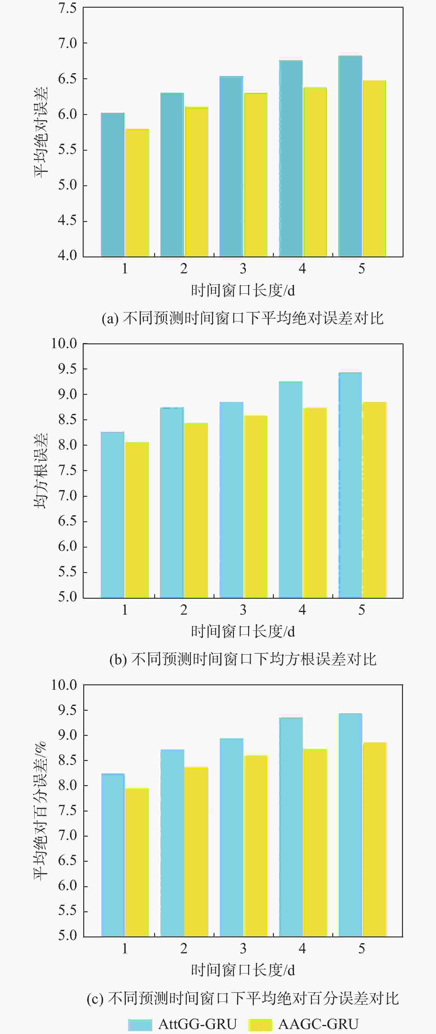 百分误差/%1 SAttGC-GRU 8.1217 5.9413 8.0927 TAttGC-GRU 8.1249 5.9314 8.0680 AAGC-GRU 8.0621 5.7950 7.9578 2 SAttGC-GRU 8.4621 6.2292 8.4614 TAttGC-GRU 8.4871 6.1973 8.4793 AAGC-GRU 8.4373 6.1036 8.3697 3 SAttGC-GRU 8.6604 6.3564 8.6842 TAttGC-GRU 8.7031 6.4256 8.7536 AAGC-GRU 8.5806 6.2961 8.5932 4 SAttGC-GRU 8.8000 6.6086 8.9517 TAttGC-GRU 8.7476 6.4736 8.8175 AAGC-GRU 8.7290 6.3746 8.7264 5 SAttGC-GRU 8.8624 6.6833 9.0345 TAttGC-GRU 8.8779 6.5631 8.9543 AAGC-GRU 8.8123 6.4701 8.8491 注:SAttGC-GRU为AAGC-GRU去除时间注意力机制模块后的模型,TAttGC-GRU为AAGC-GRU去除空间注意力机制模块后的模型。 表 2 不同模型的时空复杂度对比分析