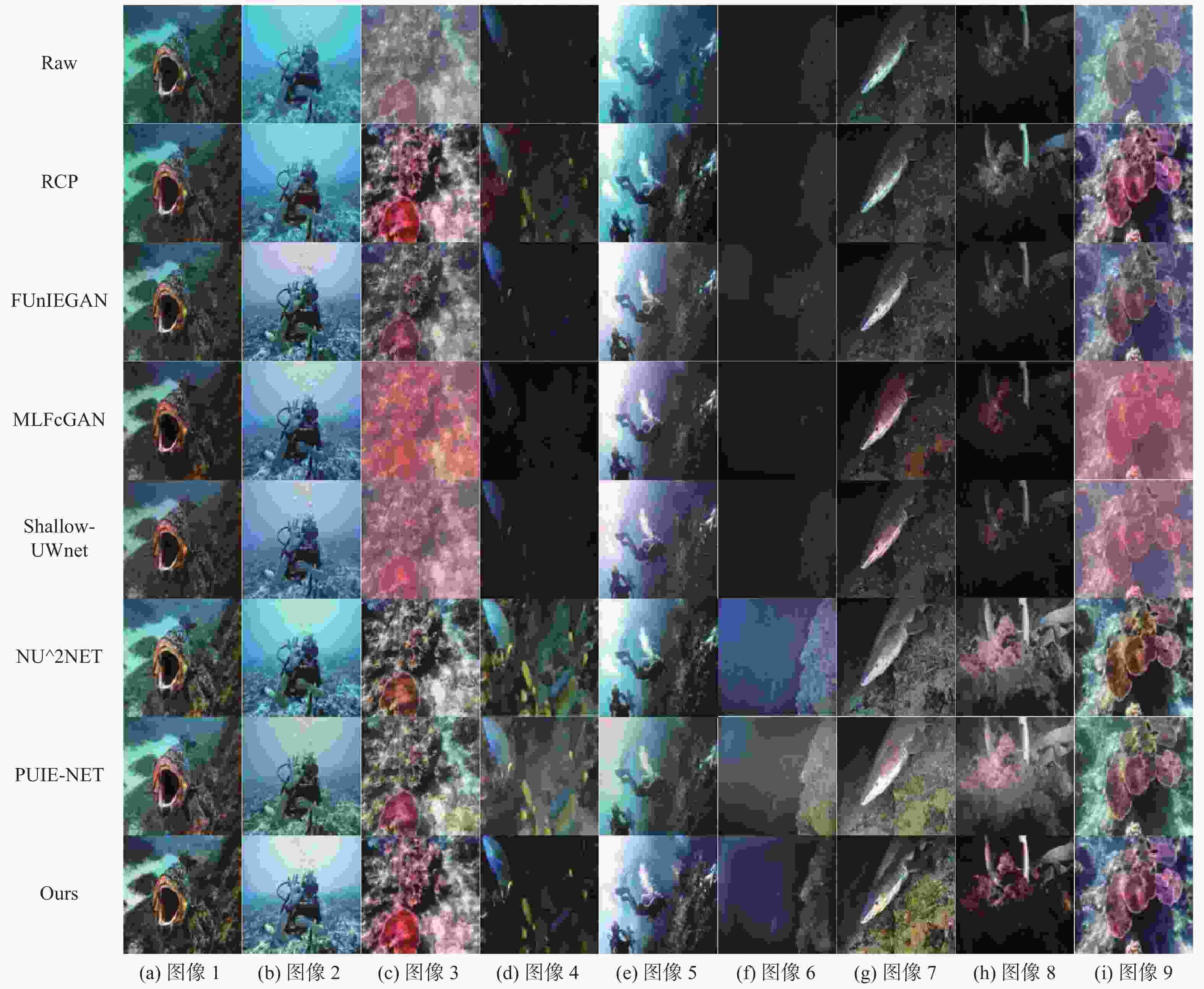 图像编号 图像处理方案 RCP FUnIE-GAN MLFcGAN Shallow-UWNet NU^2Net PUIE-NET Ours 图6(a) 4.633 9 4.853 3 (5.053 6) 4.948 9 4.666 4 4.730 5 5.140 2 图6(b) 1.321 9 (3.353 4) 2.826 0 3.168 7 2.599 2 3.276 7 3.382 9 图6(c) 6.109 0 5.409 3 5.562 0 5.127 4 5.719 4 5.504 4 (6.106 7) 图6(d) (5.101 8) 5.076 1 4.631 1 4.835 4 4.615 3 4.244 7 5.341 0 图6(e) 4.219 8 4.250 9 4.226 3 4.111 4 (4.273 3) 3.975 3 4.295 9 图6(f) 3.390 0 3.467 1 (3.899 2) 3.466 2 3.496 4 3.535 1 4.096 7 图6(g) 5.030 5 5.294 6 5.428 8 (5.449 9) 5.439 7 5.225 4 5.458 0 图6(h) 5.205 8 (5.351 5) 4.620 7 4.287 3 5.243 8 4.704 8 5.802 8 图6(i) 6.010 9 (5.369 2) 5.588 7 5.222 4 5.588 6 5.143 7 (5.600 2) 注:表中各列的平均值分别为4.558 2,4.713 9,4.648 5,4.513 1,4.626 9,4.482 2,5.024 9;表中粗体表示每行最优结果,()表示每行次优结果。 表 2 不同方法在对应图像上的UCIQE指标