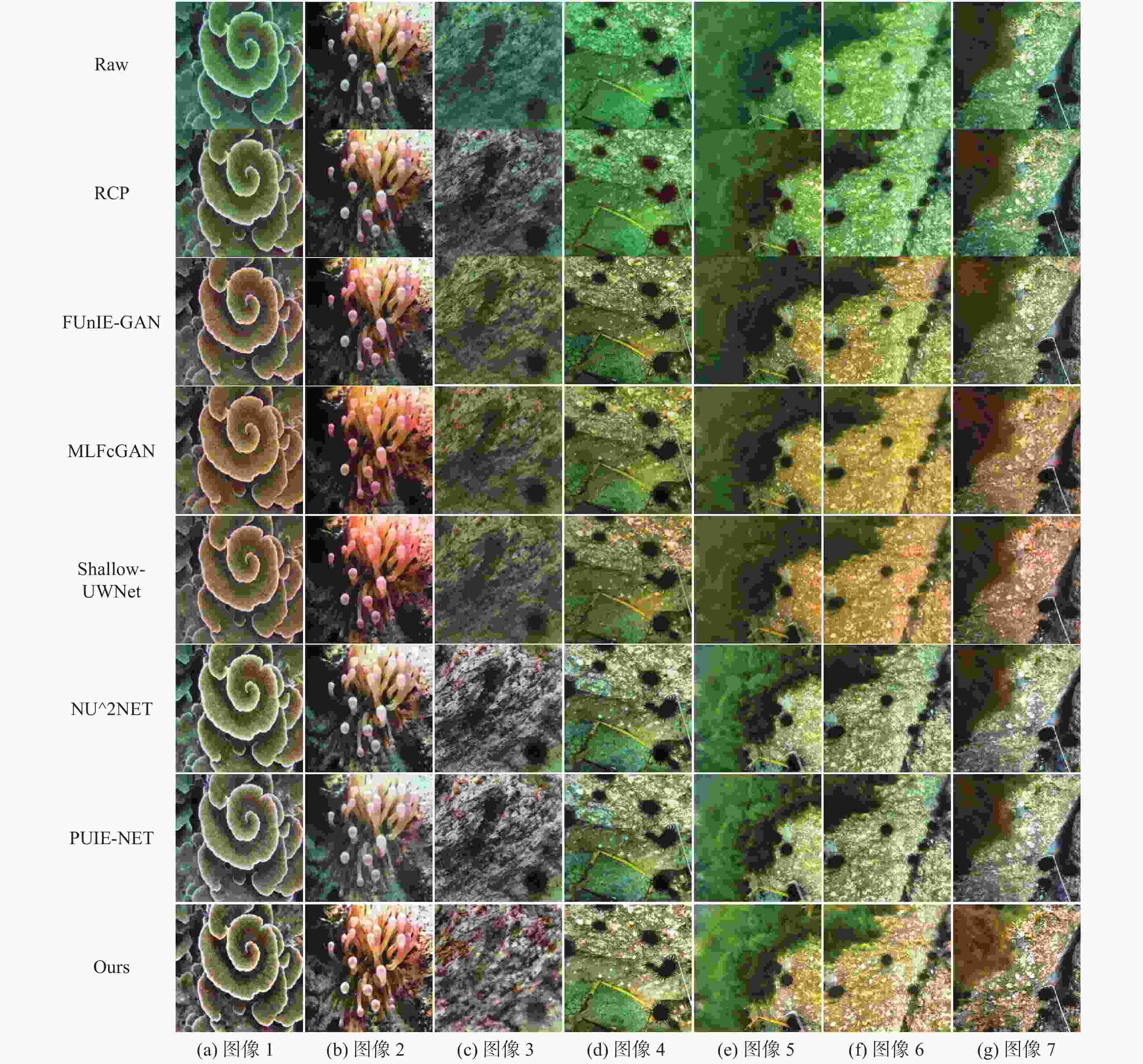 图像编号 图像处理方案 RCP FUnIE-GAN MLFcGAN Shallow-UWNet NU^2NET PUIE-NET Ours 图7(a) 5.108 2 (5.818 9) 5.802 1 5.621 2 5.386 5 5.351 9 5.822 7 图7(b) 5.612 6 5.674 8 5.606 5 (5.785 0) 5.478 9 5.134 9 5.917 4 图7(c) 5.686 1 5.707 6 5.670 7 5.599 5 (5.972 9) 5.608 4 6.071 0 图7(d) 4.122 1 5.382 3 5.384 3 5.457 0 5.243 7 (5.604 7) 5.664 0 图7(e) 4.169 7 4.759 3 4.497 5 4.020 5 4.451 6 4.417 9 (4.581 2) 图7(f) 4.483 3 5.681 1 5.591 8 (5.864 9) 5.322 2 5.505 1 5.873 7 图7(g) 5.102 4 5.548 5 (5.998 2) 5.677 2 5.552 8 5.367 5 6.171 6 注:表中各列的平均值分别为4.897 7,5.510 3,5.507 3,5.432 1,5.344 0,5.284 3,5.728 8;表中粗体表示每行最优结果,()表示每行次优结果。 表 4 不同方法在对应图像上的UCIQE指标