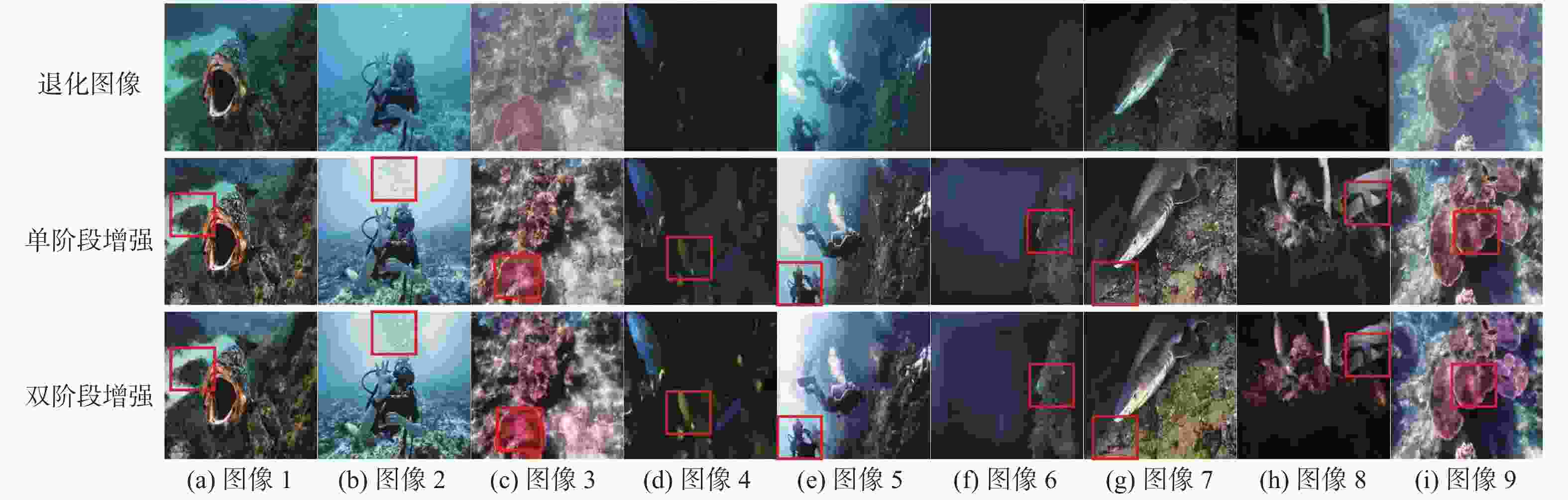 图像编号 图像处理方案 RCP FUnIE-GAN MLFcGAN Shallow-UWNet NU^2NET PUIE-NET Ours 图7(a) 0.409 8 0.450 7 (0.451 4) 0.430 0 0.416 9 0.417 5 0.456 7 图7(b) 0.476 1 0.478 7 0.481 8 (0.476 5) 0.451 1 0.401 8 0.457 1 图7(c) 0.356 9 0.293 7 0.288 3 0.260 0 0.405 0 0.347 2 (0.382 5) 图7(d) 0.403 8 0.413 3 0.410 7 0.423 2 0.398 8 (0.425 4) 0.435 3 图7(e) 0.449 0 (0.469 4) 0.459 4 0.479 8 0.421 7 0.389 9 0.466 4 图7(f) 0.406 3 0.406 2 (0.412 3) 0.404 2 0.390 2 0.386 2 0.438 7 图7(g) 0.441 2 0.419 3 0.442 0 0.451 1 0.435 7 0.406 6 (0.444 0) 注:表中各列的平均值分别为0.420 4,0.418 7,0.420 8,0.417 8,0.417 0,0.396 3,0.440 1;表中粗体表示每行最优结果,()表示每行次优结果。 表 5 单阶段增强与双阶段增强指标对比