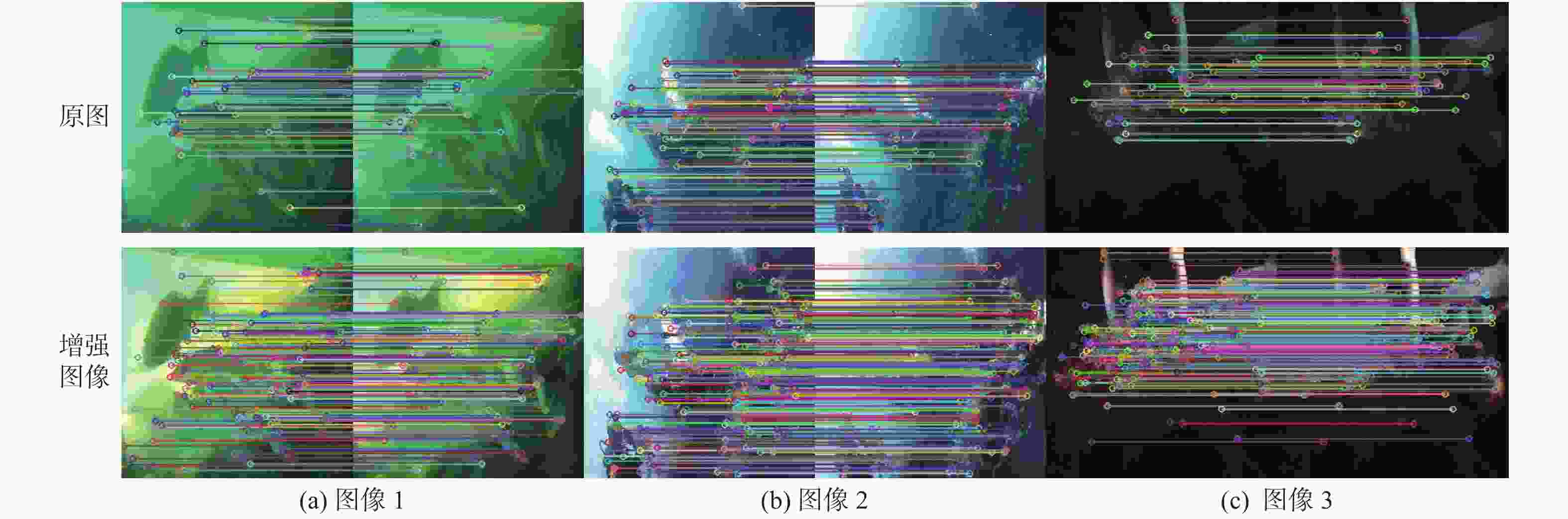 图像编号 单阶段增强 双阶段增强 UIQM UCIQE UIQM UCIQE 图8(a) 5.089 3 0.431 1 5.140 2 0.445 0 图8(b) 3.281 4 0.374 0 3.382 9 0.352 7 图8(c) 5.995 7 0.429 3 6.106 7 0.515 2 图8(d) 4.630 6 0.305 5 5.341 0 0.442 6 图8(e) 4.224 3 0.364 6 4.295 9 0.401 4 图8(f) 3.768 5 0.269 1 4.096 7 0.297 5 图8(g) 5.469 0 0.436 0 5.458 0 0.445 1 图8(h) 5.388 6 0.394 4 5.802 8 0.537 6 图8(i) 5.605 2 0.434 5 5.600 2 0.460 6 注:表中各列的平均值分别为4.828 1,0.382 1,5.024 9,0.433 1;表中粗体表示对应指标每行最优结果。 表 6 增强前后SIFT匹配点数目对比