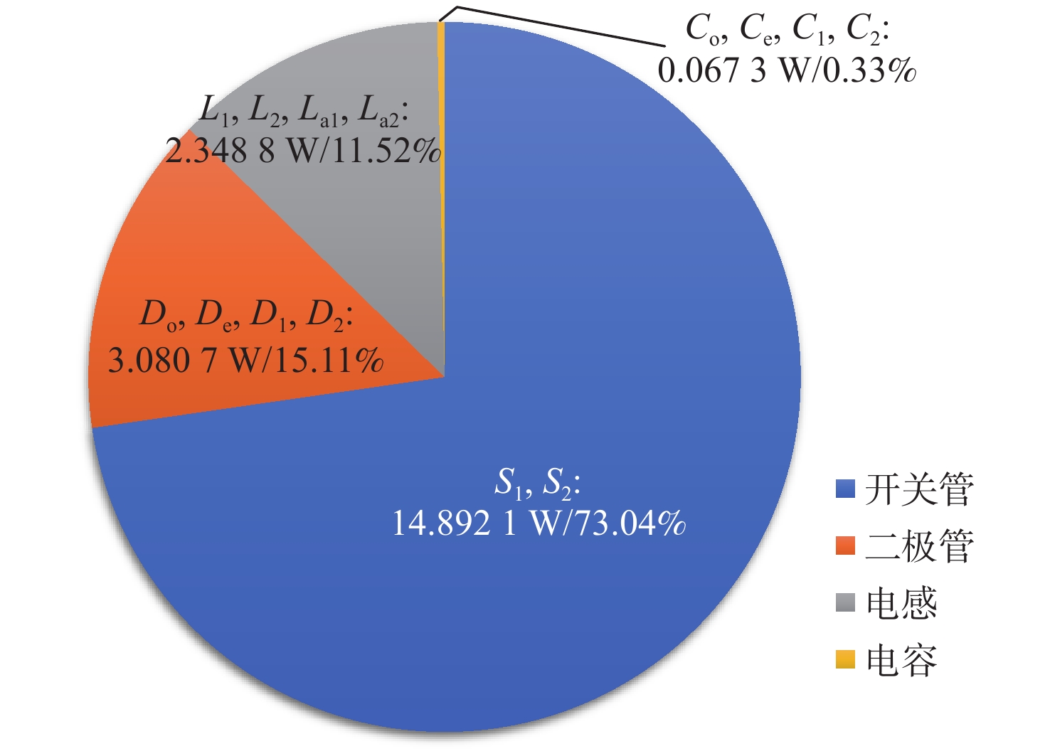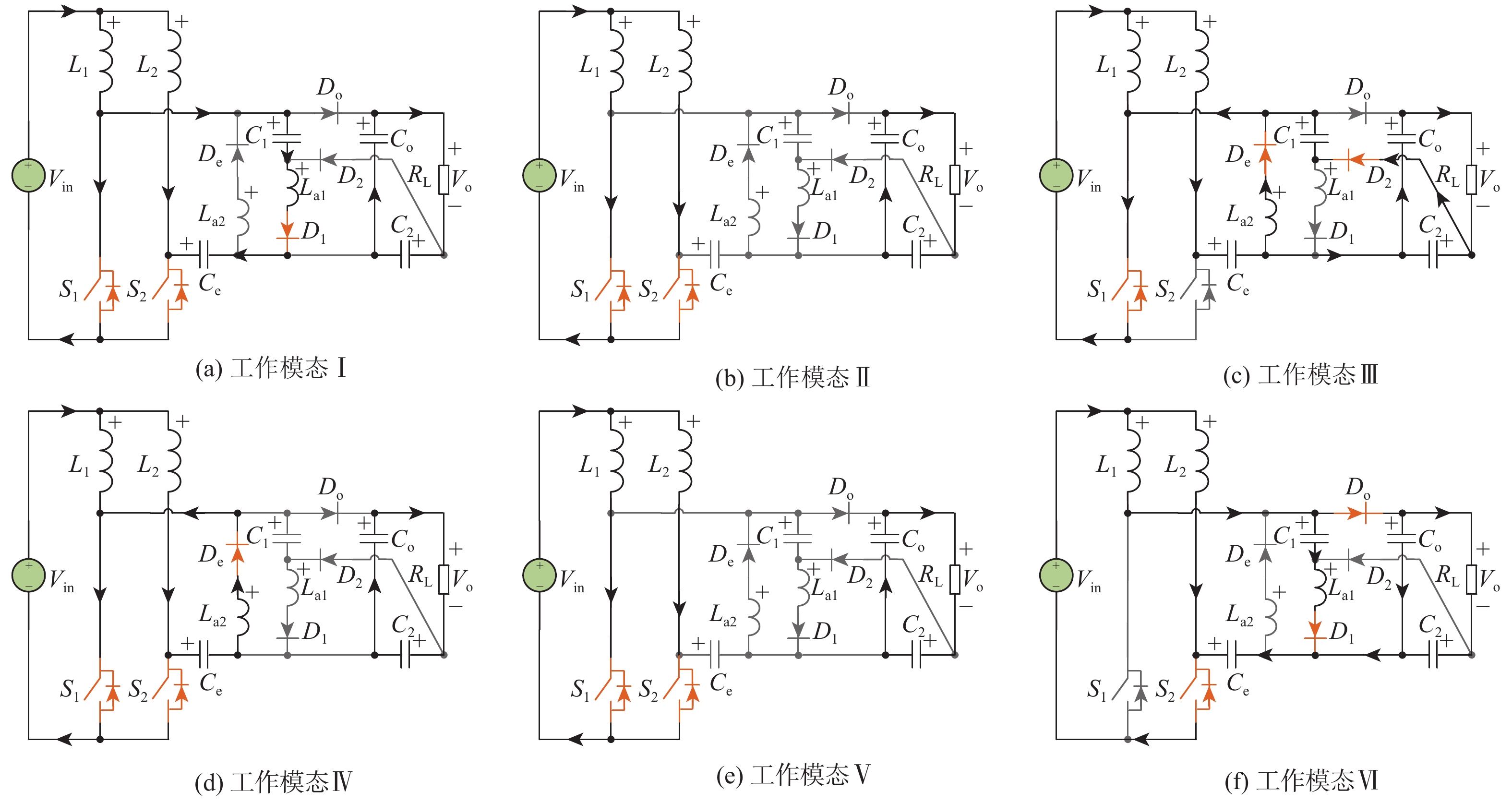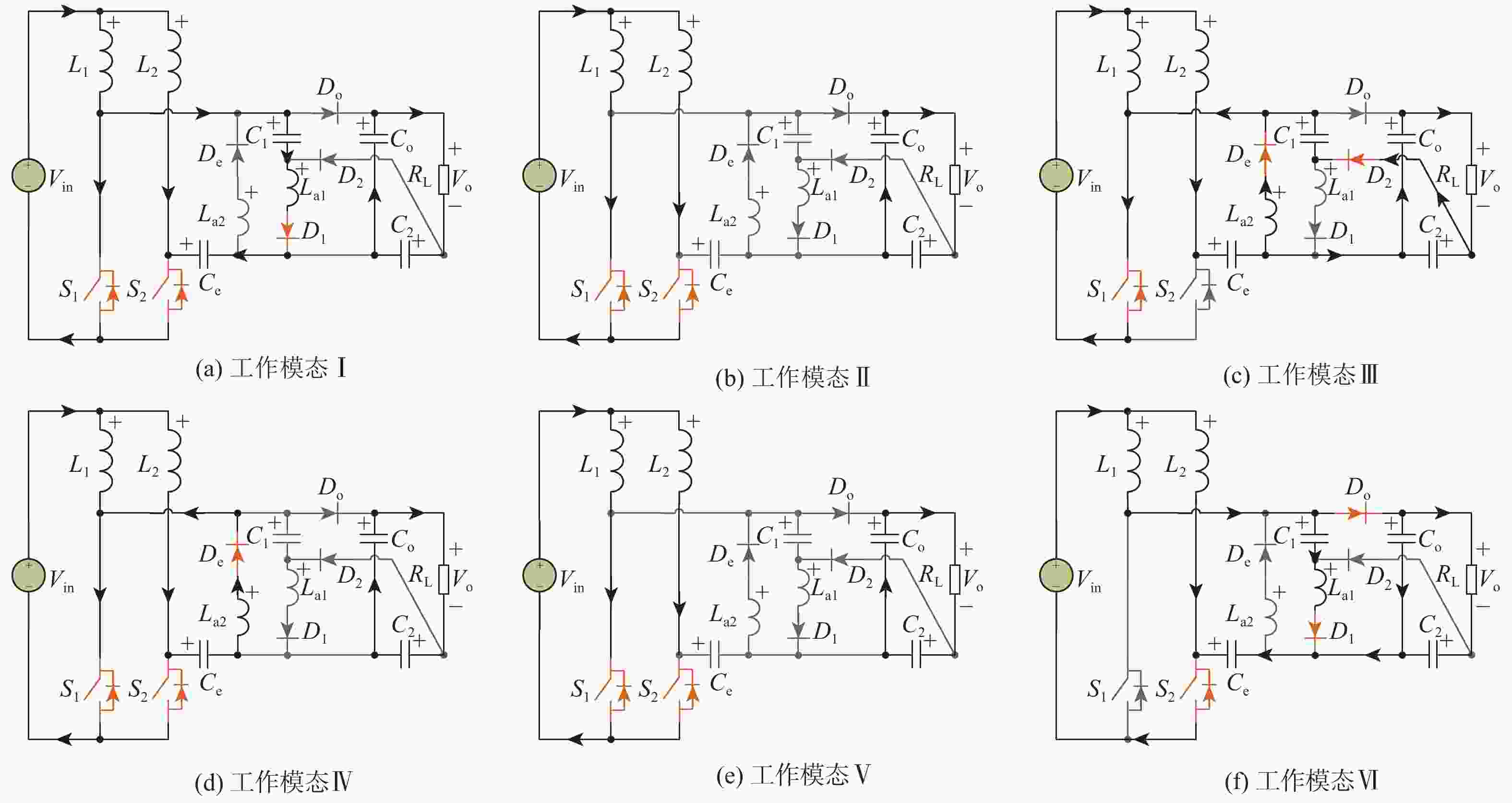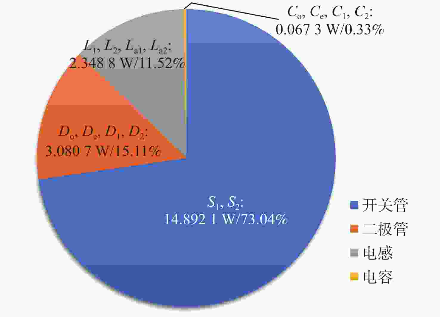 参数 数值 输入电压Vin/V 30 输出电压Vo/V 400 输出功率Po/W 400 开关频率fs/kHz 200 负载RL/Ω 400 电容C1,C2,Co,Ce/μF 20 辅助电感La1,La2/μH 5 电感L1,L2/µH 500 表 2 不同软开关交错型直流升压变换器对比