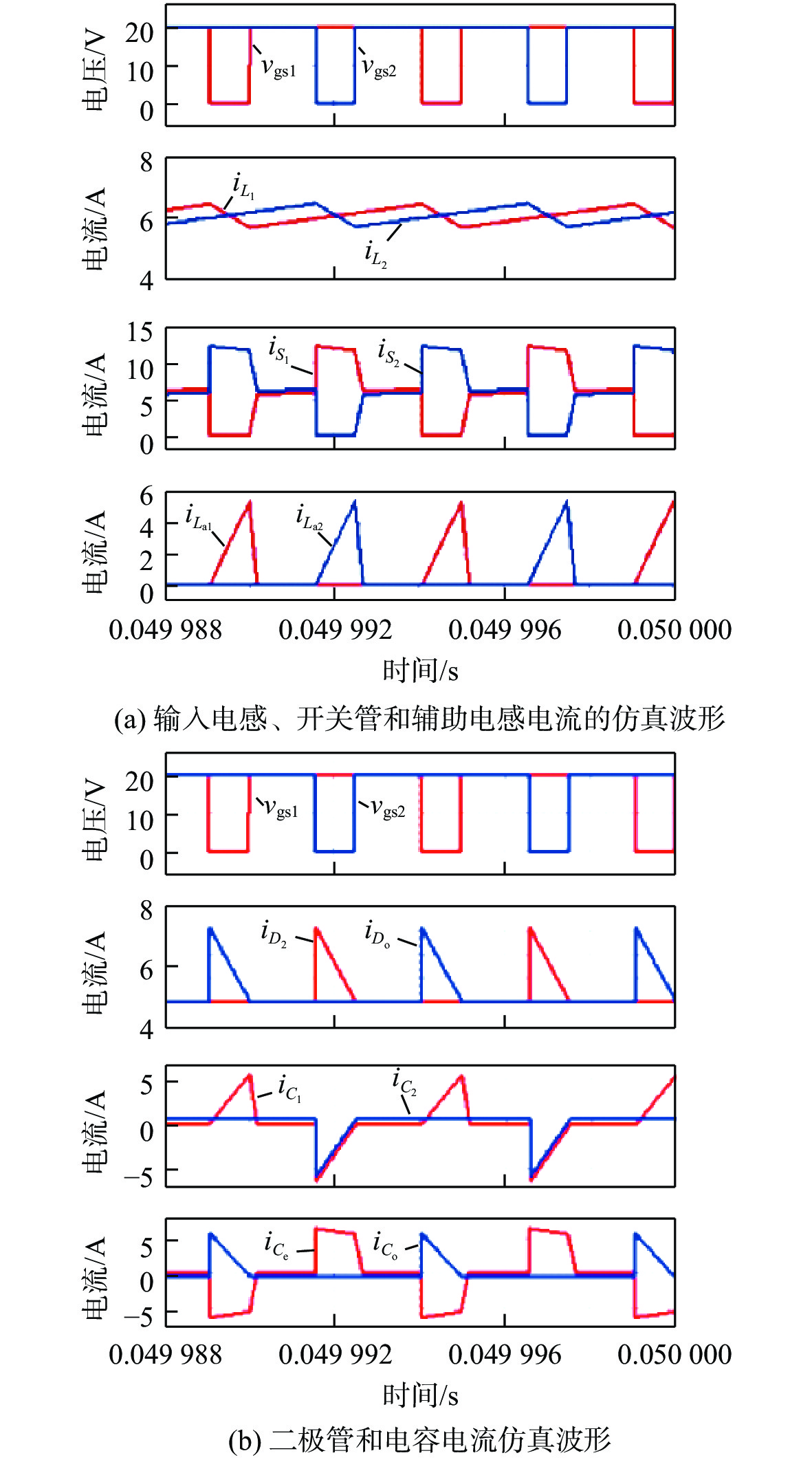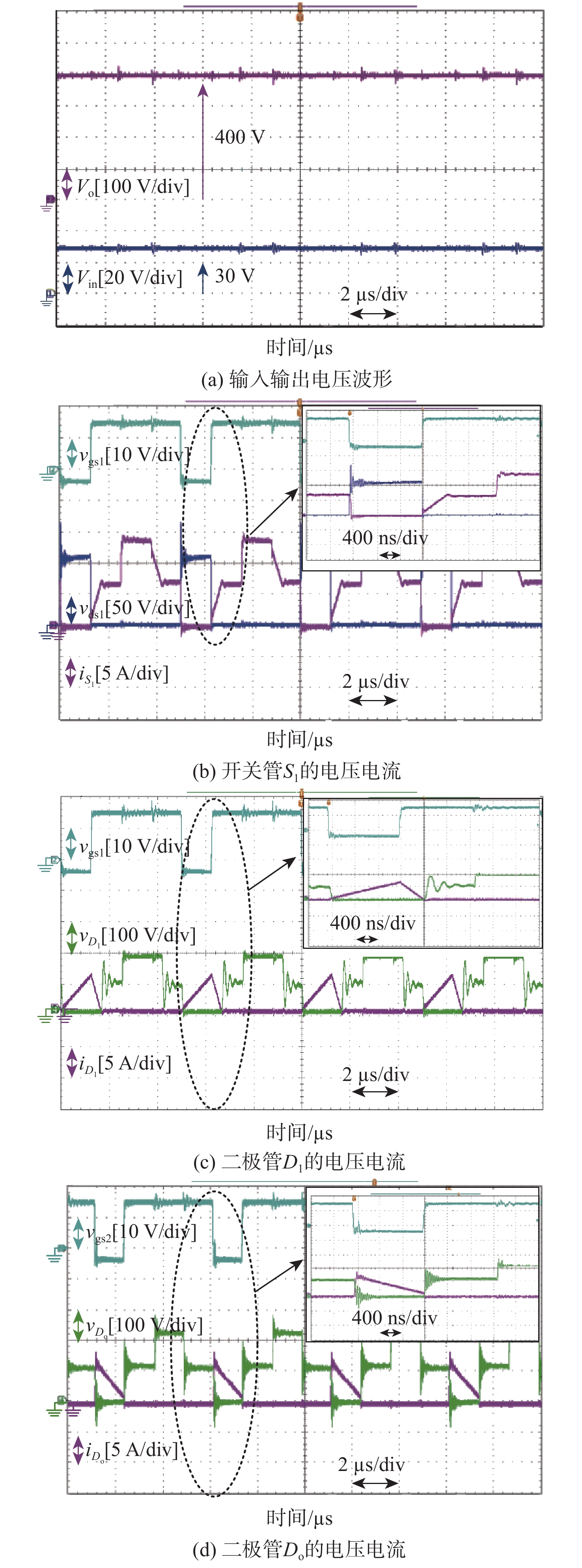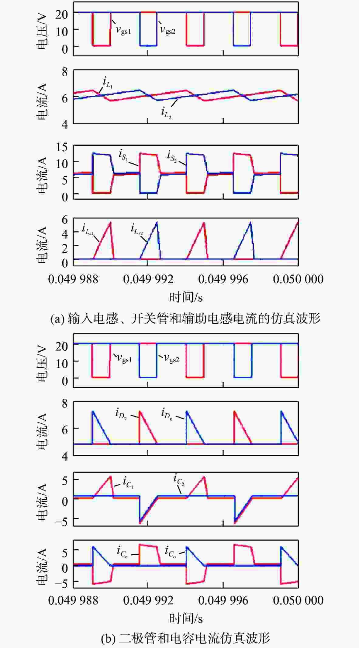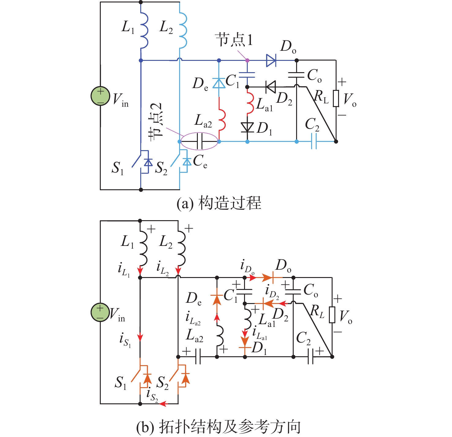 参数 数值 输入电压Vin/V 30 输出电压Vo/V 400 输出功率Po/W 400 开关频率fs/kHz 200 负载RL/Ω 400 电容C1,C2,Co,Ce/μF 20 辅助电感La1,La2/μH 5 电感L1,L2/µH 500 表 2 不同软开关交错型直流升压变换器对比