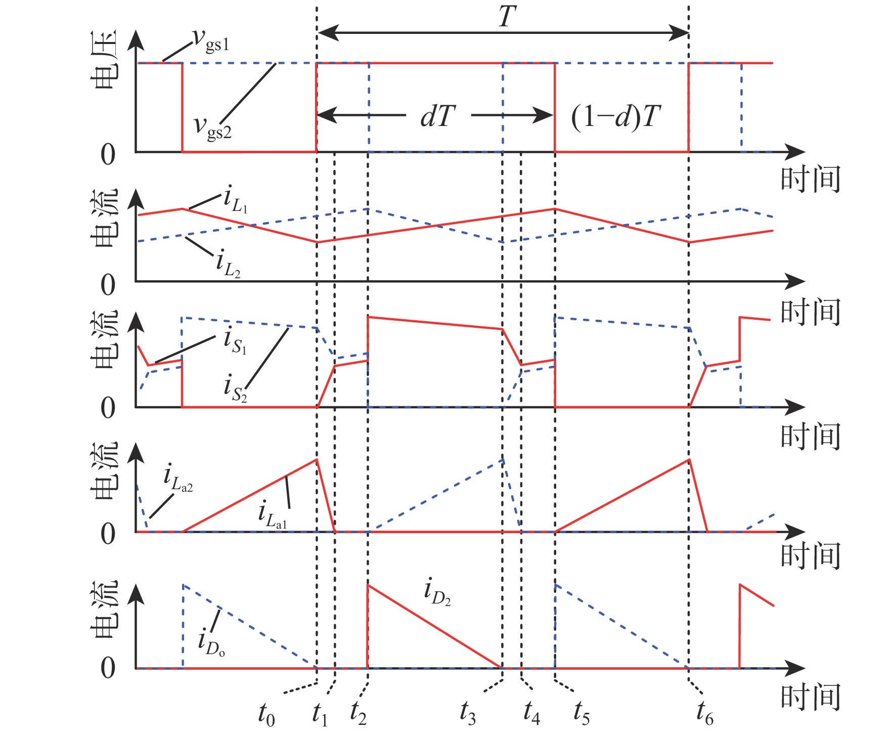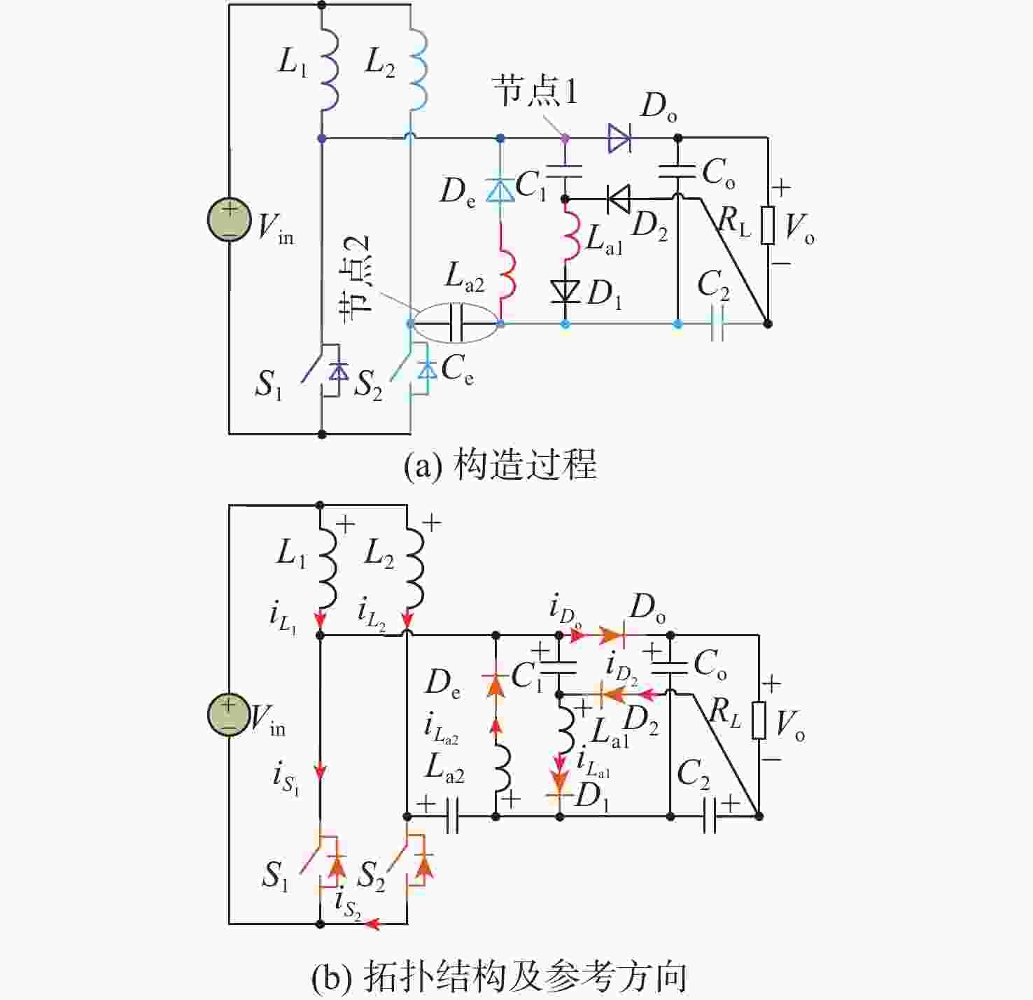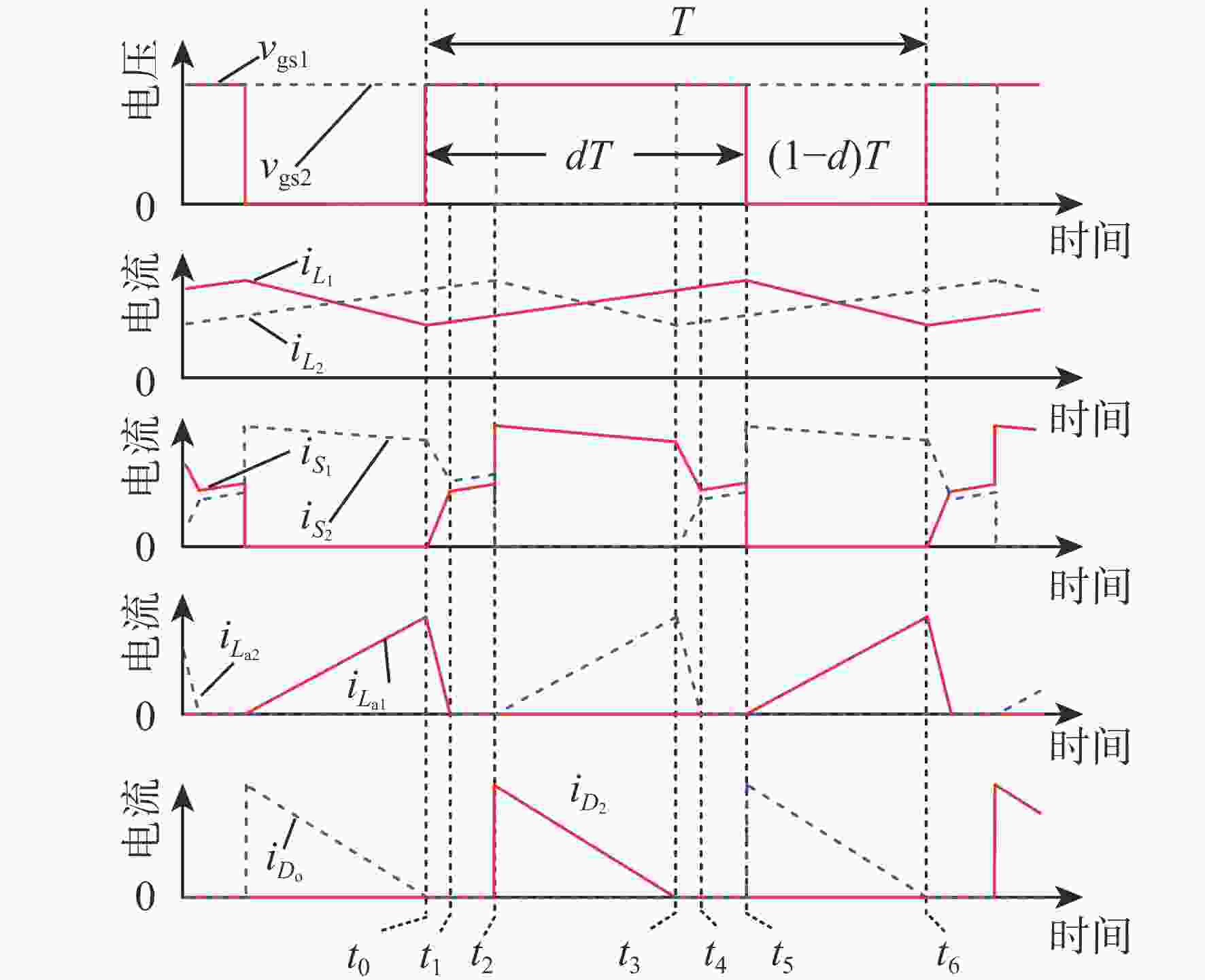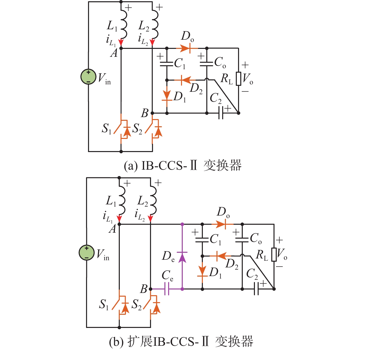 谐振电流尖峰传统的谐振软开关交错型直流升压变换器[28] Lr1, Lr2, Cr1, Cr2, ZCS 硬关断 ZVS ZVS 是 具有辅助电感的软开关交错型直流升压变换器[29] Lr1, Lr2, Lr3, Lr4 ZVS 硬关断 硬开通 ZCS 是 具有耦合电感的软开关交错型直流升压变换器[30] Lp1, Ls1, Lk1, Lp2, Ls2, Lk2 ZVS 硬关断 ZCS ZCS 否 具有耦合电感的软开关交错型直流升压变换器[31] ZVS 硬关断 ZVS ZCS 所提电流均衡NRL软开关IB-CCS-Ⅱ直流升压变换器 La1, La2 ZCS 硬关断 硬开通 ZCS 否 -