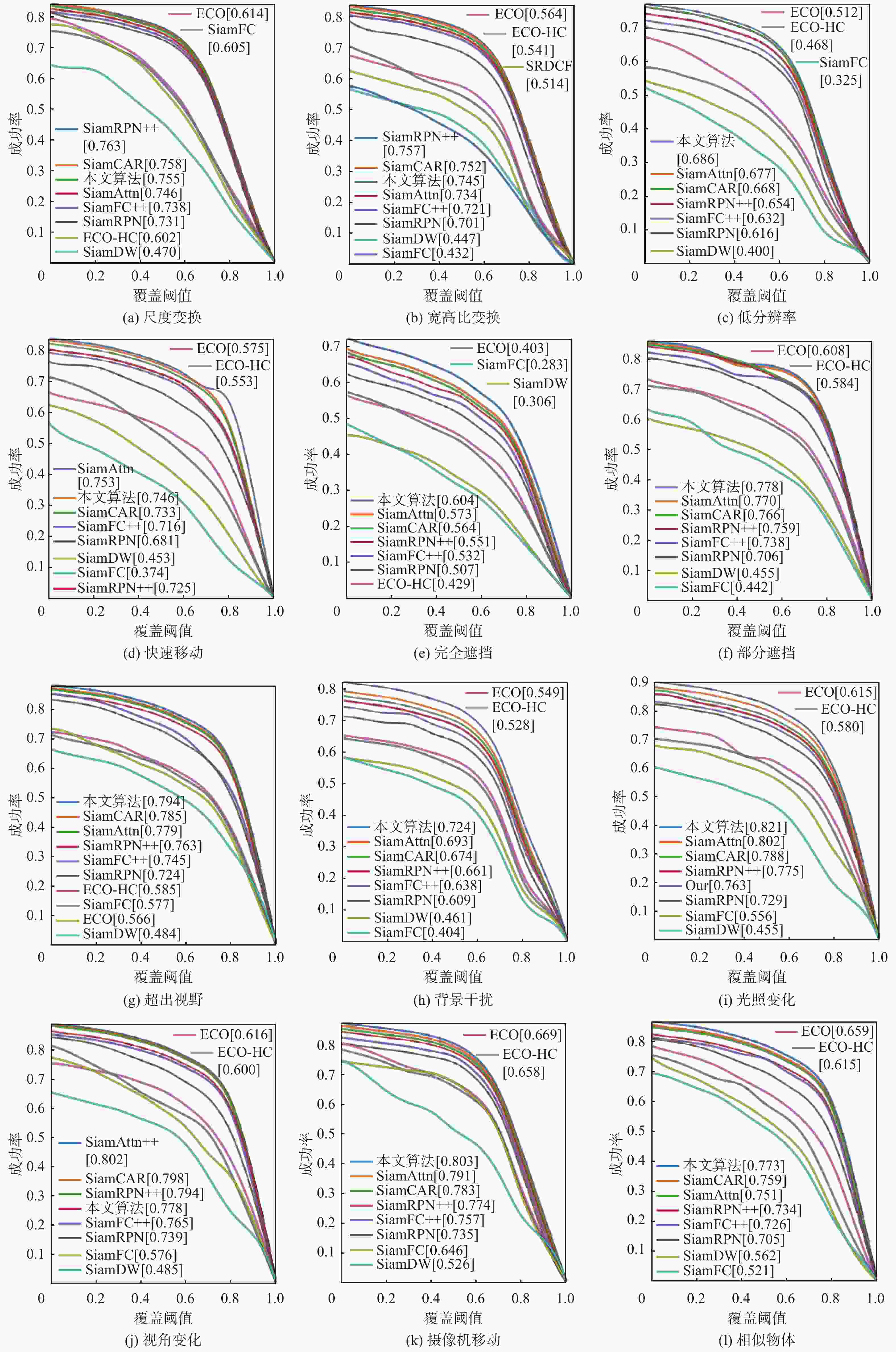 算法 精确率 成功率 Siamese 0.704 0.672 Siamese+FA 0.792 0.734 Siamese+PA 0.769 0.715 本文算法 0.832 0.771 -