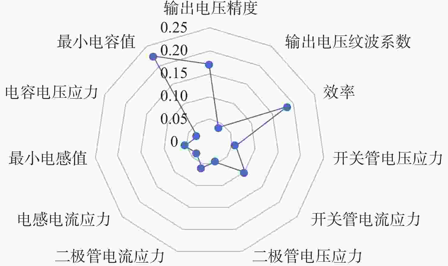 指标 熵 偏差度 权重 输出电压精度A1 0.9949 0.0051 0.0555 输出电压纹波系数A2 0.9999 0.0001 0.0013 效率B1 1 0 0.0001 开关管电压应力C1 0.9931 0.0069 0.0748 开关管电流应力C2 0.9959 0.0041 0.0445 二极管电压应力D1 0.9931 0.0069 0.0744 二极管电流应力D2 0.9964 0.0036 0.0395 电感电流应力E1 0.996 0.004 0.0439 最小电感值E2 0.9922 0.0078 0.0841 电容电压应力E3 0.9956 0.0044 0.0479 最小电容值E4 0.9508 0.0492 0.534 表 8 指标的组合权重