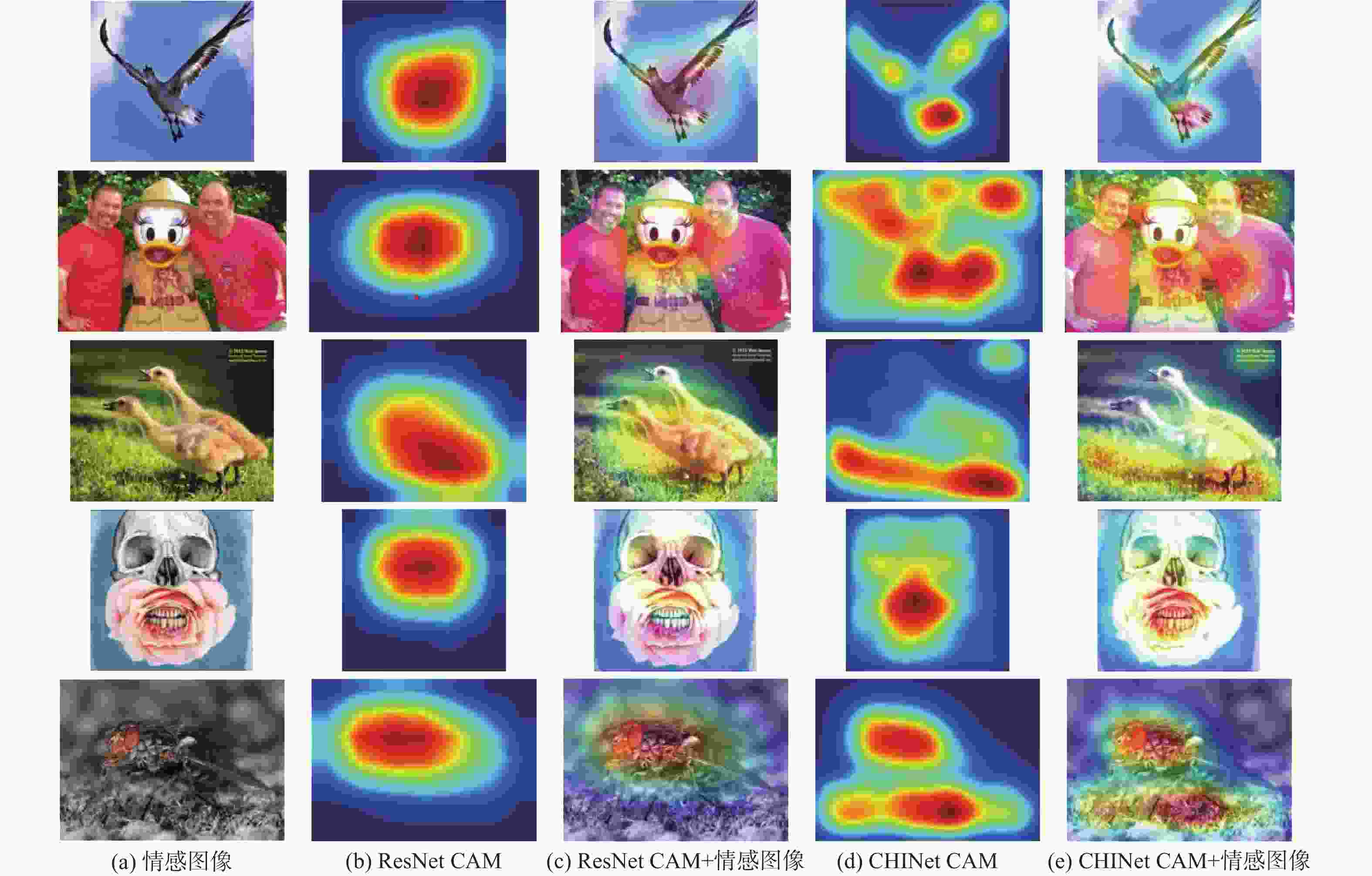 模型 网络 准确率/% 基线模型 AlexNet[16] 49.54 VGGNet-19[36] 61.74 ResNet[34] 53.08 Inception[38] 60.12 Inception-Resnet[39] 62.77 对比模型 DeepSentiBank[21] 51.29 PDANet[40] 69.42 MKN[19] 63.92 CycleEmotionGAN[41] 66.79 Deep metric learning[42] 68.37 MldrNet[16] 67.24 OSSCM[22] 69.32 WSCNet[3] 70.07 VSF[23] 70.46 MSRCA[30] 69.05 MLR[18] 67.49 本文模型 CHINet w/o G 69.94 CHINet w/o L 70.32 CHINet G&L 71.56 -