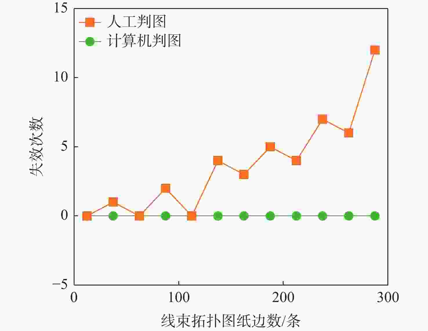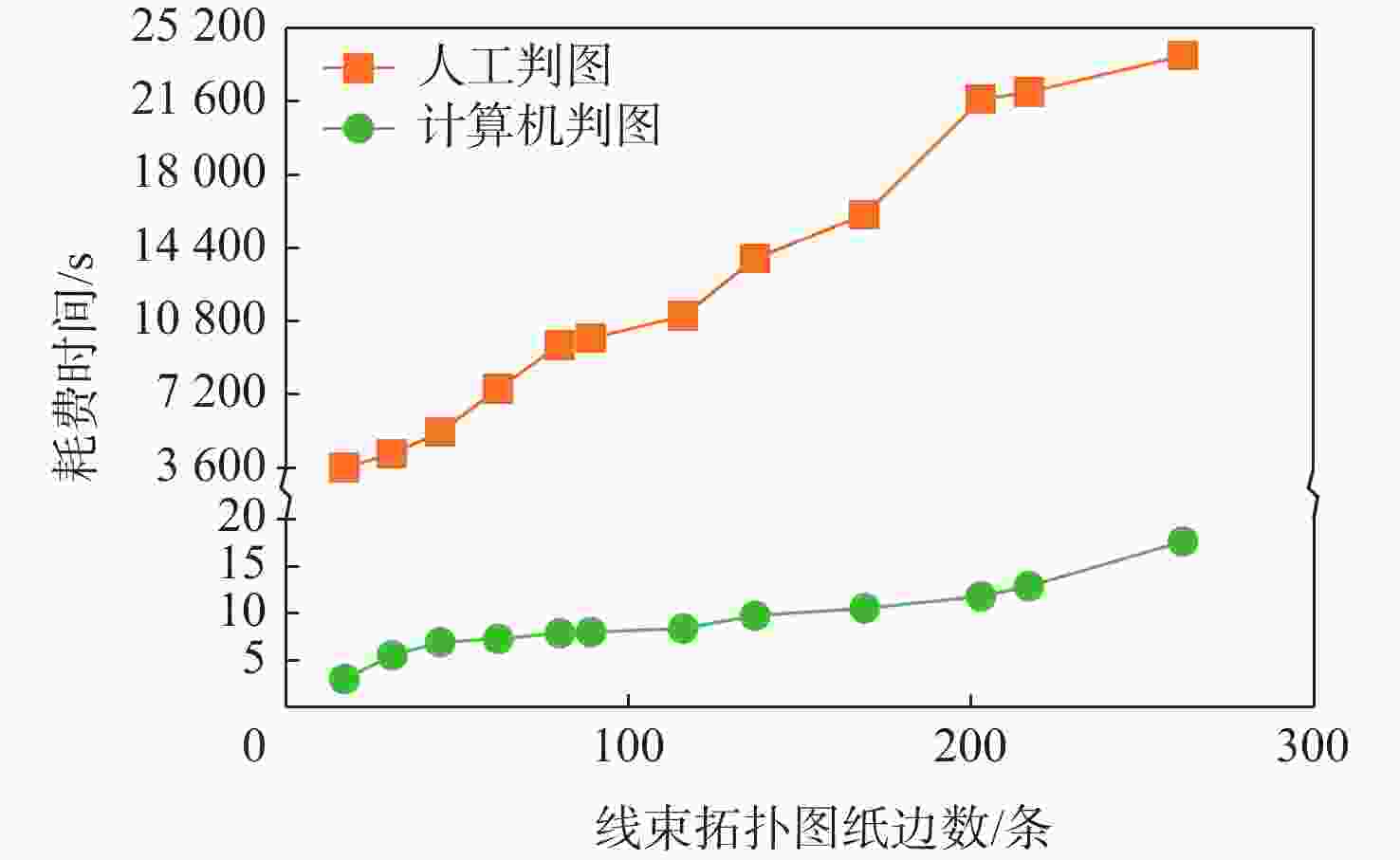 实验编号 线束拓扑图纸边数/条 制图逻辑检查时间/s 1 17 0.85 2 31 1.09 3 45 1.32 4 62 1.39 5 80 1.53 6 89 1.54 7 116 1.76 8 137 2.17 9 169 2.61 10 203 3.25 11 217 3.37 12 262 4.28 表 5 图语义分析结果