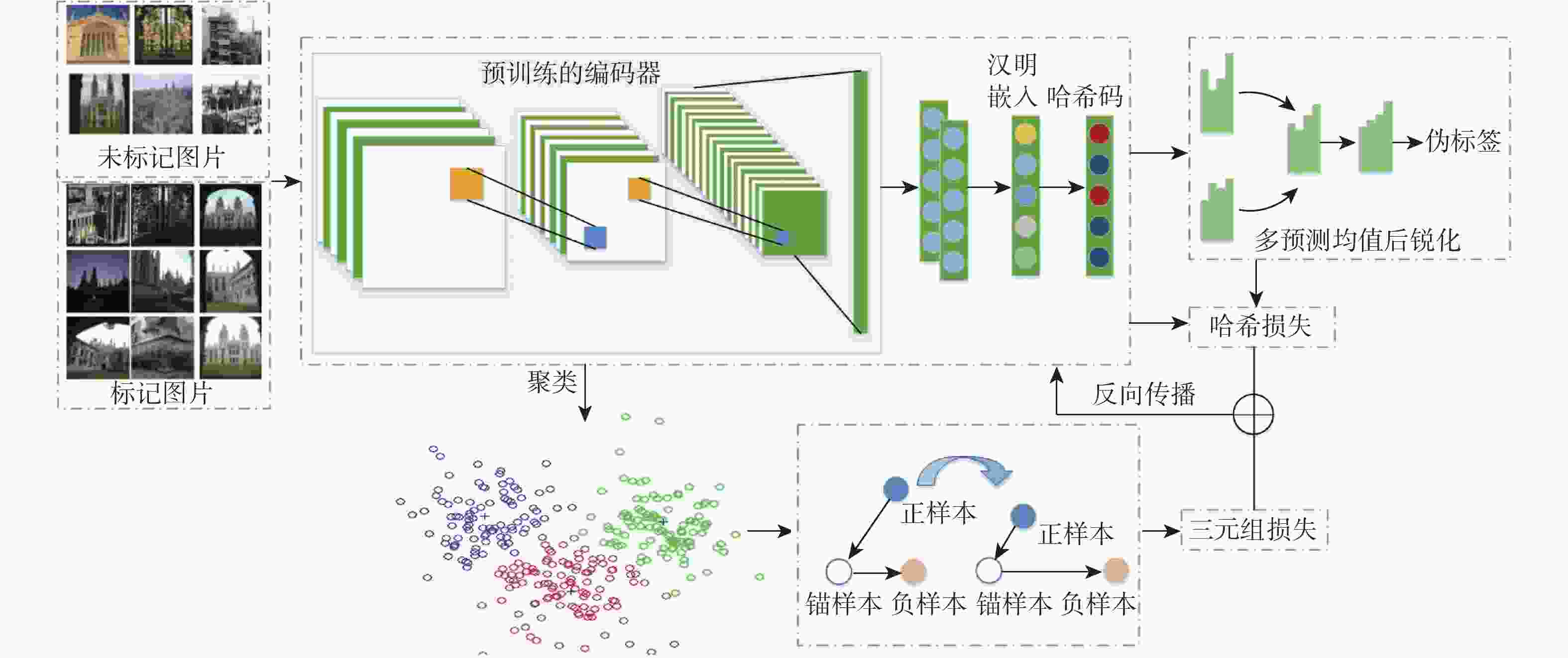 目前大多数基于深度学习的图像检索方法是在有监督条件下进行的,需要大量的标签数据,但实际应用中获取大量标签数据困难且成本高昂。此外,现有基于欧氏距离的三元组损失计算不够精确,使模型对图像相似性学习的能力欠佳。采用熵最小化伪标签、三元组损失和半监督学习技术,提出了一种新的半监督哈希图像检索模型(SSITL)。应用多阶段模型联合与锐化技术为未标记数据生成伪标签,并通过熵最小化处理以提高伪标签的置信度。同时,利用标记数据和未标记数据的聚类结果选择三元组,并采用基于通道权重矩阵的三元组哈希损失(CWT loss)帮助SSITL学习图像相似性。为了生成更好的哈希码,在2个汉明嵌入间使用MixUp进行混洗得到新的汉明嵌入以改善图像检索性能。实验结果表明:相较于其他方法,SSITL在相仿的时间开销下,在CIFAR-10和NUS-WIDE数据集上的检索平均准确率分别提高了1.2%和0.7%,强有力地验证了SSITL是一种优秀的半监督哈希图像检索模型。