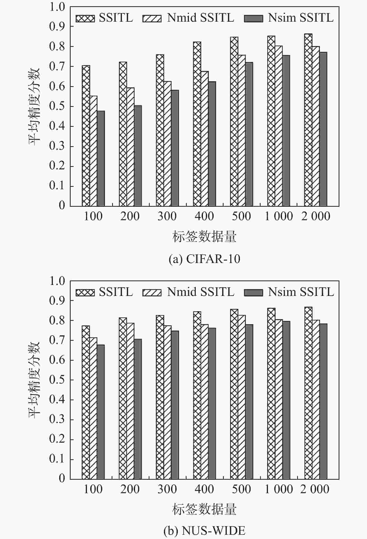 方法 CIFAR-10 12 bits 24 bits 32 bits 48 bits SSITL 0.818 0.838 0.853 0.854 Nmid SSITL 0.781 0.812 0.828 0.831 Nsim SSITL 0.737 0.764 0.785 0.778 方法 NUS-WIDE 12 bits 24 bits 32 bits 48 bits SSITL 0.838 0.857 0.880 0.873 Nmid SSITL 0.807 0.823 0.844 0.857 Nsim SSITL 0.775 0.788 0.815 0.820 表 4 CIFAR-10数据集上不同方法对不可见类的检索精度