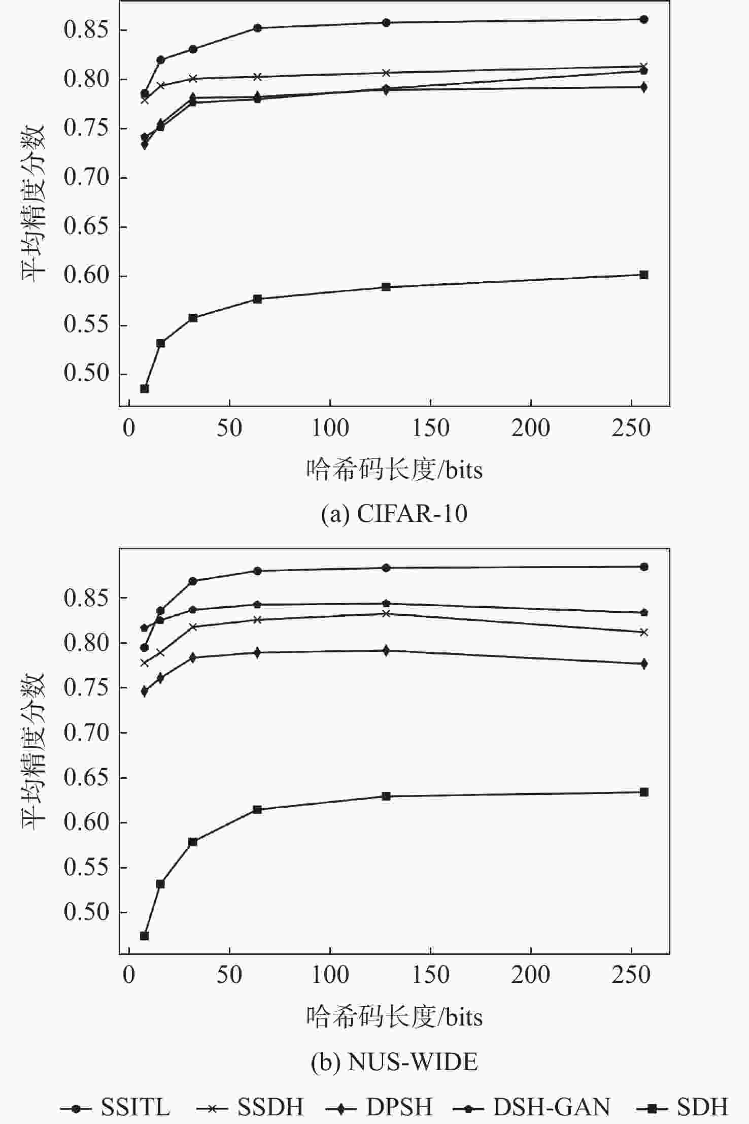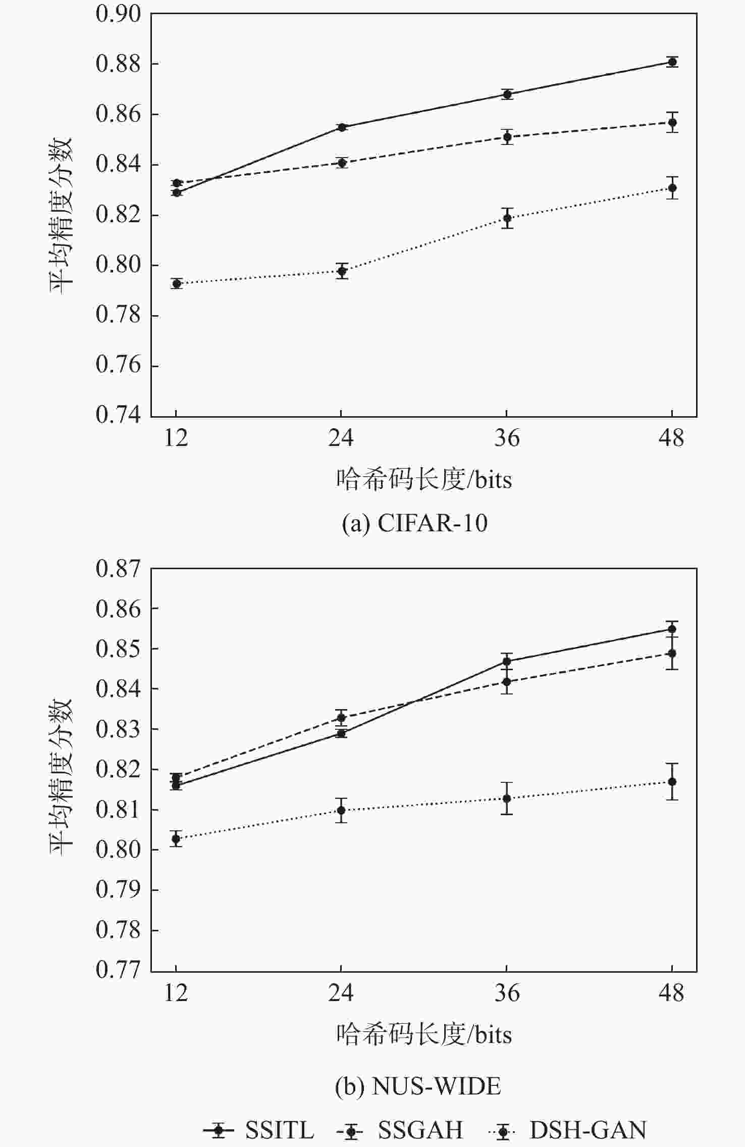 方法 NUS-WIDE 12 bits 24 bits 32 bits 48 bits SSITL 0.838 0.857 0.880 0.873 ABML[19] 0.835 0.851 0.872 0.869 CPQN[18] 0.833 0.849 0.869 0.870 BGDH[30] 0.805 0.824 0.826 0.833 DSH-GAN[31] 0.828 0.843 0.848 0.851 SSDH[17] 0.803 0.808 0.826 0.833 DPSH[27] 0.767 0.778 0.795 0.798 DSDH[29] 0.772 0.804 0.821 0.831 DRSCH[28] 0.616 0.623 0.627 0.627 SDH[25] 0.541 0.548 0.579 0.621 ITQ[26] 0.663 0.700 0.707 0.723 表 3 CIFAR-10和NUS-WIDE数据集上SSITL不同模型的平均精度分数