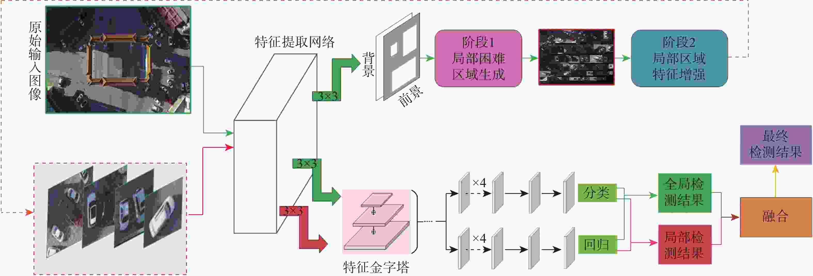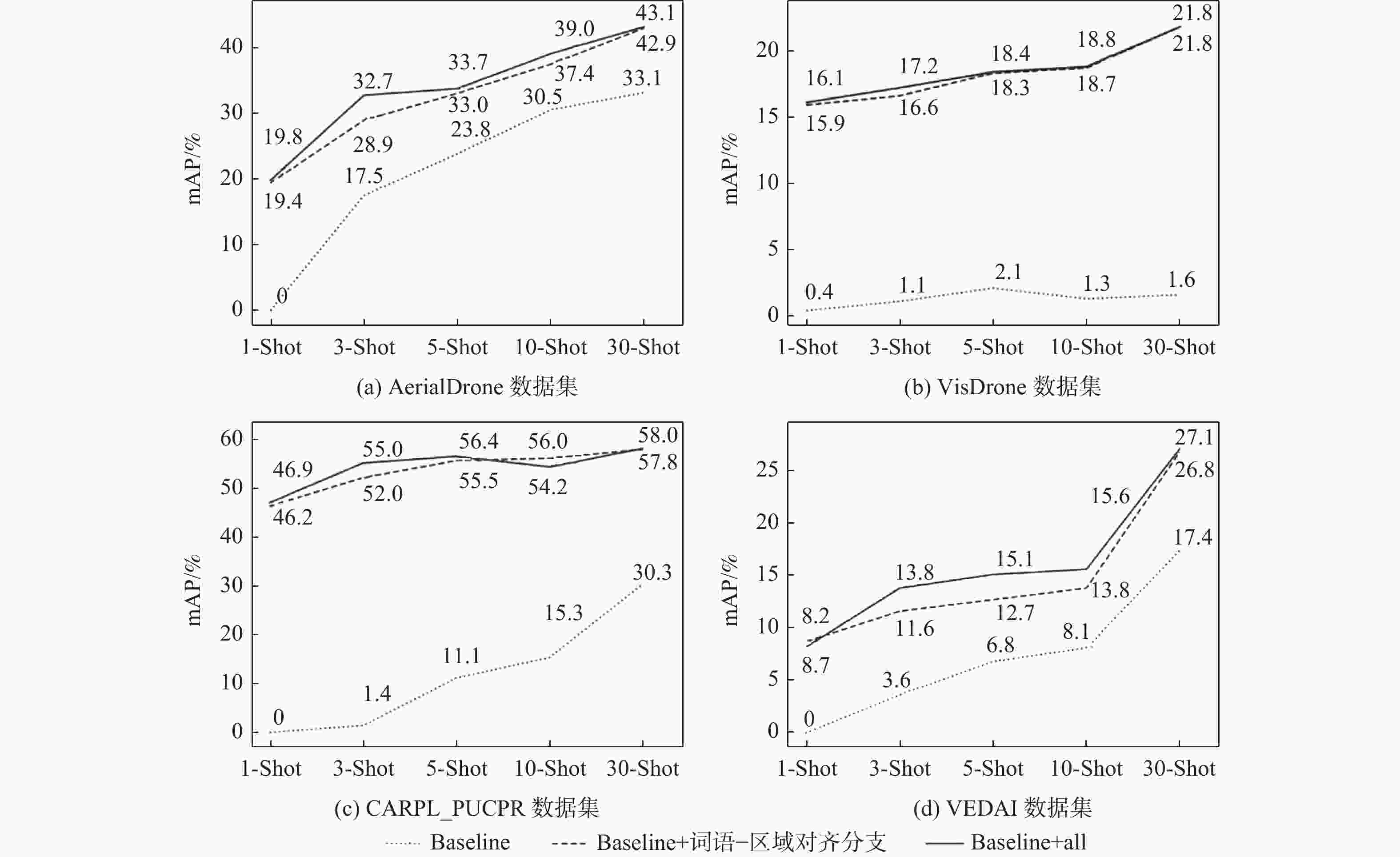 数据集 方法 mAP/% 1-shot 3-shot 5-shot 10-shot 30-shot AerialDrone[5] Baseline 0 17.5 23.8 30.5 33.1 Baseline + 词语-区域对齐分支 19.4 28.9 33.0 37.4 42.9 Baseline + all 19.8 32.7 33.7 39.0 43.1 VisDrone-DET[1] Baseline 0.4 1.1 2.1 1.3 1.6 Baseline + 词语-区域对齐分支 15.9 16.6 18.3 18.7 21.8 Baseline + all 16.1 17.2 18.4 18.8 21.8 CARPK_PUCPR[3] Baseline 0 1.4 11.1 15.3 30.3 Baseline + 词语-区域对齐分支 46.2 52.0 55.5 56.0 57.8 Baseline + all 46.9 55.0 56.4 54.2 58.0 VEDAI[4] Baseline 0 3.6 6.8 8.1 17.4 Baseline + 词语-区域对齐分支 8.7 11.6 12.7 13.8 26.8 Baseline + all 8.2 13.8 15.1 15.6 27.1 表 3 与经典航拍图像目标检测方法对比