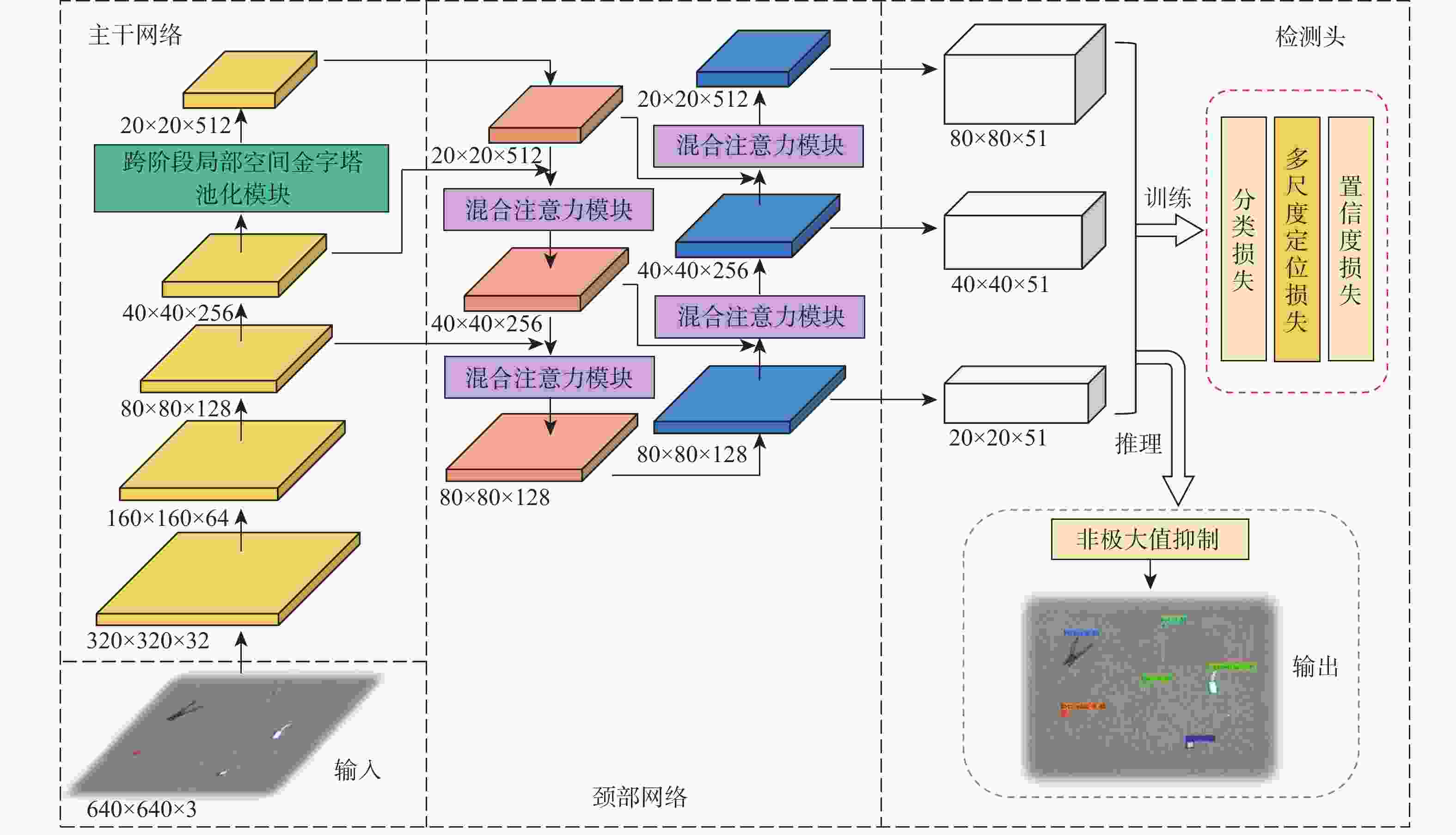 参数 数值 输入图片尺寸/像素 640×640 批处理大小 16 优化器 SGD 初始学习率 0.01 动量 0.937 权重衰减 0.000 5 训练轮数 300 表 2 聚类前后先验框尺寸