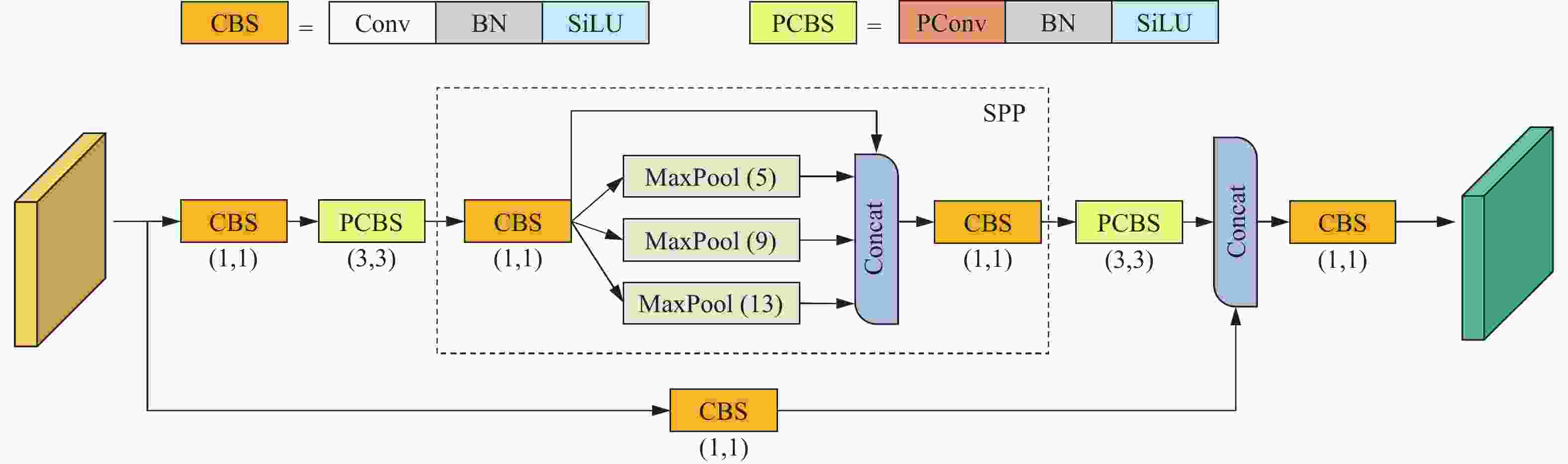 检测层 默认先验框 聚类后的先验框 P3 (10,13), (16,30), (33,23) (11,11), (17,17), (26,14) P4 (30,61), (62,45), (59,119) (23,24), (37,35), (78,28) P5 (116,90), (156,198), (373,326) (31,74), (66,56), (92,95) 表 3 不同池化模块效果对比