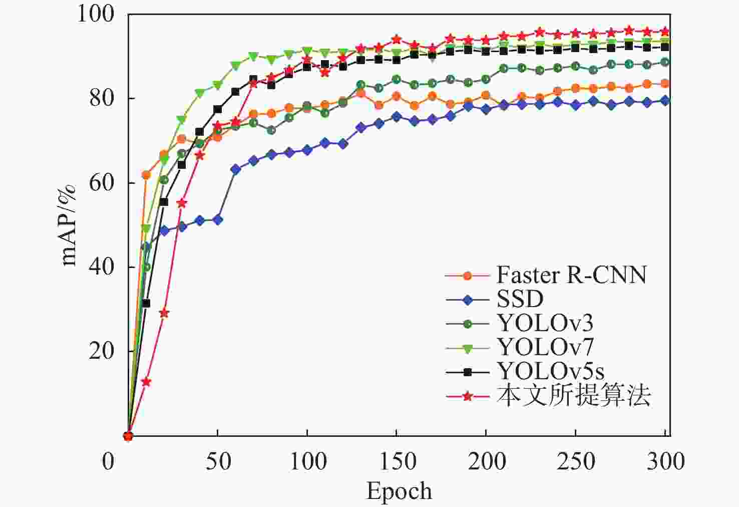 模型 主干网络 P/% R/% mAP/% 检测速速/(帧·s−1) 参数量/M Faster R-CNN ResNet50 69.67 91.90 83.54 11 136.9×106 SSD VGG-16 89.62 68.27 79.55 69 25.0×106 YOLOv3 Darknet53 91.28 79.12 88.64 36 61.6×106 YOLOv5s CSPDarknet53 95.66 78.62 92.15 80 7.2×106 YOLOv7 CBS+ELAN+MP+SPPCSPC 93.48 89.19 93.59 28 36.9×106 本文所提算法 CBS+C3+P-SPPCSPC 95.80 94.31 95.83 68 9.3×106 -
