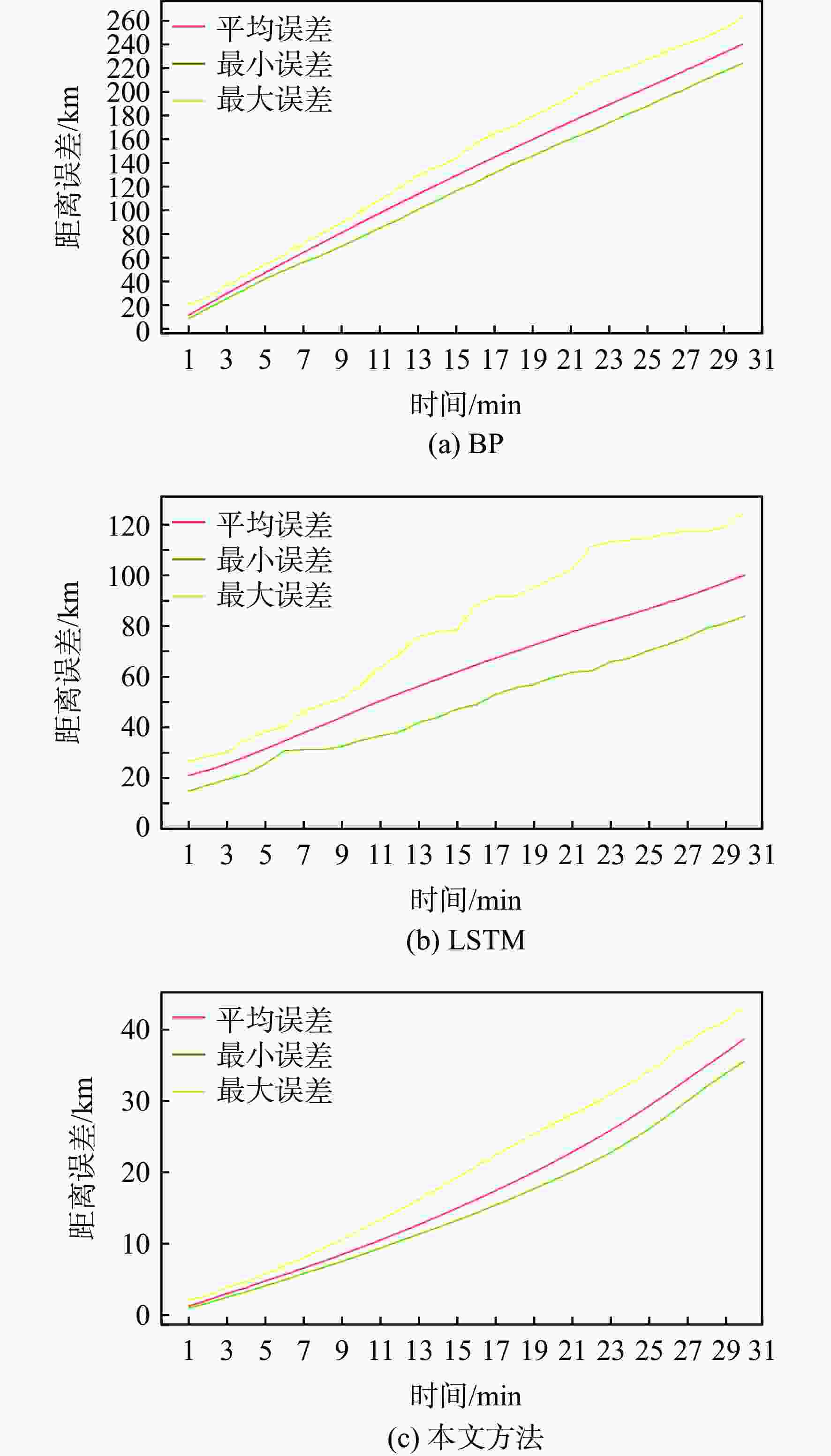 对比参数 方法 经度/(°) 维度/(°) 航速/(m·s−1) 航向/(°) 点位距离/km MSE BP 0.0357 0.0193 0.0949 78.7890 637.3890 LSTM 0.0099 0.0012 0.0972 61.2626 113.7072 本文方法 0.0005 0.0007 0.0851 34.1310 13.5272 最大误差 BP 0.2571 0.2827 0.9429 55.8103 35.8939 LSTM 0.1559 0.0657 0.9872 62.2083 17.0231 本文方法 0.1515 0.0242 0.7280 32.0447 18.4168 最小误差 BP 0.0294 0.0005 0.0005 0.0226 10.9806 LSTM 0.0336 0.0004 0.0006 0.0318 6.8273 本文方法 0.0001 0.0001 0.0005 0.0135 0.5031 平均误差 BP 0.1811 0.1228 0.1119 4.9629 23.9867 LSTM 0.0980 0.0123 0.1066 4.0758 10.5349 本文方法 0.0133 0.0082 0.0887 3.1775 2.7426 -