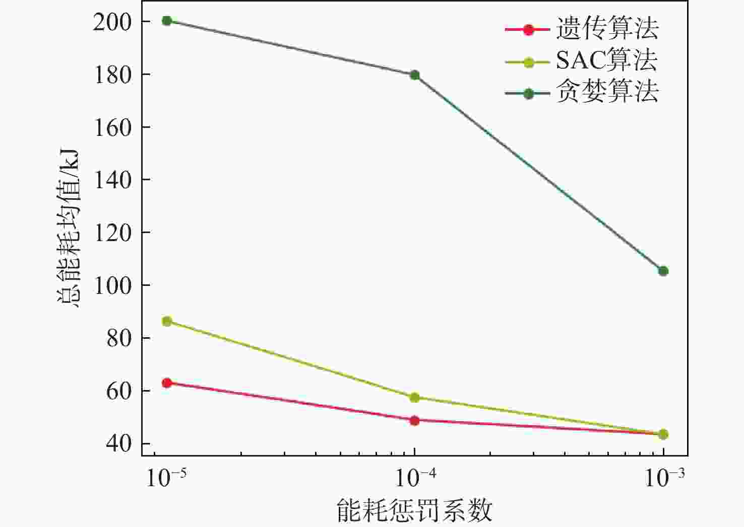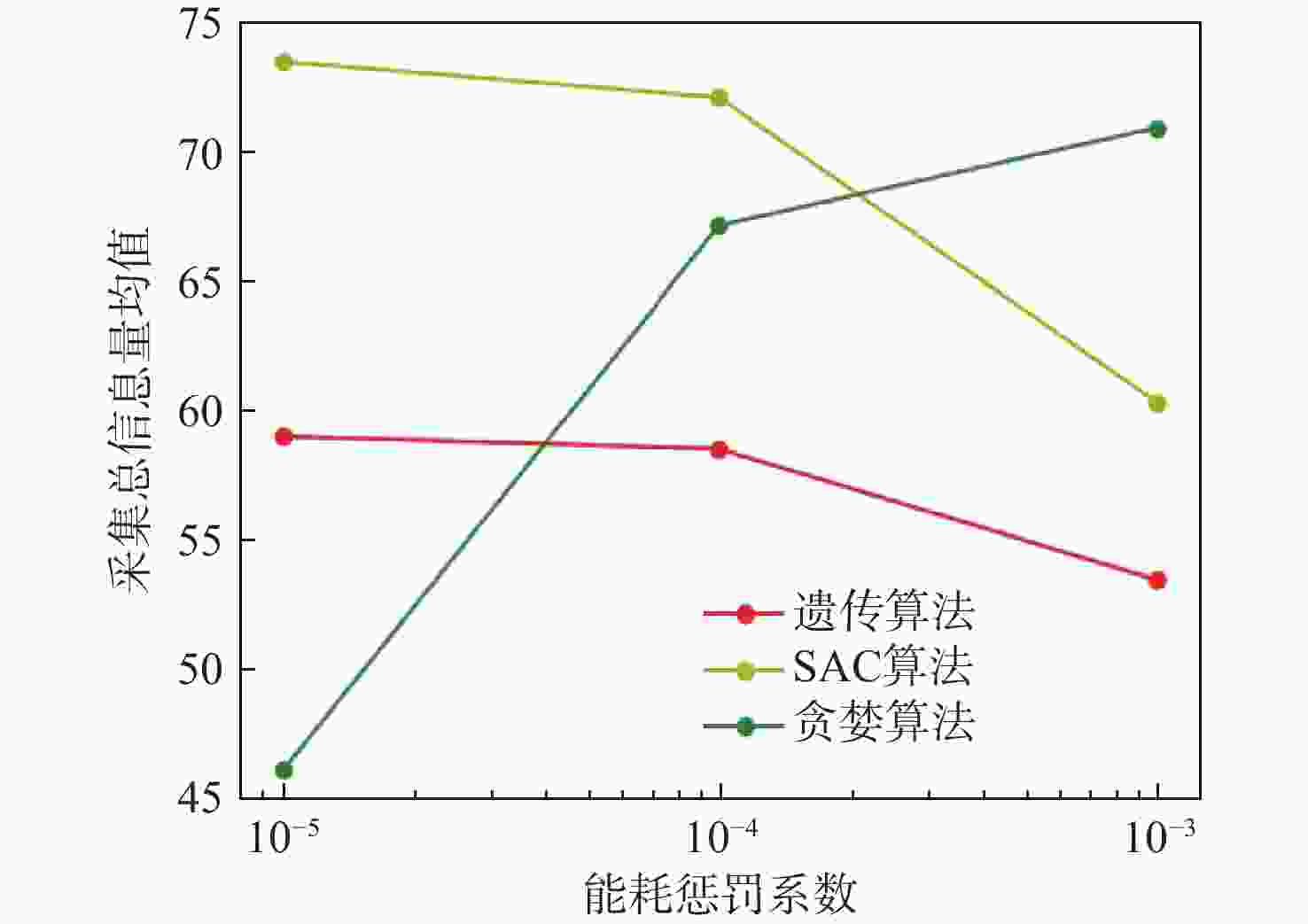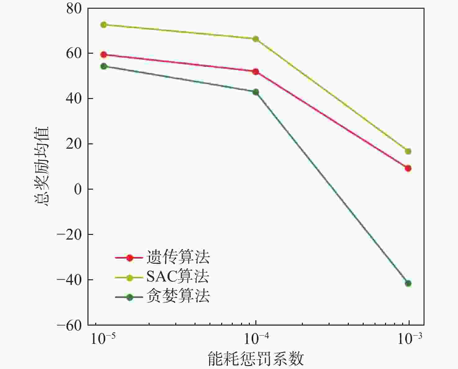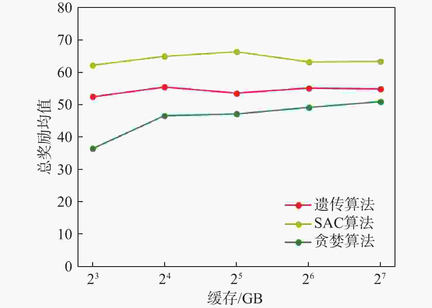 算法 缓存/GB 奖励 能耗/kJ 采集信息量 遗传算法 8 52.79±3.26 83.10±0 61.10±3.27 16 55.04±3.02 64.40±0 61.48±3.02 32 53.18±3.31 48.95±0 58.08±3.31 64 55.37±3.42 37.82±0 59.15±3.42 128 54.77±3.42 36.32±0 58.40±3.42 贪婪算法 8 36.39±3.29 143.32±23.10 50.72±3.87 16 46.56±3.71 172.39±18.79 63.80±3.73 32 47.10±3.93 179.48±20.72 65.05±3.52 64 49.11±3.41 119.23±15.29 61.03±3.04 128 50.90±3.03 96.51±14.85 61.55±3.11 SAC算法 8 62.10±2.42 88.86±6.58 70.97±2.33 16 64.83±2.93 71.29±13.10 71.96±2.28 32 66.25±1.91 59.17±5.51 72.17±1.86 64 63.12±2.79 45.44±8.72 67.66±2.19 128 63.24±2.14 40.08±5.89 67.24±2.16 -