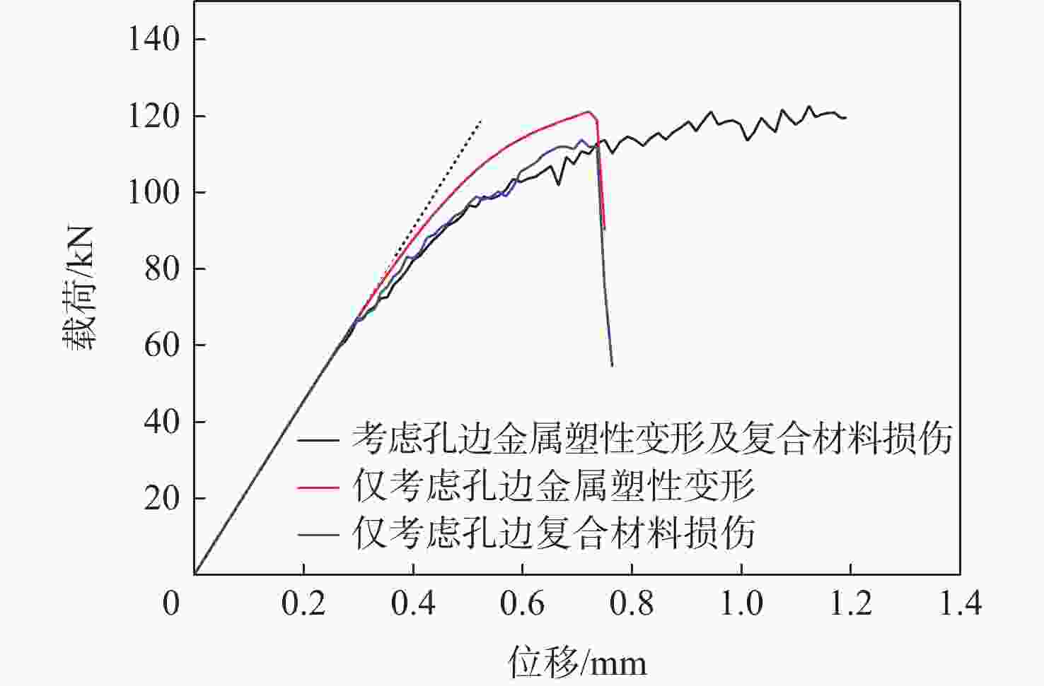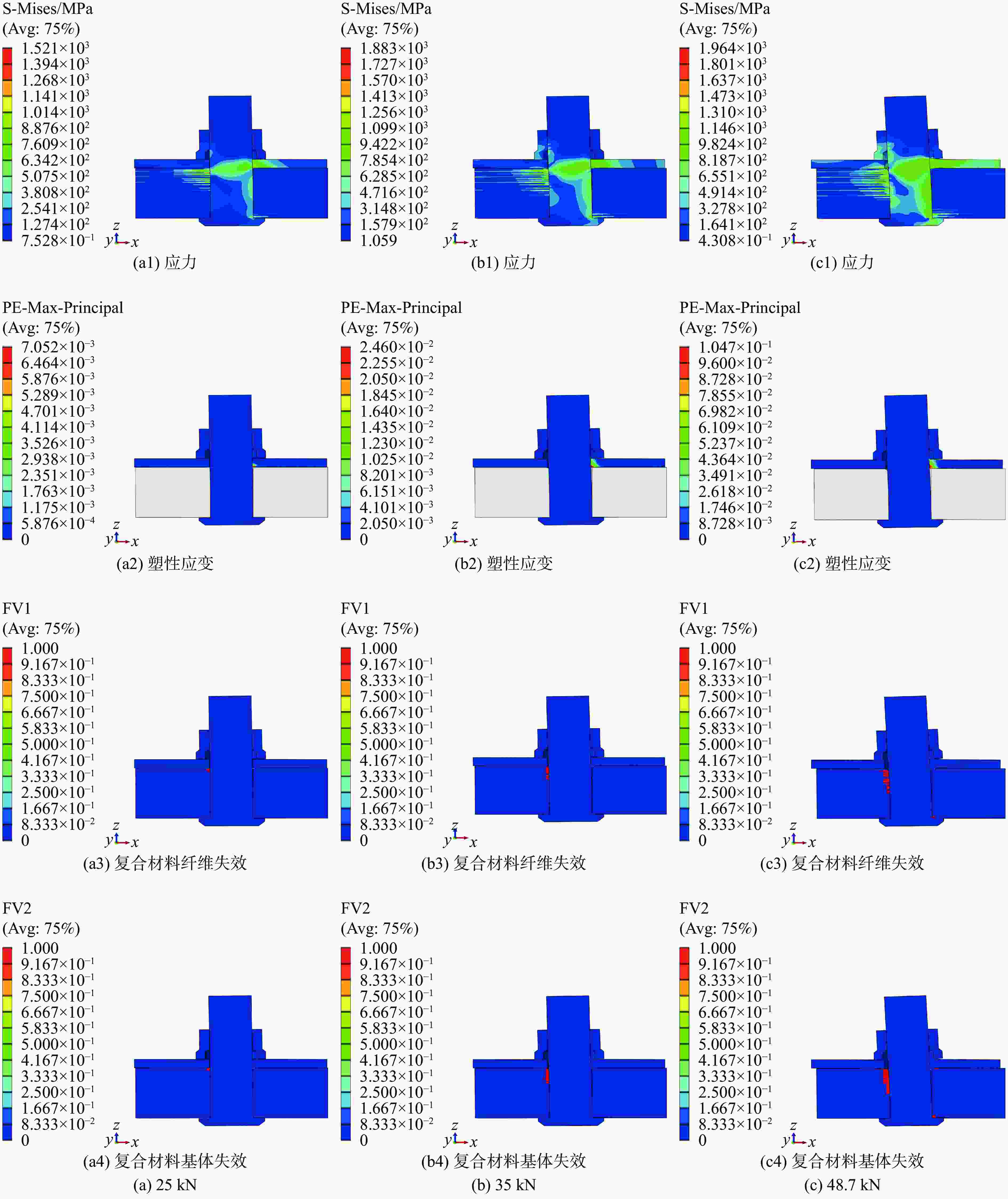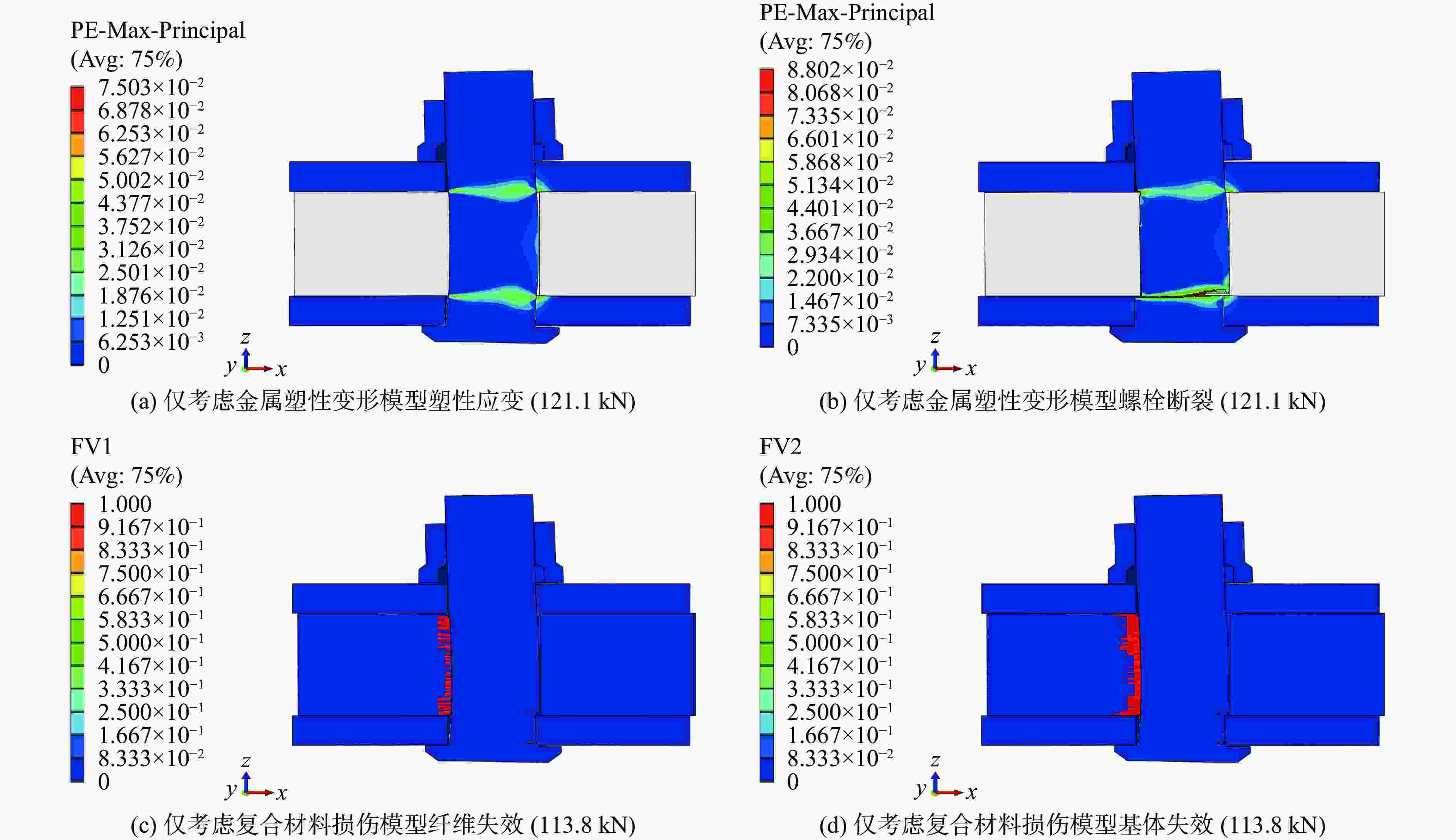 材料沿纤维方向弹性模量E11/GPa 163.5 垂直纤维方向弹性模量E22/GPa 9.00 面内剪切模量G12/GPa 4.14 面内泊松比ν12 0.319 厚度t/mm 0.191 单层0°拉伸强度/MPa 3071.0 单层0°压缩强度/MPa 1747.0 单层90°拉伸强度/MPa 88.0 单层90°压缩强度/MPa 271.0 单层面内剪切强度/MPa 131.0 Ti-6Al-4V 拉压平均弹性模量E/MPa 116522 剪切模量G/MPa 44816 泊松比ν 0.31 板材拉伸极限强度/MPa 931 板材剪切极限强度/MPa 545 紧固件拉伸极限强度/MPa 1103 紧固件剪切极限强度/MPa 655 7050-T7451 拉压平均弹性模量E/MPa 71016 剪切模量G/MPa 26890 泊松比ν 0.33 拉伸极限强度/MPa 510 剪切极限强度/MPa 290 表 2 复合材料损伤后性能退化方案