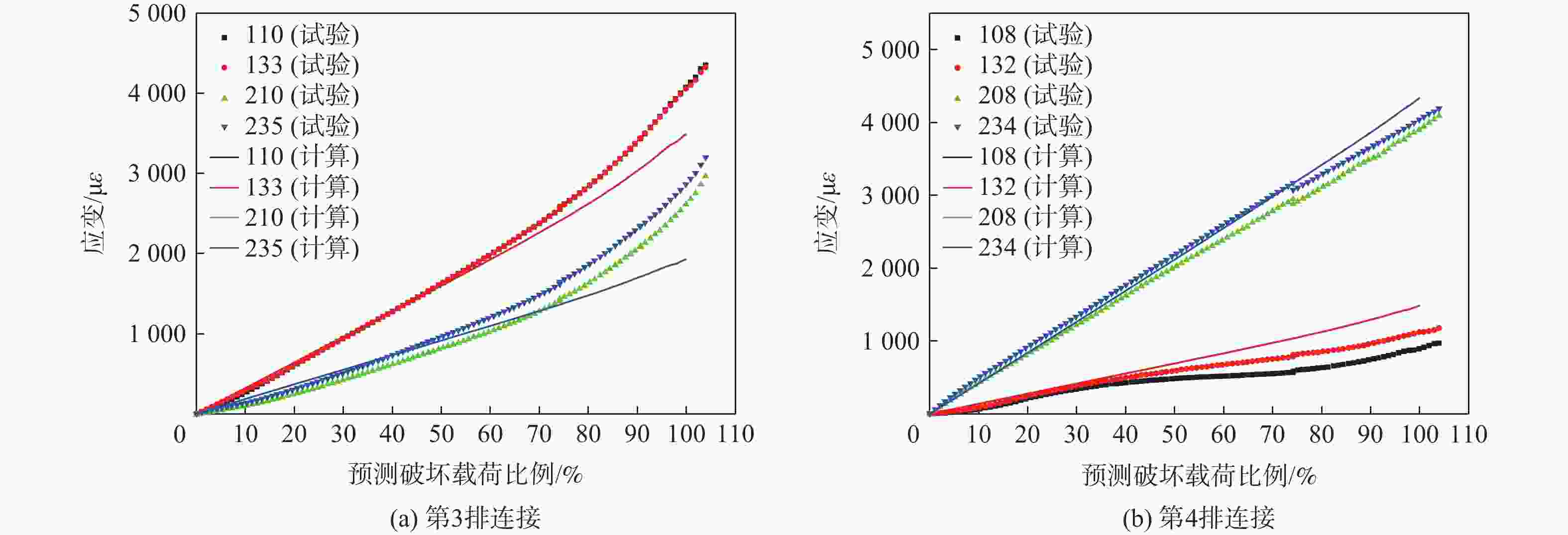 以民机复合材料机翼翼根下壁板长桁对接结构为研究对象,通过建立单钉连接三维子模型并考虑材料损伤,分析连接失效机理及非线性载荷-变形关系;通过考虑非线性连接刚度的整体有限元模型,计算试验件非线性钉载分配,并预测破坏载荷。解决了直接建立全尺寸三维模型、考虑损伤等引起的计算效率低、收敛性差等问题。试验结果表明:预测破坏载荷为试验破坏载荷的93.6%,预测破坏模式为单侧多排紧固件同时剪切断裂,与试验破坏模式一致,验证了所提方法的有效性。相比之下,采用线性连接刚度模型预测的破坏载荷为试验破坏载荷的81.9%,预测失效模式为第1排紧固件断裂,预测破坏载荷、预测破坏模式均与试验结果存在较大差异。