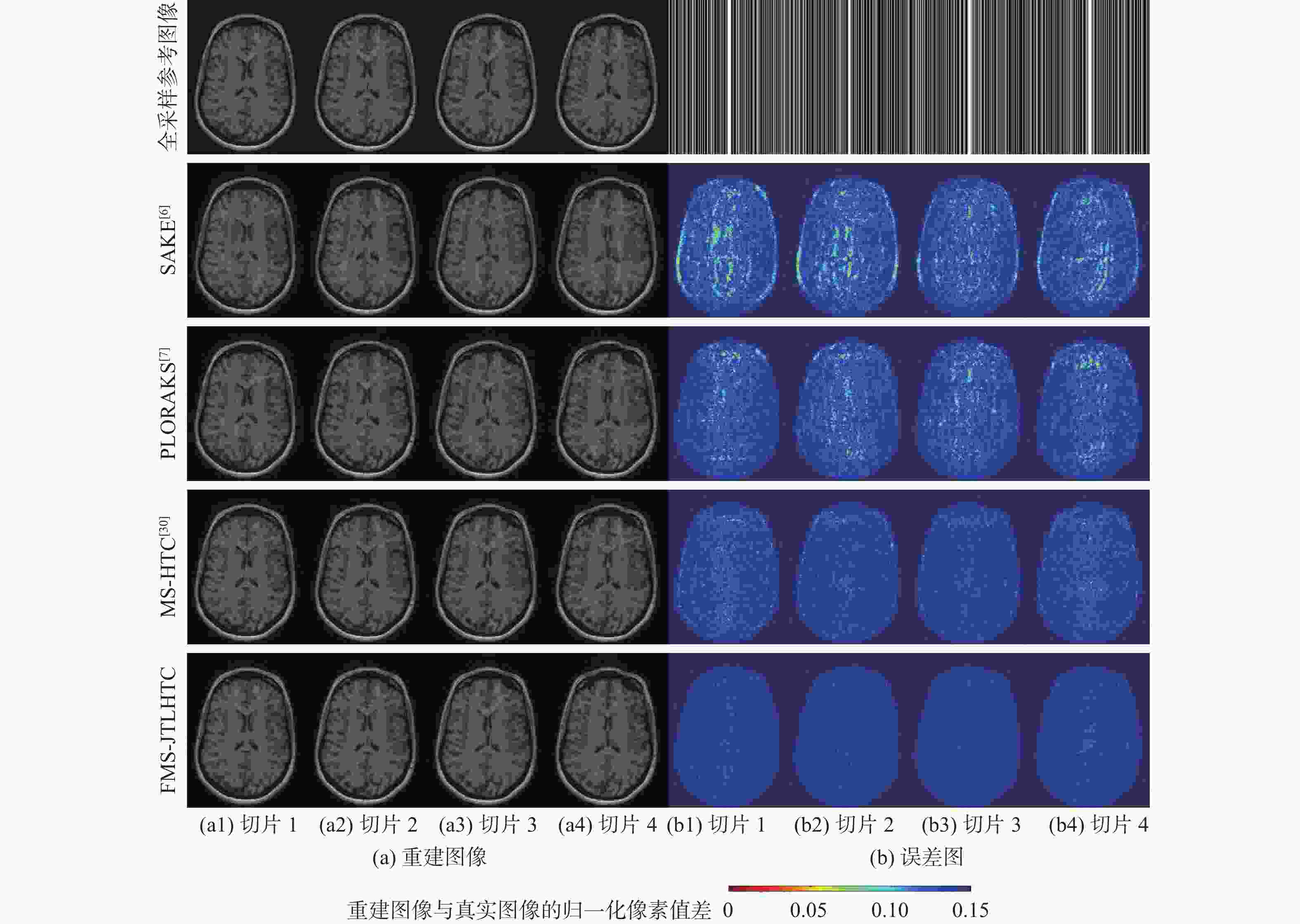 算法 AF PSNR /dB MSSIM FSIM HFEN SAKE[6] 3 37.89 0.9571 0.9996 0.0664 5 35.36 0.9326 0.9990 0.0980 8 33.48 0.9148 0.9984 0.1361 10 32.67 0.9068 0.9979 0.1609 12 32.09 0.8977 0.9974 0.1797 PLORAKS[7] 3 37.86 0.9537 0.9996 0.0657 5 35.55 0.9354 0.9991 0.0966 8 33.65 0.9168 0.9984 0.1354 10 32.83 0.9059 0.9979 0.1549 12 32.24 0.8987 0.9975 0.1730 MS-HTC[30] 3 38.55 0.9626 0.9997 0.0591 5 35.98 0.9435 0.9992 0.0850 8 34.21 0.9263 0.9987 0.1144 10 33.26 0.9136 0.9981 0.1343 12 32.92 0.9115 0.9979 0.1458 FMS-JTLHTC 3 39.99 0.9738 0.9997 0.0529 5 37.58 0.9619 0.9995 0.0722 8 35.76 0.9497 0.9992 0.0951 10 34.94 0.9435 0.9989 0.1094 12 34.34 0.9383 0.9988 0.1203 表 3 4种算法对AF=3的1D-Possion欠采样模式下数据集dataset 1重建的评价指标值