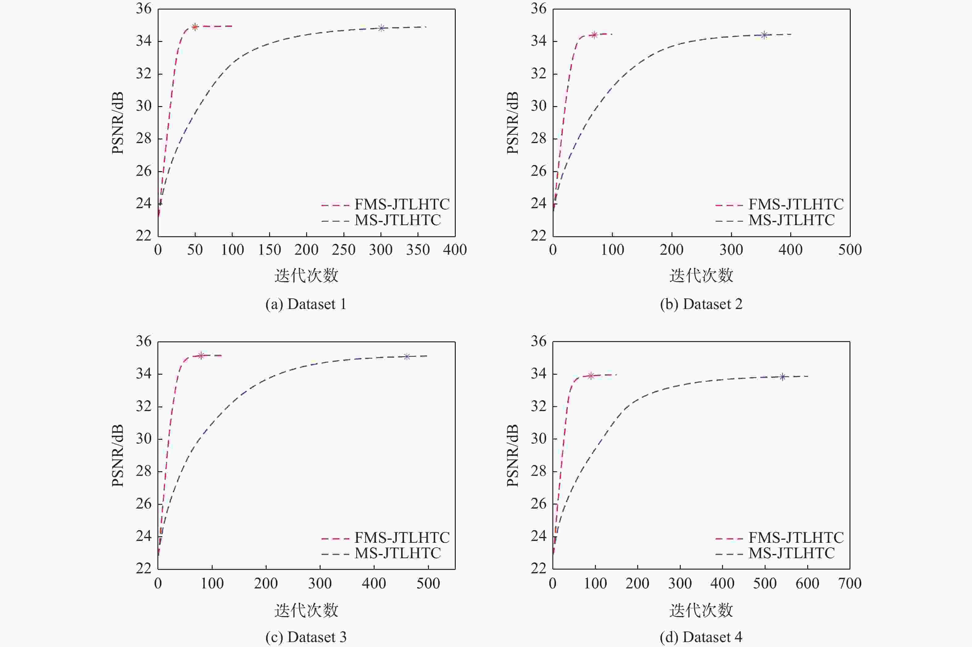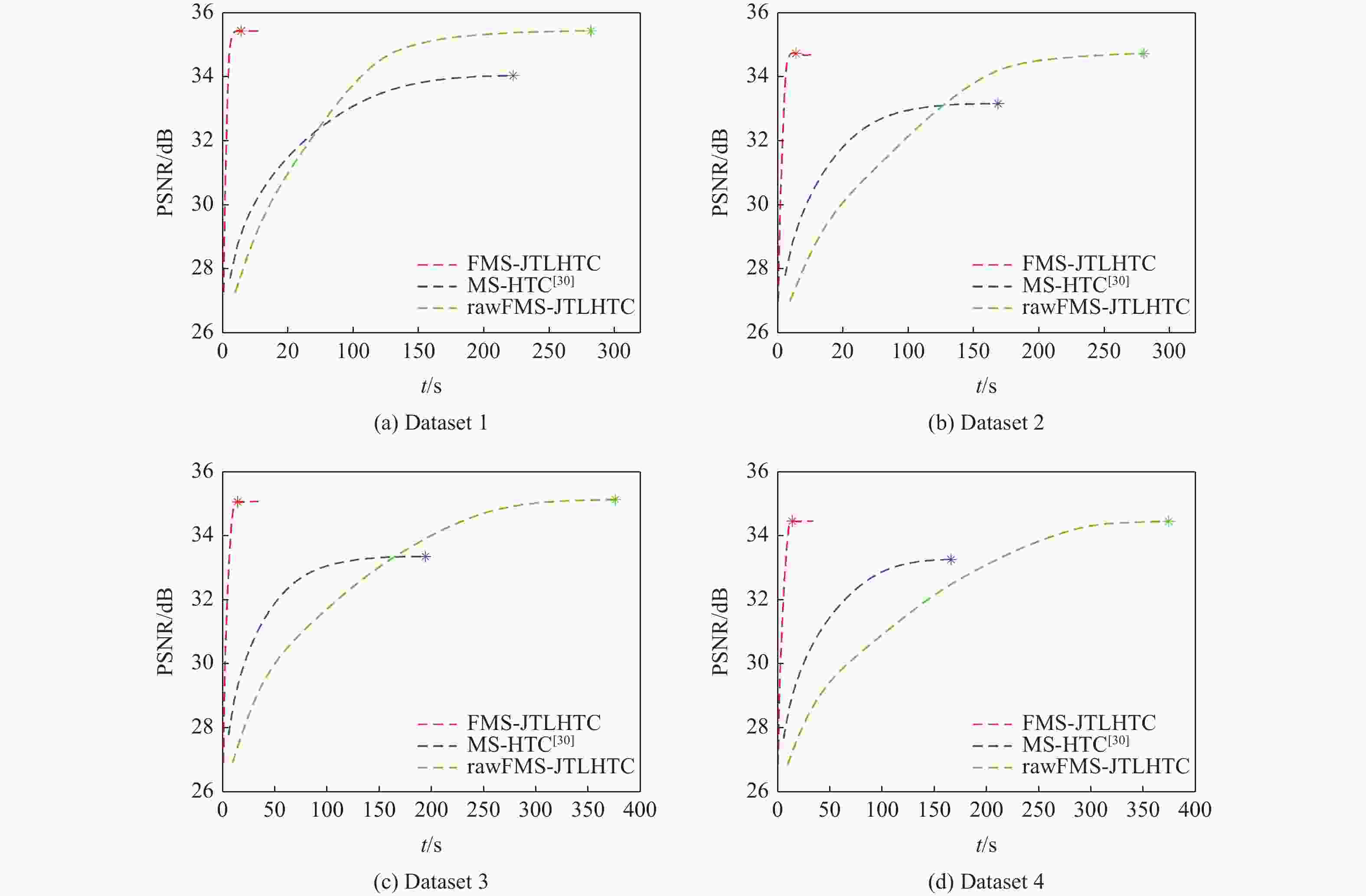 算法 t/s 速度提升倍数 Dataset 1 Dataset 2 Dataset 3 Dataset 4 Dataset 1 Dataset 2 Dataset 3 Dataset 4 SAKE[6] 779.35 779.50 779.39 779.17 44.82 36.79 32.14 23.62 PLORAKS[7] 570.30 517.17 578.35 777.84 32.79 24.41 23.85 23.58 MS-HTC[30] 272.46 271.92 271.43 275.41 15.67 12.83 11.19 8.35 rawFMS-JTLHTC 456.81 550.35 624.76 860.09 26.27 25.97 25.76 26.07 FMS-JTLHTC 17.39 21.19 24.25 32.99 1.00 1.00 1.00 1.00 表 5 5种算法对AF=10的2D-VRDU采样模式下四个数据集的重建时间与速度