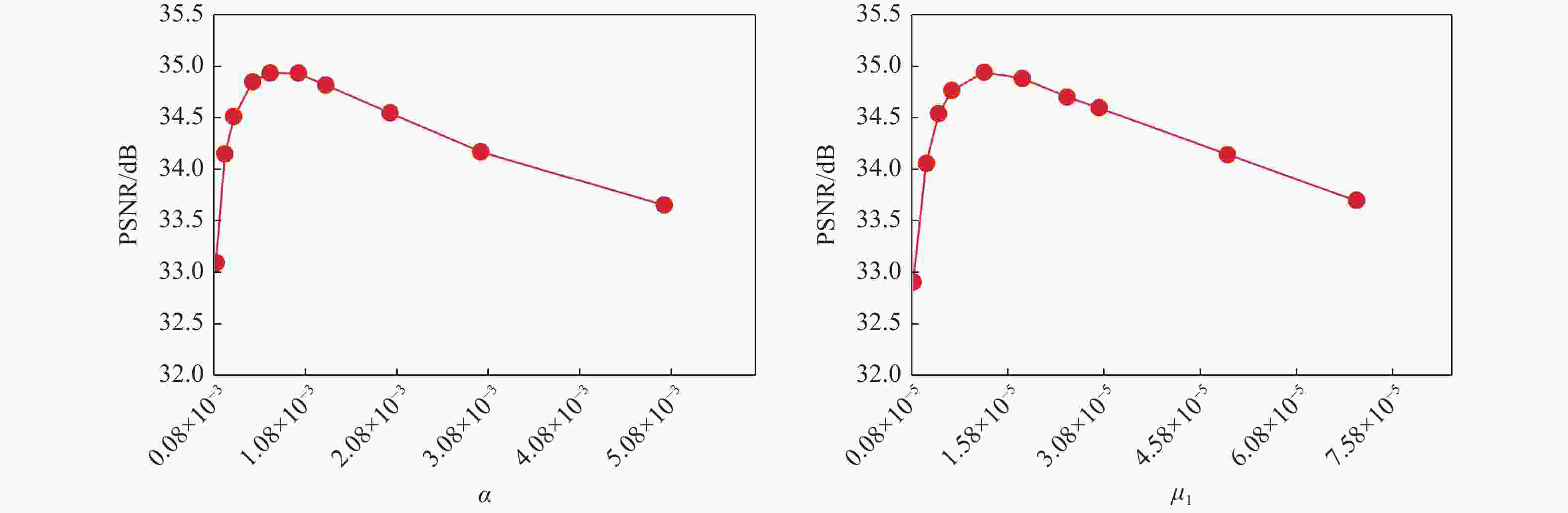 图 7 FMS-JTLHTC算法对5倍加速的1D-VRDU采样模式下dataset 1重建时参数$\alpha $和$ {\mu _1} $的变化对重构图像PSNR值的影响