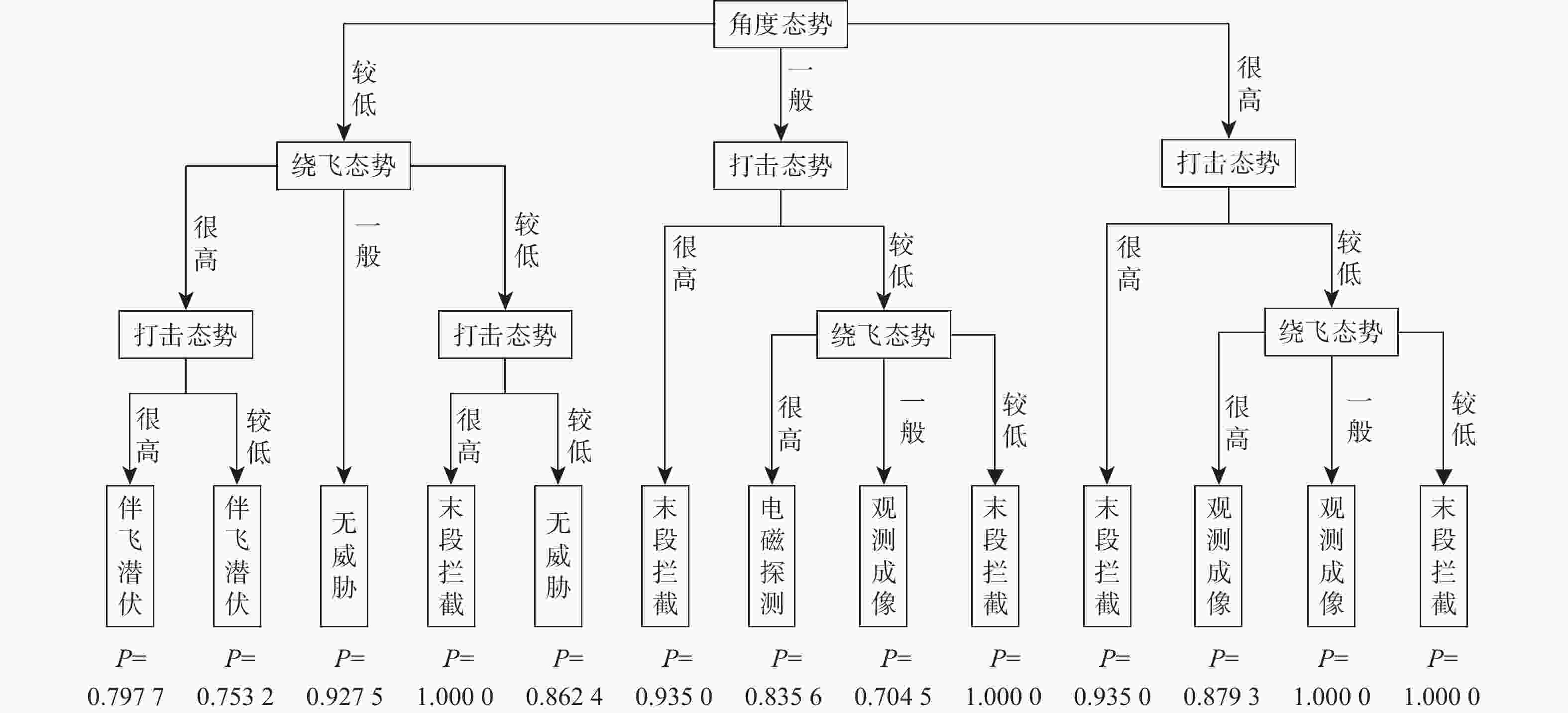意图标签 数量 电磁探测 30 观测成像 30 伴飞潜伏 30 末段拦截 30 无威胁 30 表 3 各态势属性聚类中心点