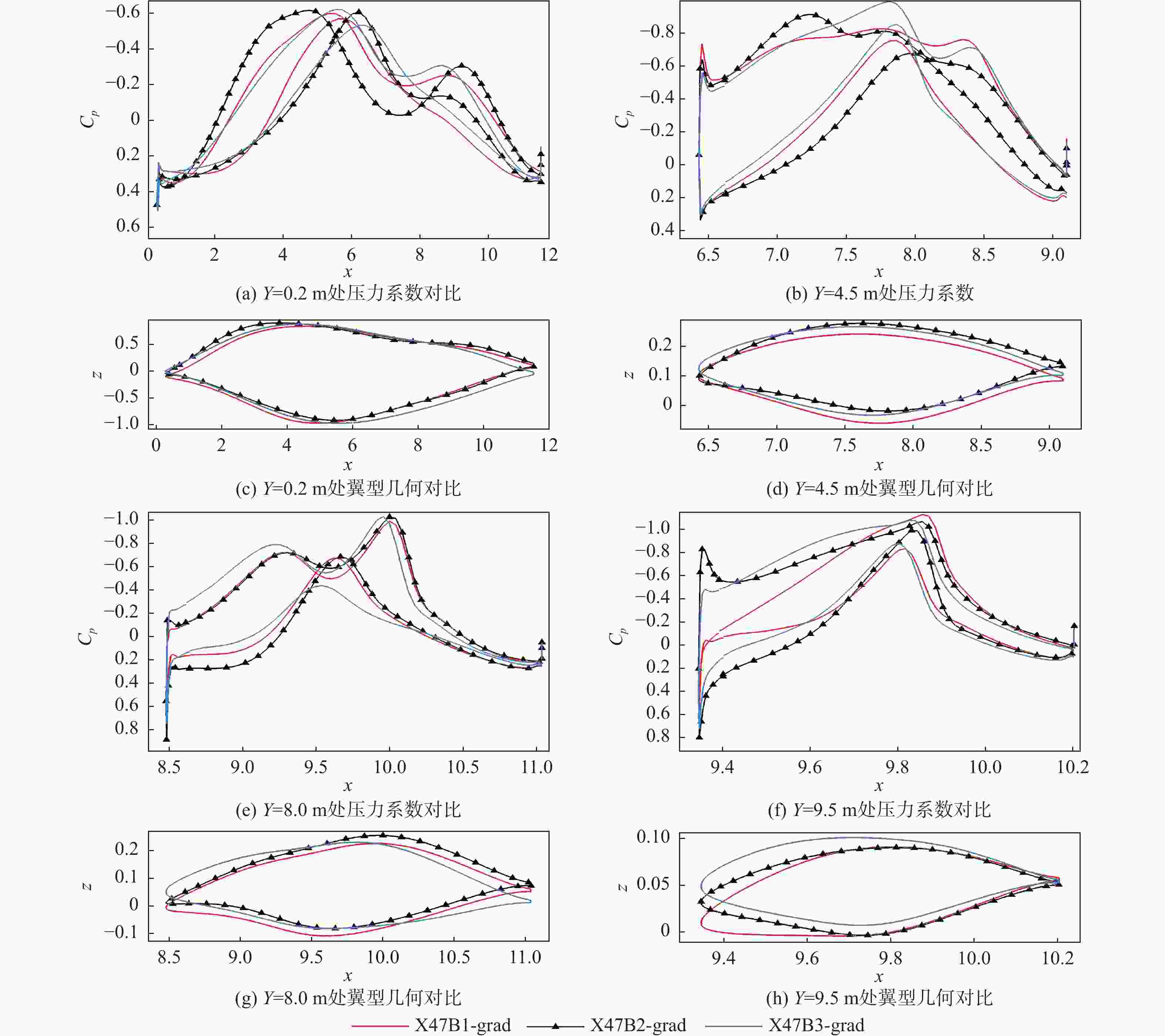外形 CD CM ${\sigma _{{\mathrm{ave}}}} $/m2 X47B基础外形 0.019665 − 0.026167 3.79510 AS128-Bezier 0.015582 − 0.040593 0.54040 X47B1 0.018425 − 0.005038 0.44884 X47B2 0.019638 − 0.004940 0.31827 X47B3 0.018707 − 0.001002 0.43848 X47B1-grad 0.014269 − 0.060529 0.05901 X47B2-grad 0.014436 − 0.029866 0.05864 X47B3-grad 0.014214 − 0.047756 0.10260 -