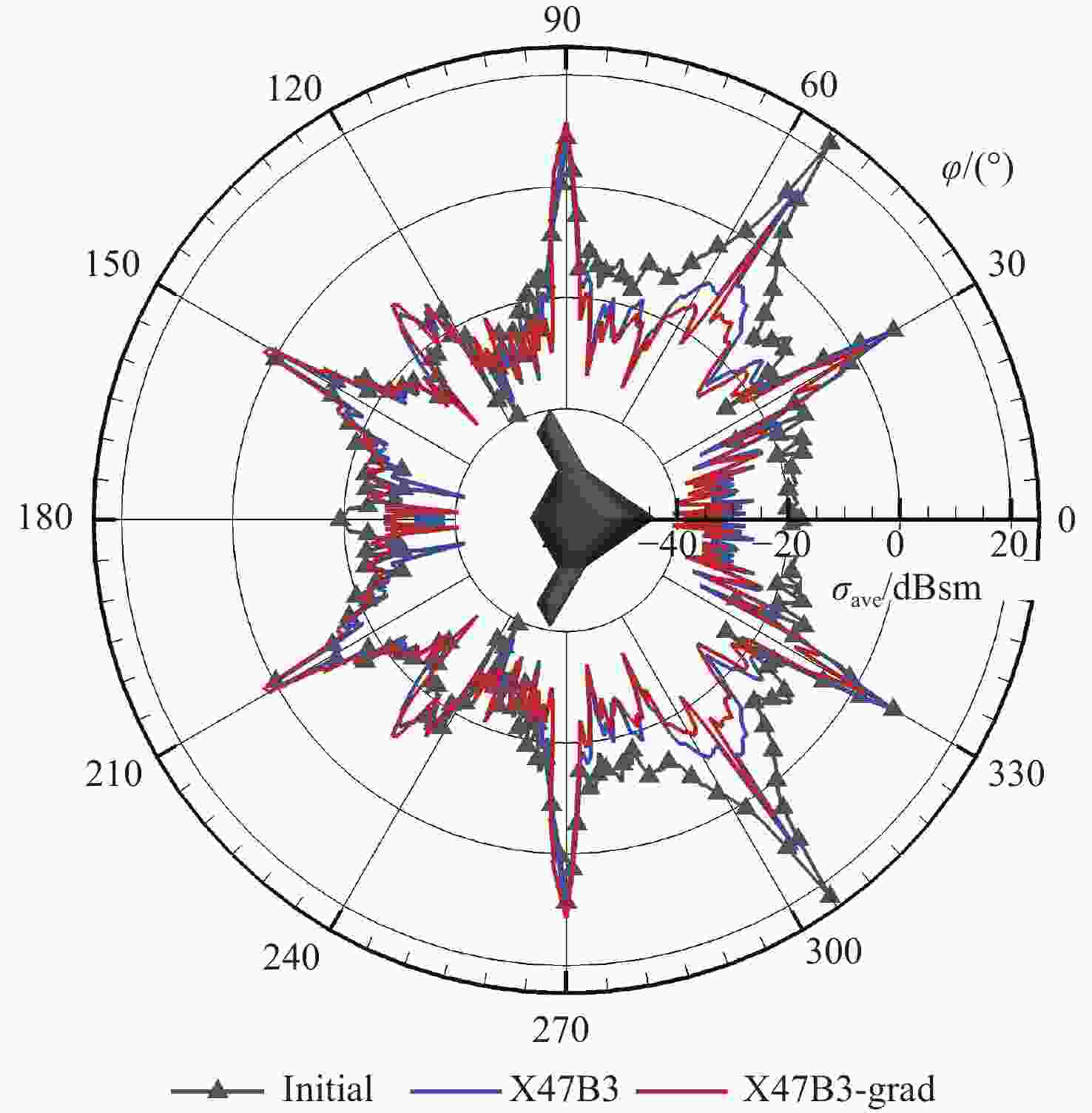 结果编号 CD ${\sigma _{{\mathrm{ave}}}} $/m tmax CM NACA65016 0.007758 0.045612 0.1600 − 0.0064 GlobalOpt1 0.007840 0.005006 0.1600 0.0500 GradOpt1 0.007837 0.003848 0.1601 0.0503 GlobalOpt2 0.007793 0.005540 0.1600 0.0500 GradOpt2 0.007793 0.005540 0.1600 0.0500 GlobalOpt3 0.007841 0.004855 0.1600 0.0500 GradOpt3 0.007840 0.004855 0.1600 0.0500 表 6 类X47B外形气动隐身优化结果