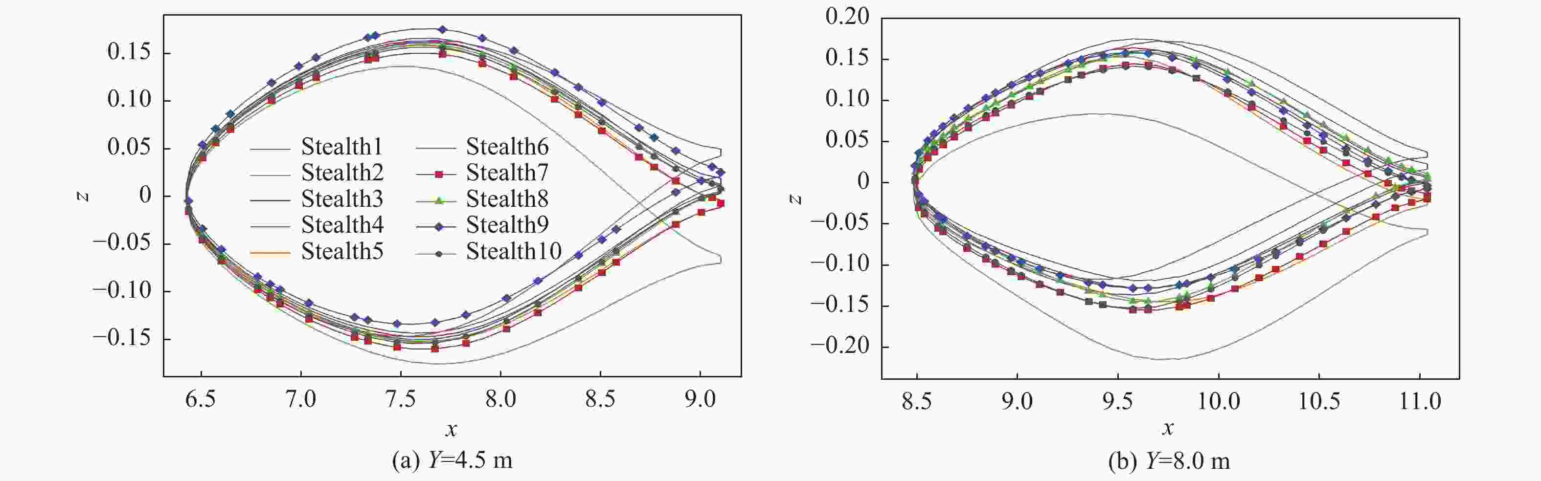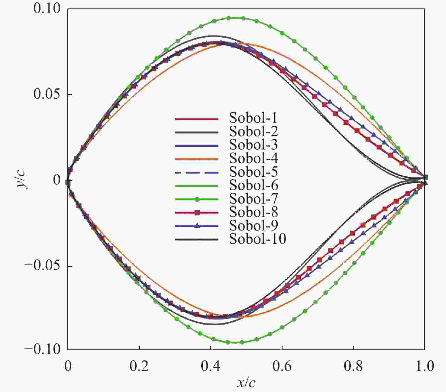结果编号 10lg(${\sigma _{{\mathrm{ave}}}} $)/m2 tmax NACA65016 13.410 0.0016 Sobol-1 −20.454 0.1618 Sobol-2 −20.715 0.1686 Sobol-3 −21.004 0.1607 Sobol-4 −20.892 0.1601 Sobol-5 −21.004 0.1607 Sobol-6 −20.828 0.1899 Sobol-7 −20.828 0.1899 Sobol-8 −20.635 0.1600 Sobol-9 −21.005 0.1606 Sobol-10 −19.383 0.1600 注:相同颜色认为属于同一峰值。 表 2 Multi-start初始外形RCS和优化外形RCS